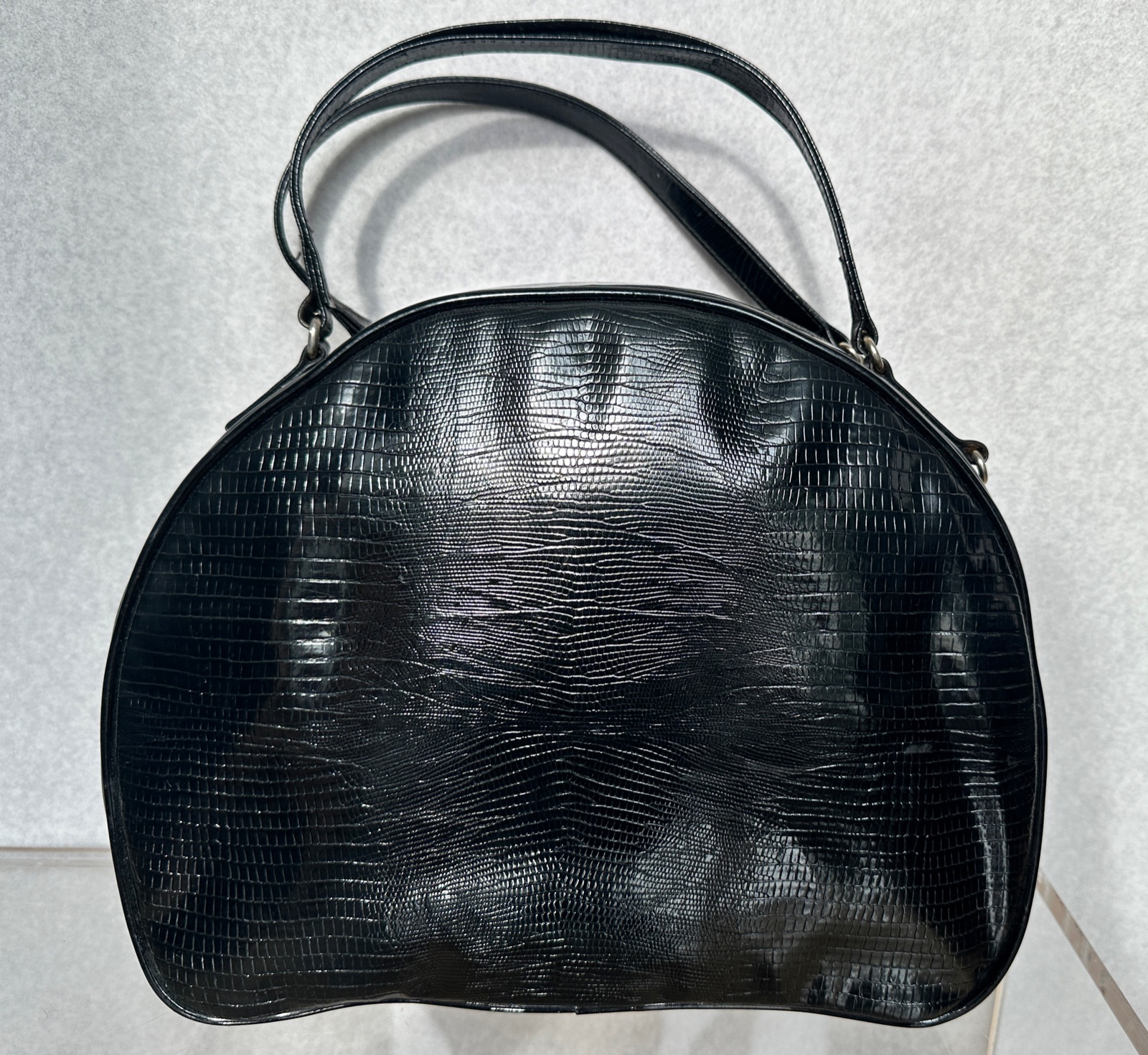 Elegantná kabelka v kvalitnej lakovanej eko-koži s textúrou krokodílej kože. Vrchný lem a dno kabelky sú v hladkej lakovanej koži. Zatváranie na obosmerný zips. Vo vnútri je ploché zipsové vrecko. Kabelka má úchyty na ďalší remienok (nie je k dispozícii ku kabelke).