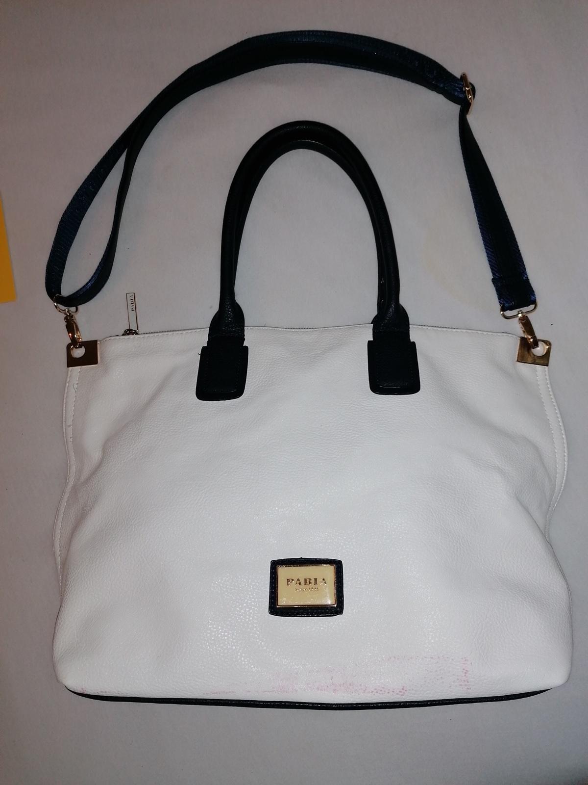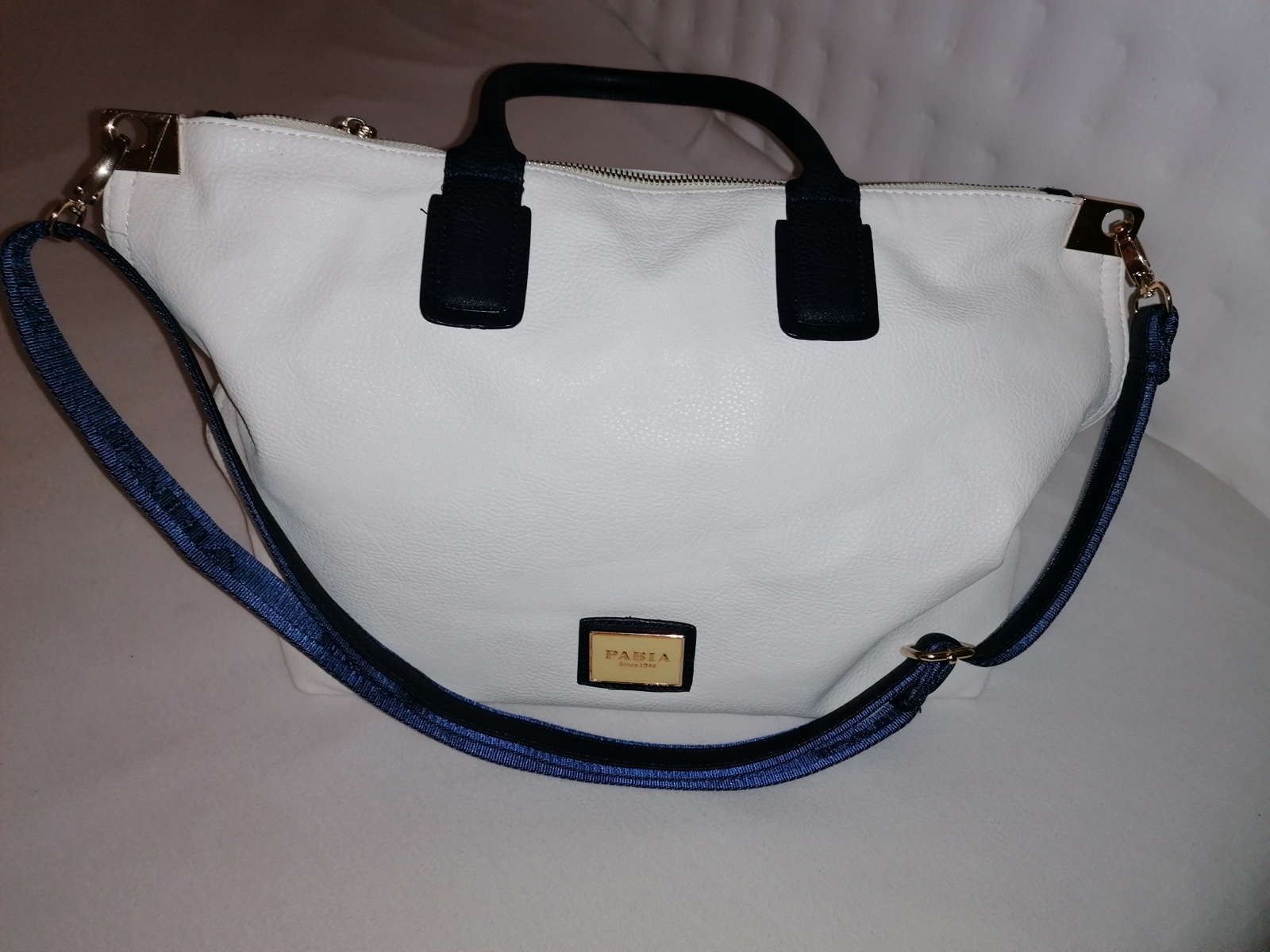 farba: jedna strana biela, druhá čierna so strieborným kovaním odopínateľný dĺžkovo nastaviteľný dlhý popruh + uško do ruky veľmi štýlový kúsok priemer kruhu 20 cm, hrúbka 9 cm materiál: neprav...