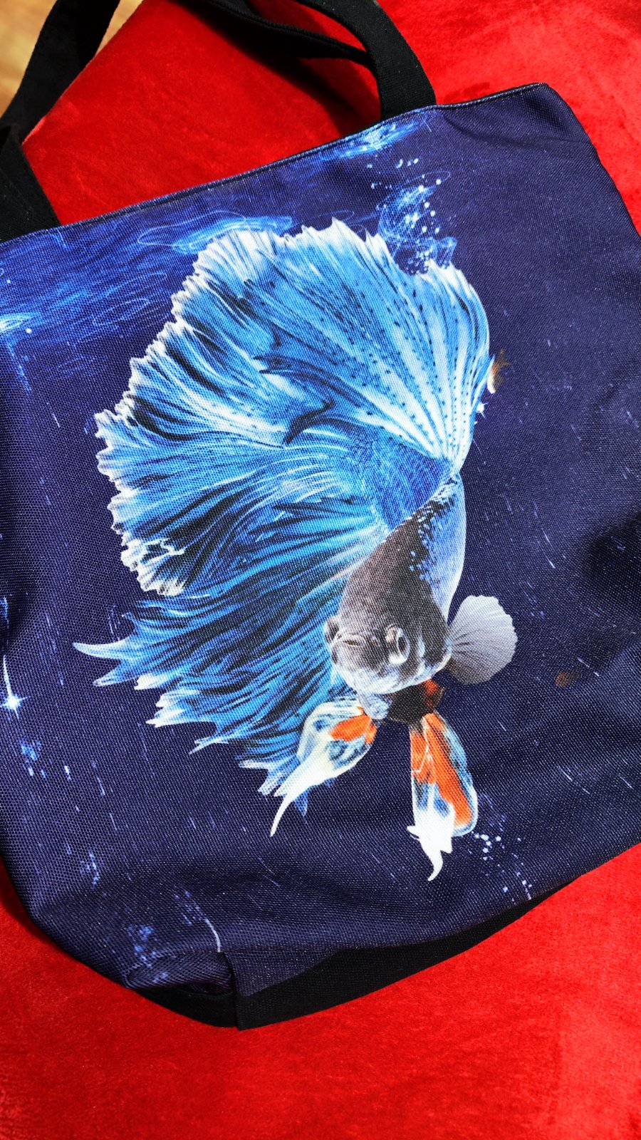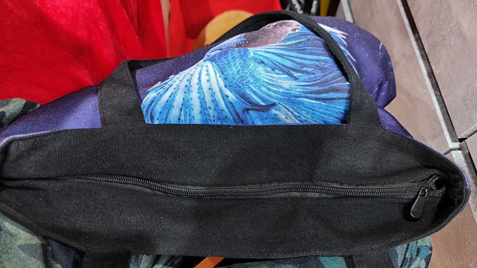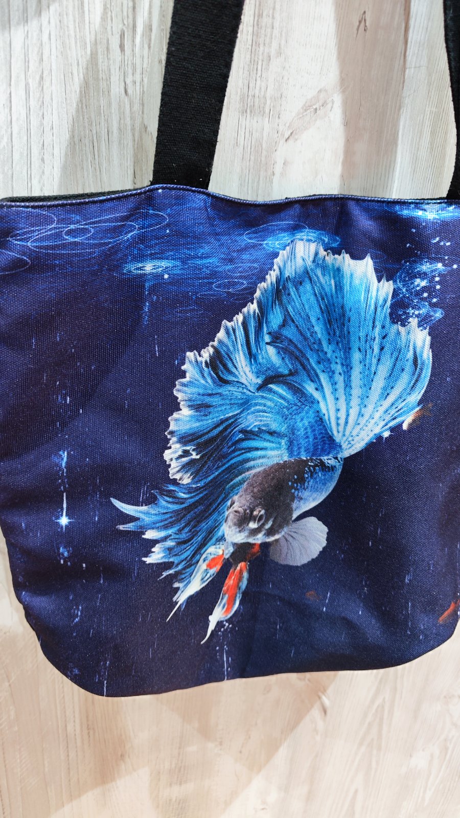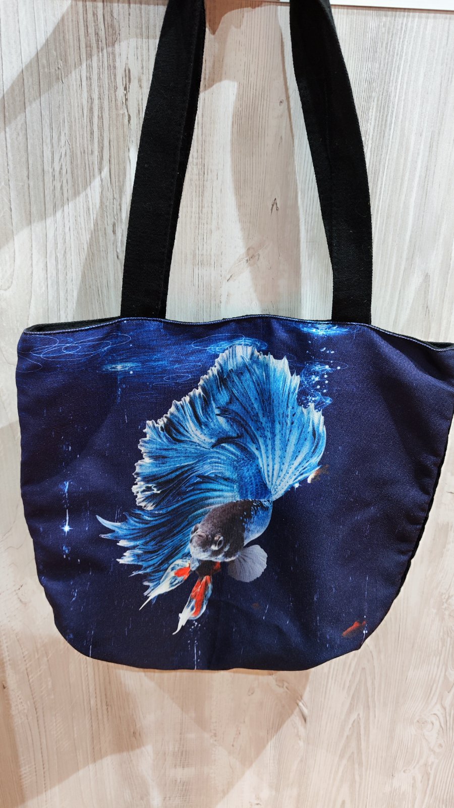 Dámska taška / kabelka s rybou, zatvára sa na zips. Rozmery 40 x 36 cm. Zozadu má ešte jedno vrecko na zips.