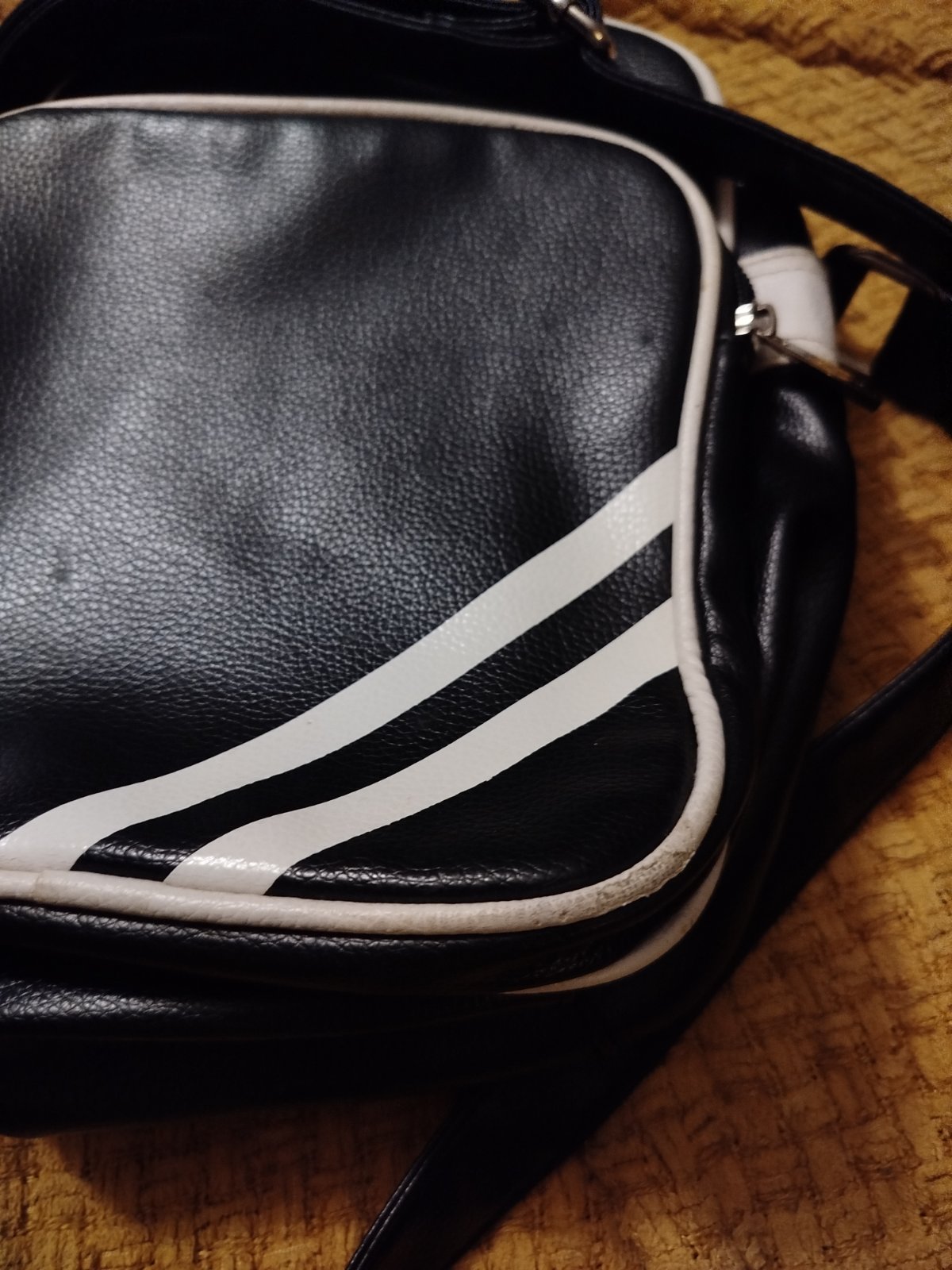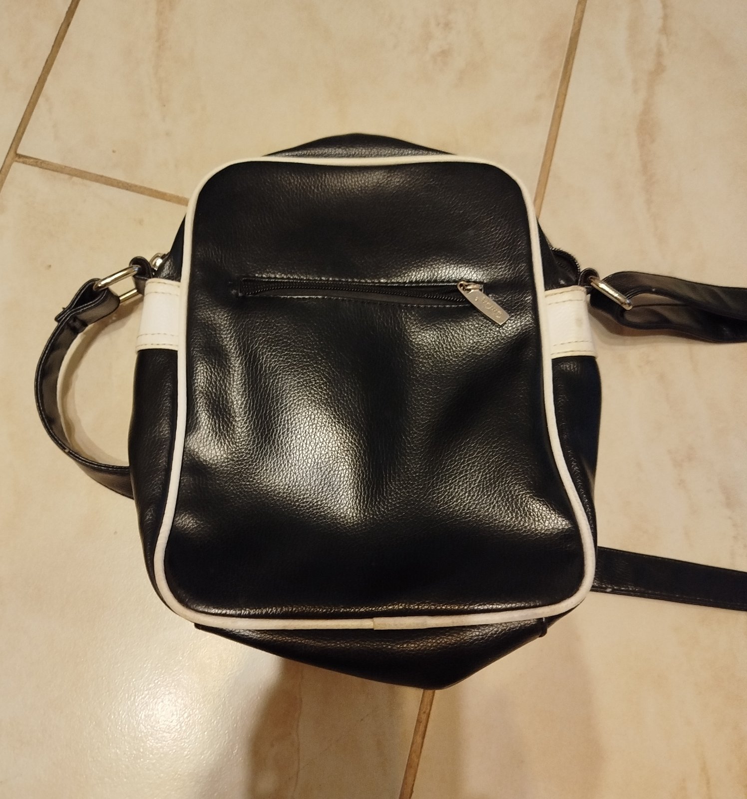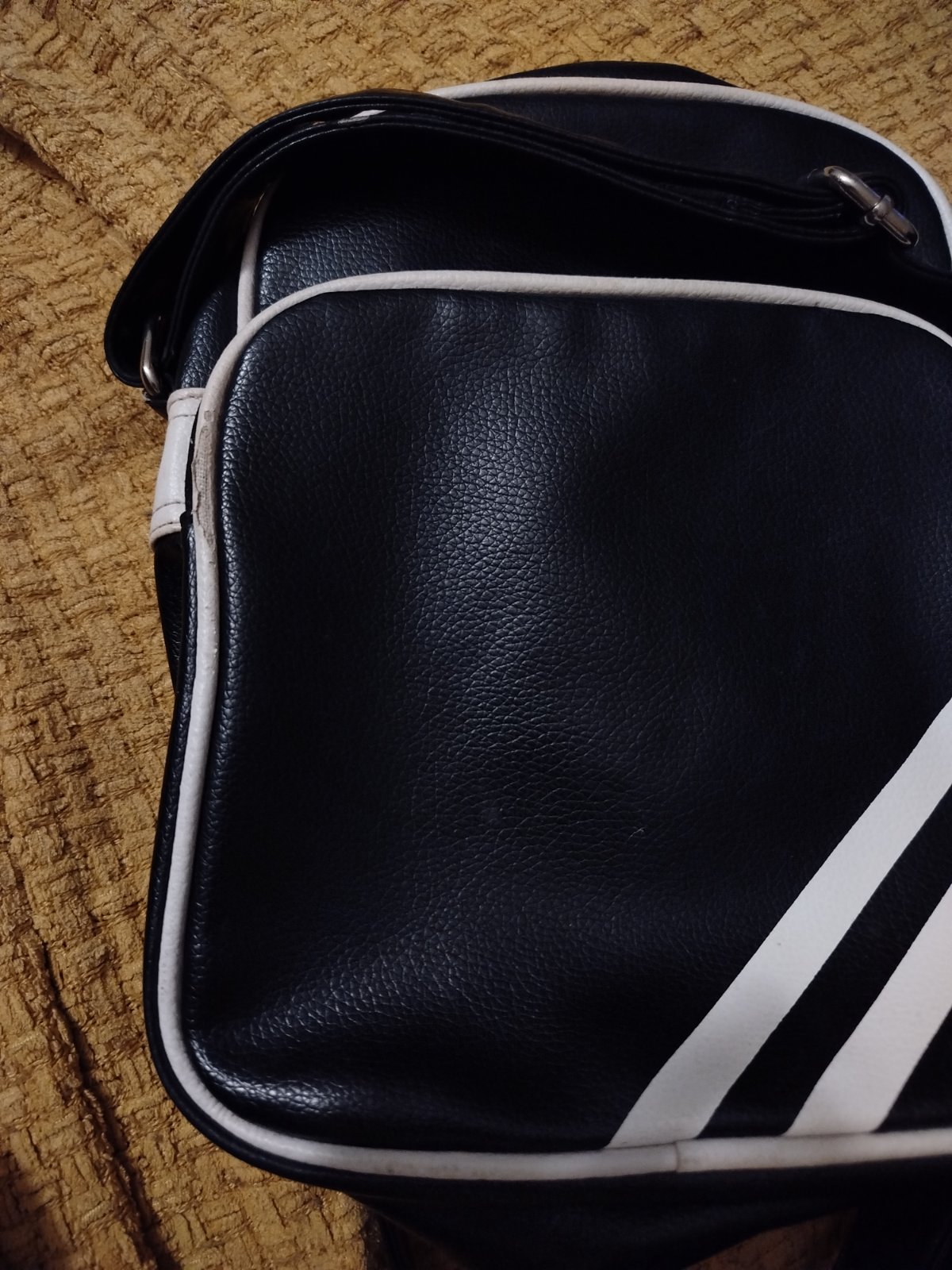 Koženková kapsa/taška s remienkom cez plece,ktorý sa dá uťahovať. Dve zipsovacie úložné komory. Zo zadu je tiež zips. Drobná chybička vpredu na dvoch miestach olúpaná biela koženka (viď posledné 2 foto- naľavo hore a napravo dole).
