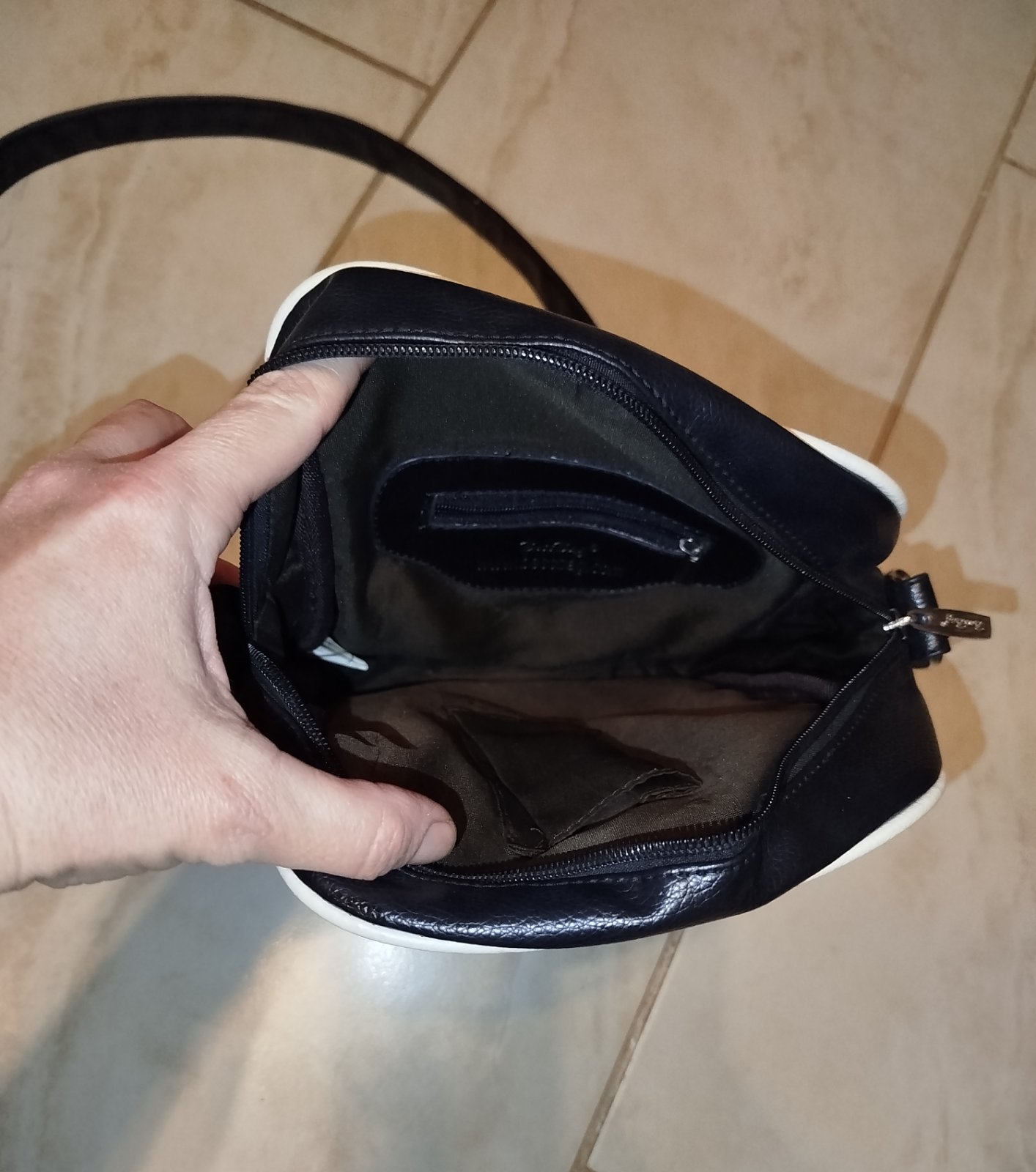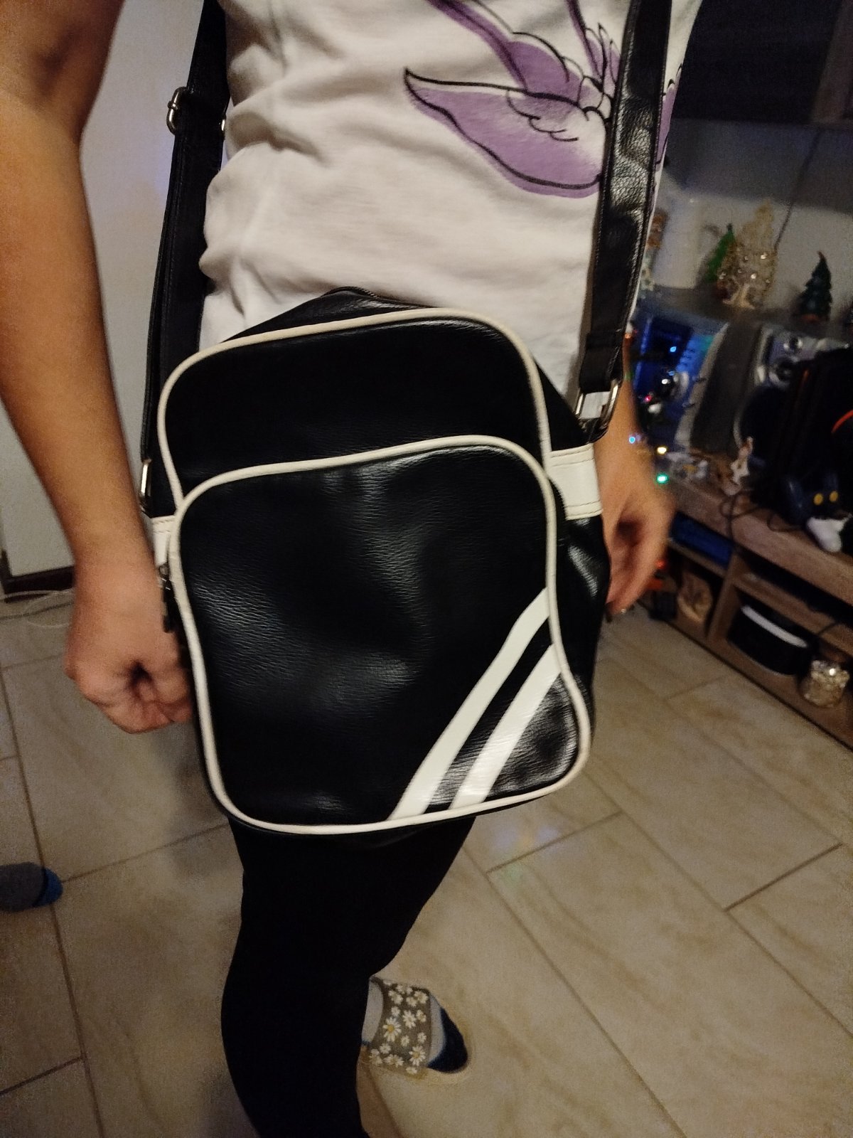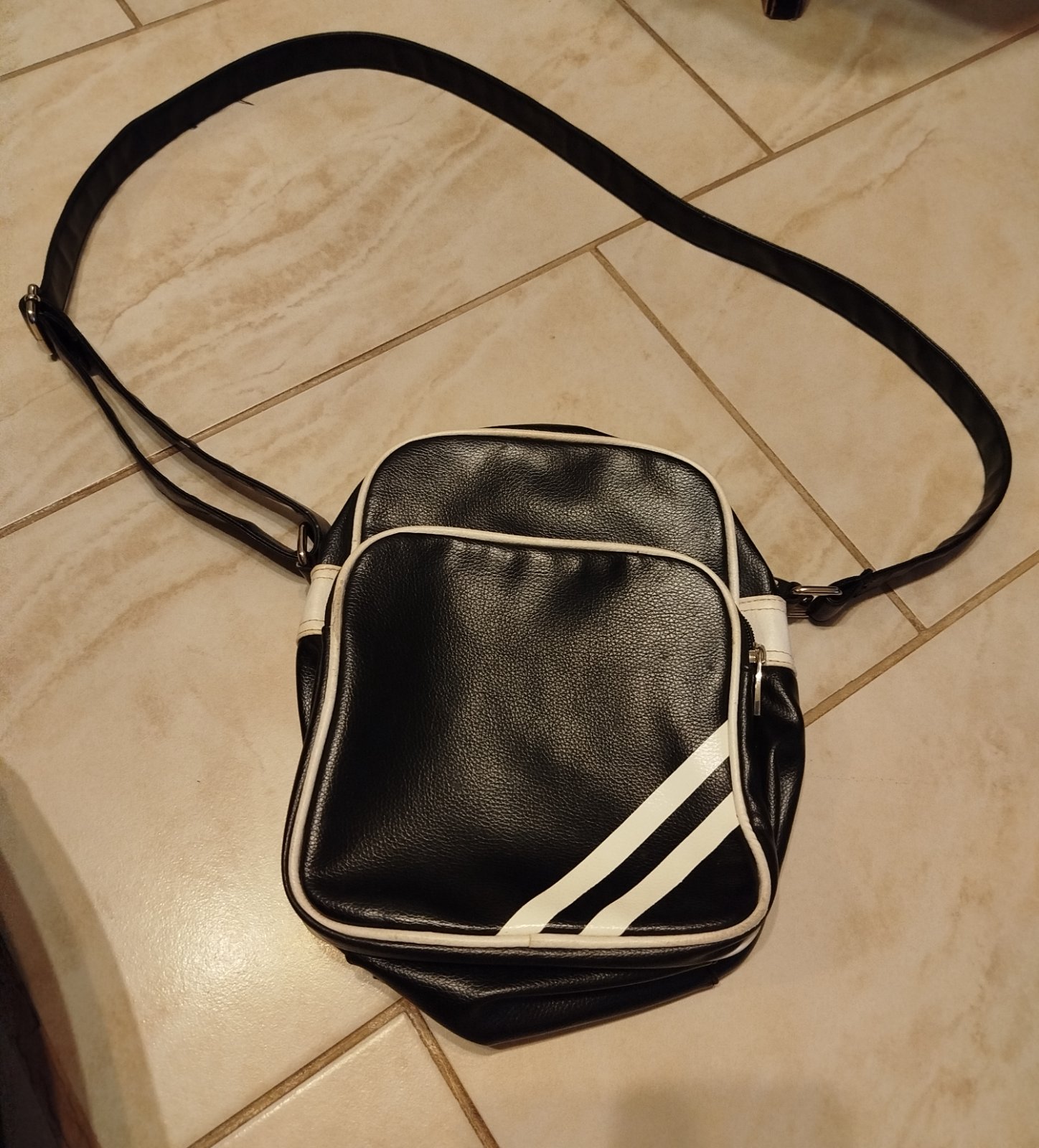 Koženková kapsa/taška s remienkom cez plece,ktorý sa dá uťahovať. Dve zipsovacie úložné komory. Zo zadu je tiež zips. Drobná chybička vpredu na dvoch miestach olúpaná biela koženka (viď posledné 2 foto- naľavo hore a napravo dole).