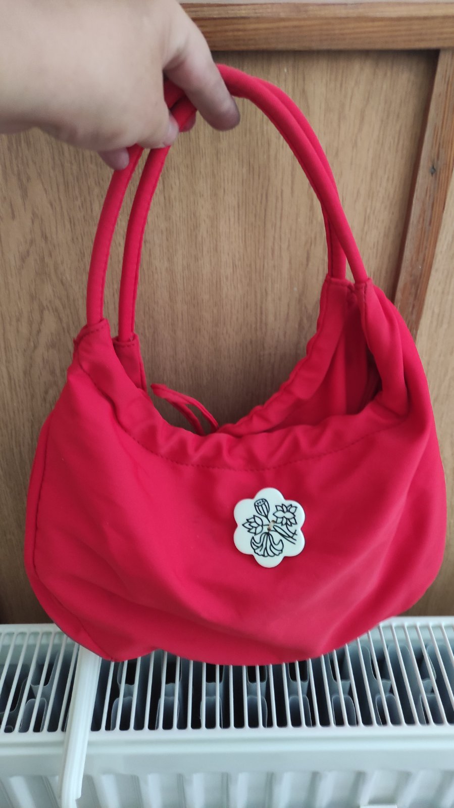 Dá sa nosiť v ruke ale má aj popruh na plece. Lakovaná, krásna červená. S cenovku na 139€.