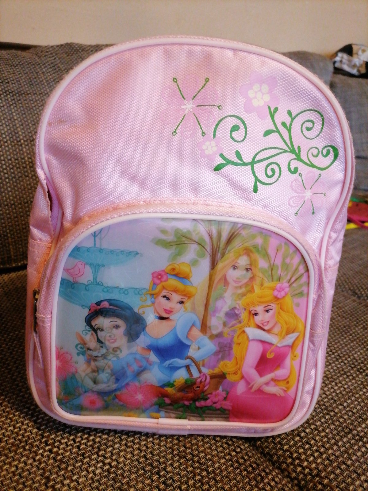 Predám ruksáčik s princeznami zn. Disney. Zapínanie na funkčný zips. Na spodku ruksáčika dr drobné fliačiky asi od ovocia - obr.1 dolu. Predná strana lesklá, umývateľná.