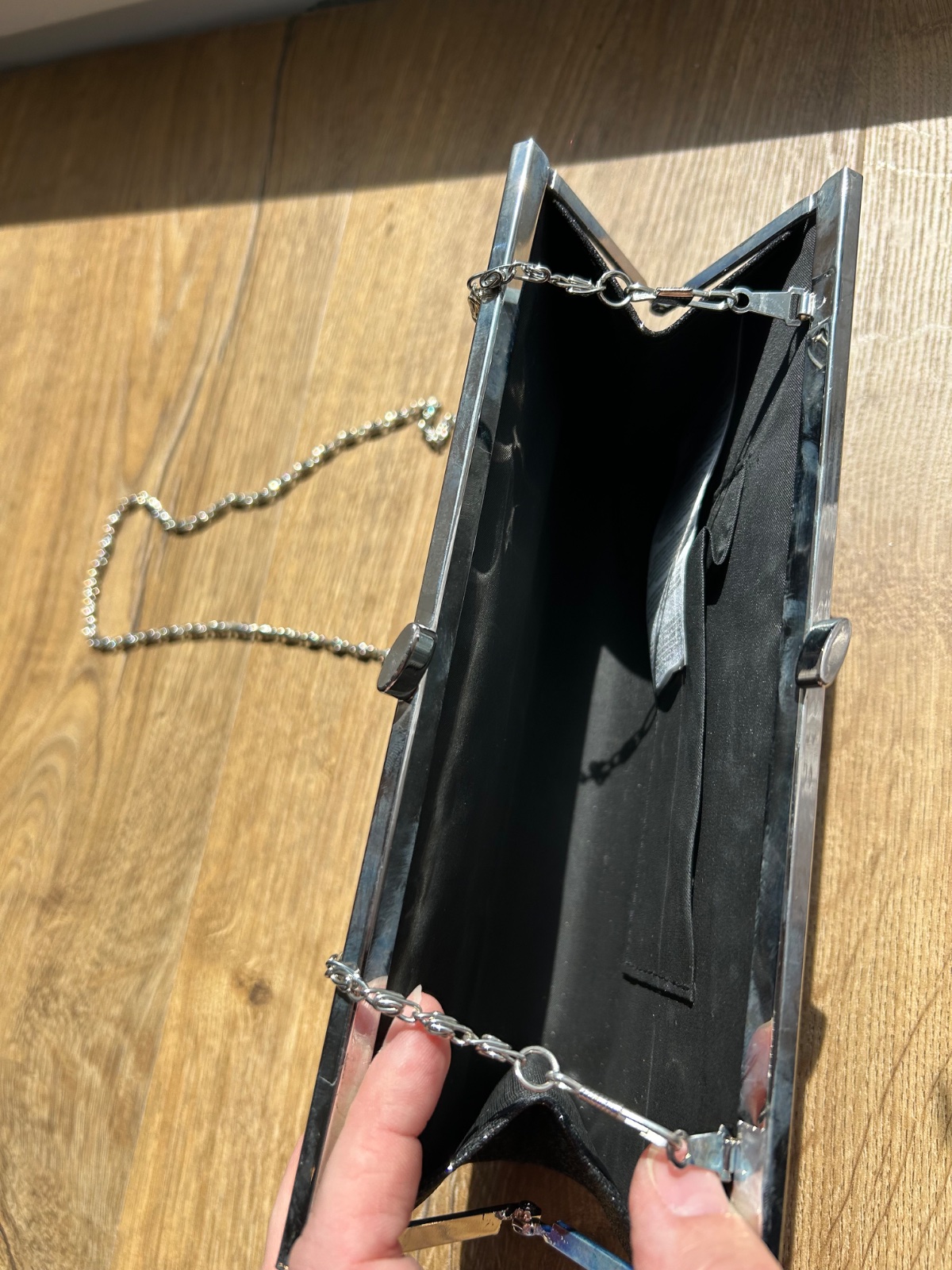 Krasna trblietava vecerna kabelka. Rozmer je cca 12 x 23 cm. Moze a nemusi mat strieborny popruh, da sa odstranit a nosit iba v ruke bez popruhu. Neposkodena, pouzita na 1 prilezitost.