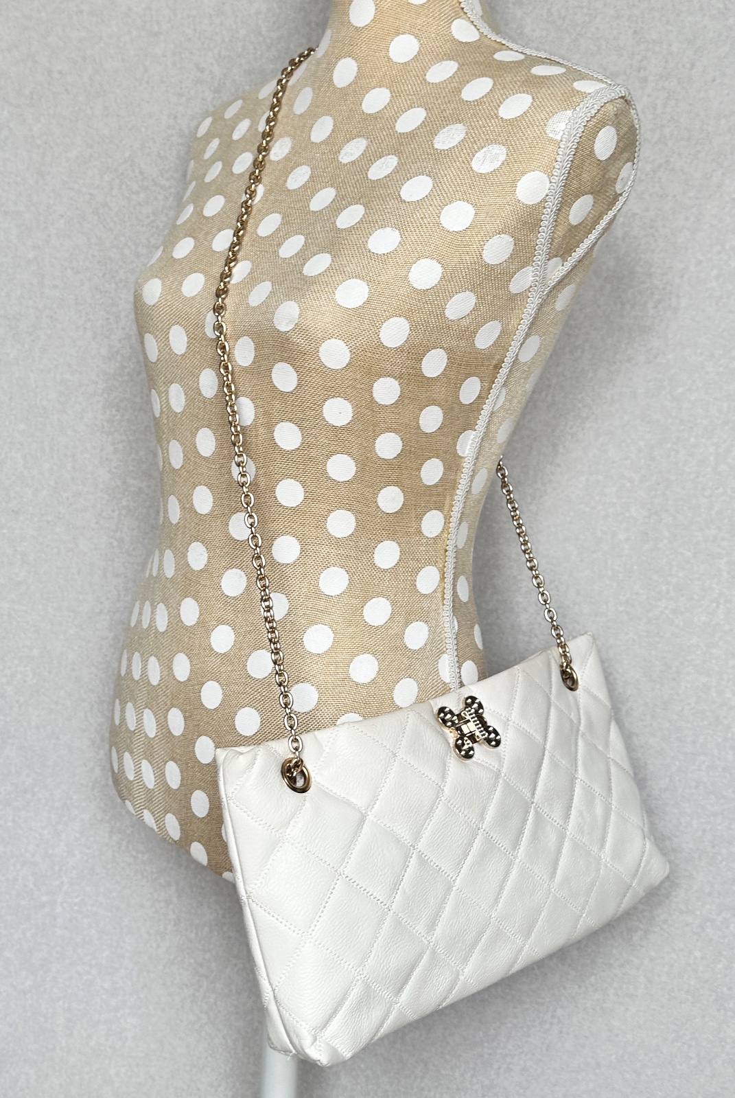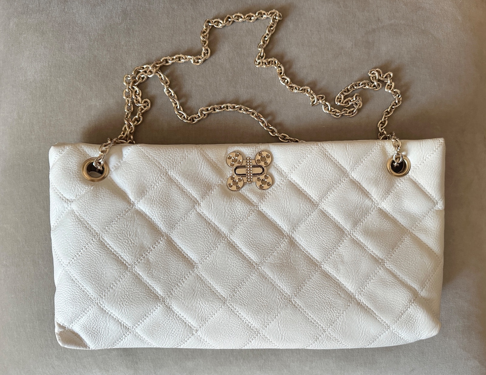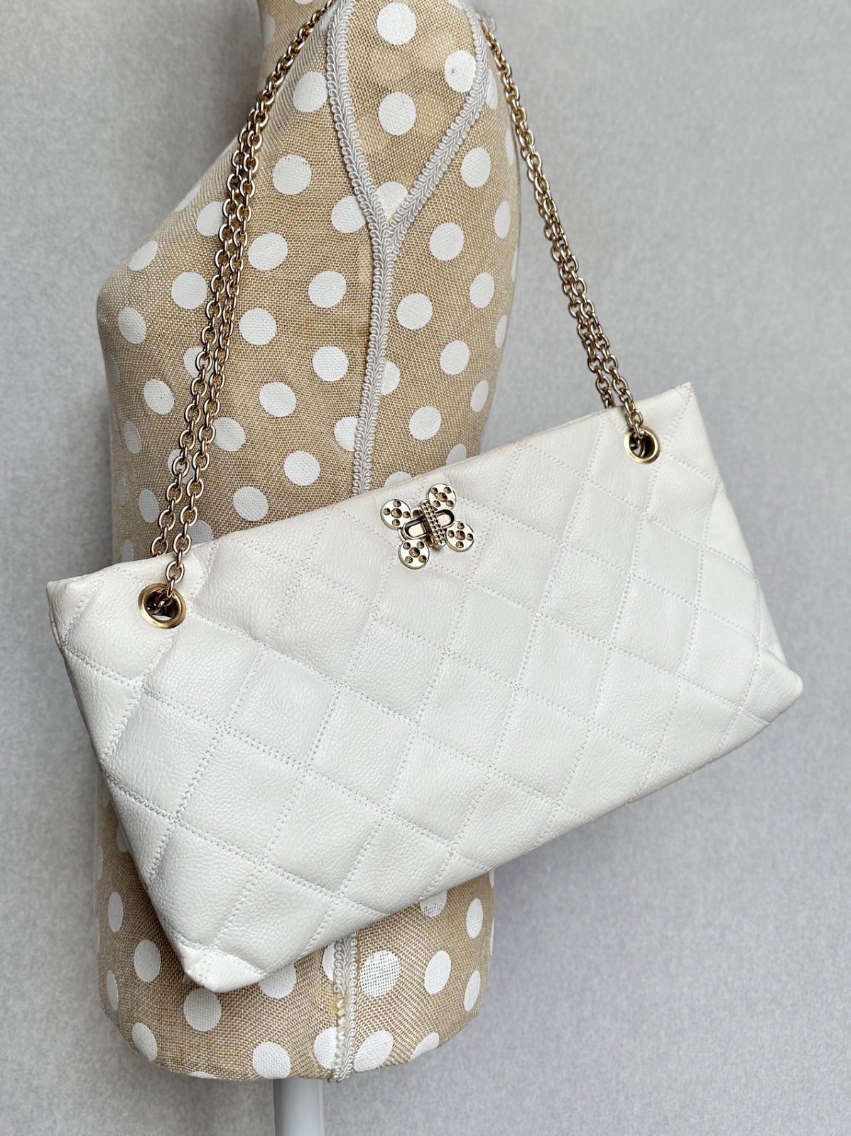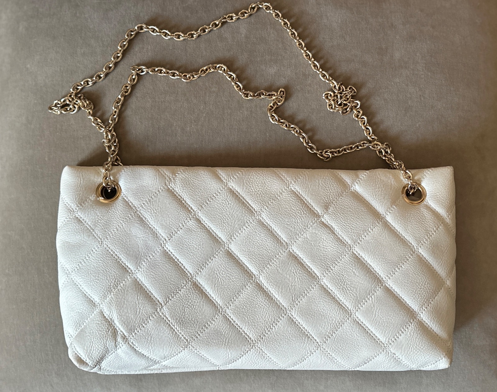 Prešívaná kabelka v elegantnej bielej v kombinácii so zlatými kovovými prvkami. Imitácia kože. Dá sa nosiť na rameno s dvojitou retiezkou alebo s predĺženou jednou retiazkou aj ako crossbody. Zapínanie na zips. Vo vnútri sú malé priečinky.