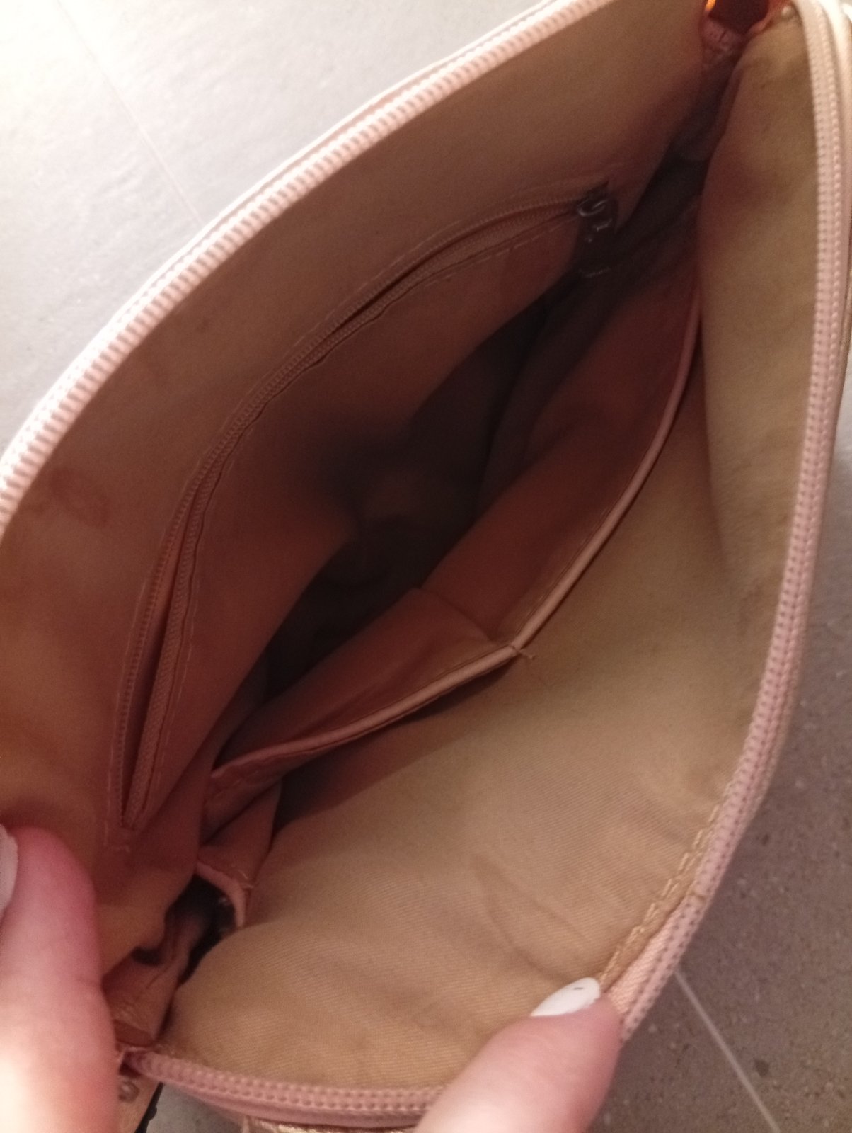 Takmer nenosená mäkkučká kabelka. Mala som ju sotva 3 krát. Kupovaná v Poľsku. Vyzerá ako nová. Má dve priehradky na zips. Šírka 41 cm, dĺžka kabelky bez úchytov 33 s úchytmi 51, hlbka 10 cm.
