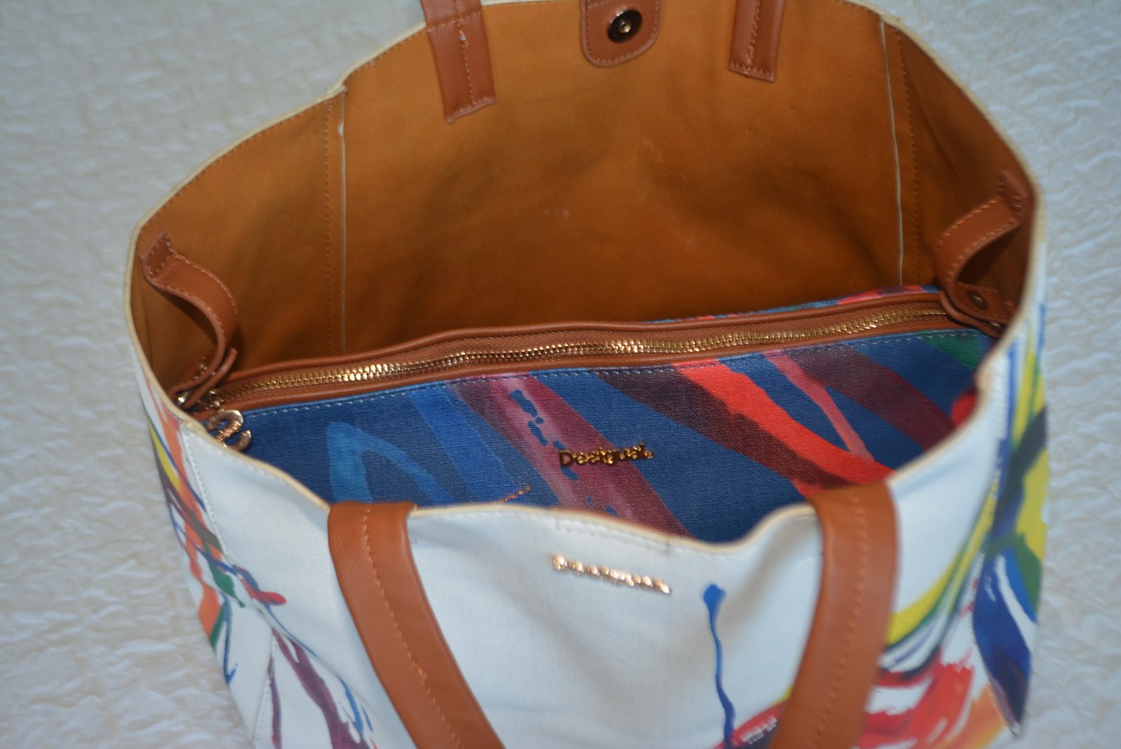 Táto súprava pozostáva z veľkej bielej nákupnej tašky (shopper bag) s farebnou abstraktnou potlačou a menšej modrej crossbody kabelky, ktorá sa dá nosiť samostatne alebo vložiť dovnútra väčšej tašky.