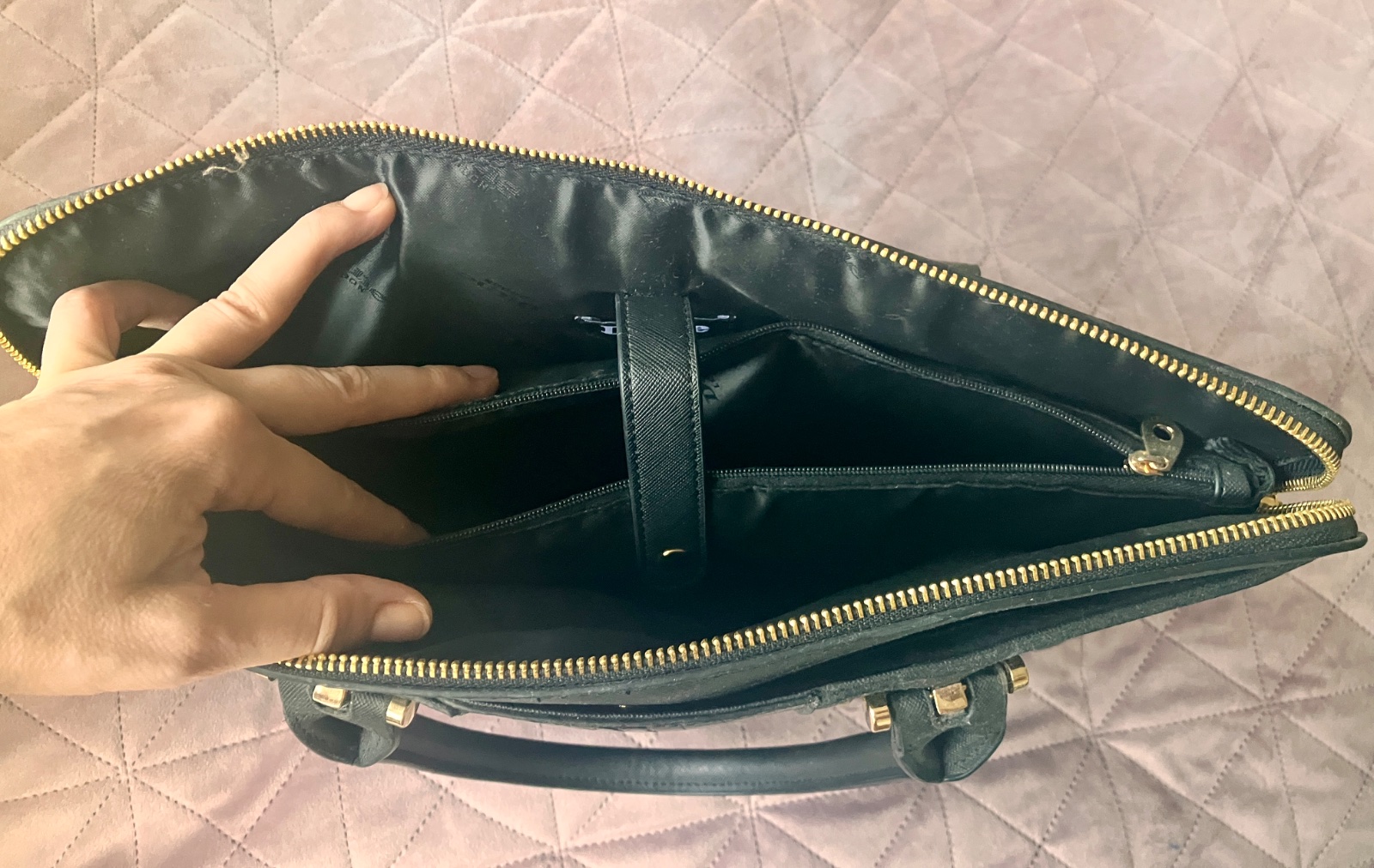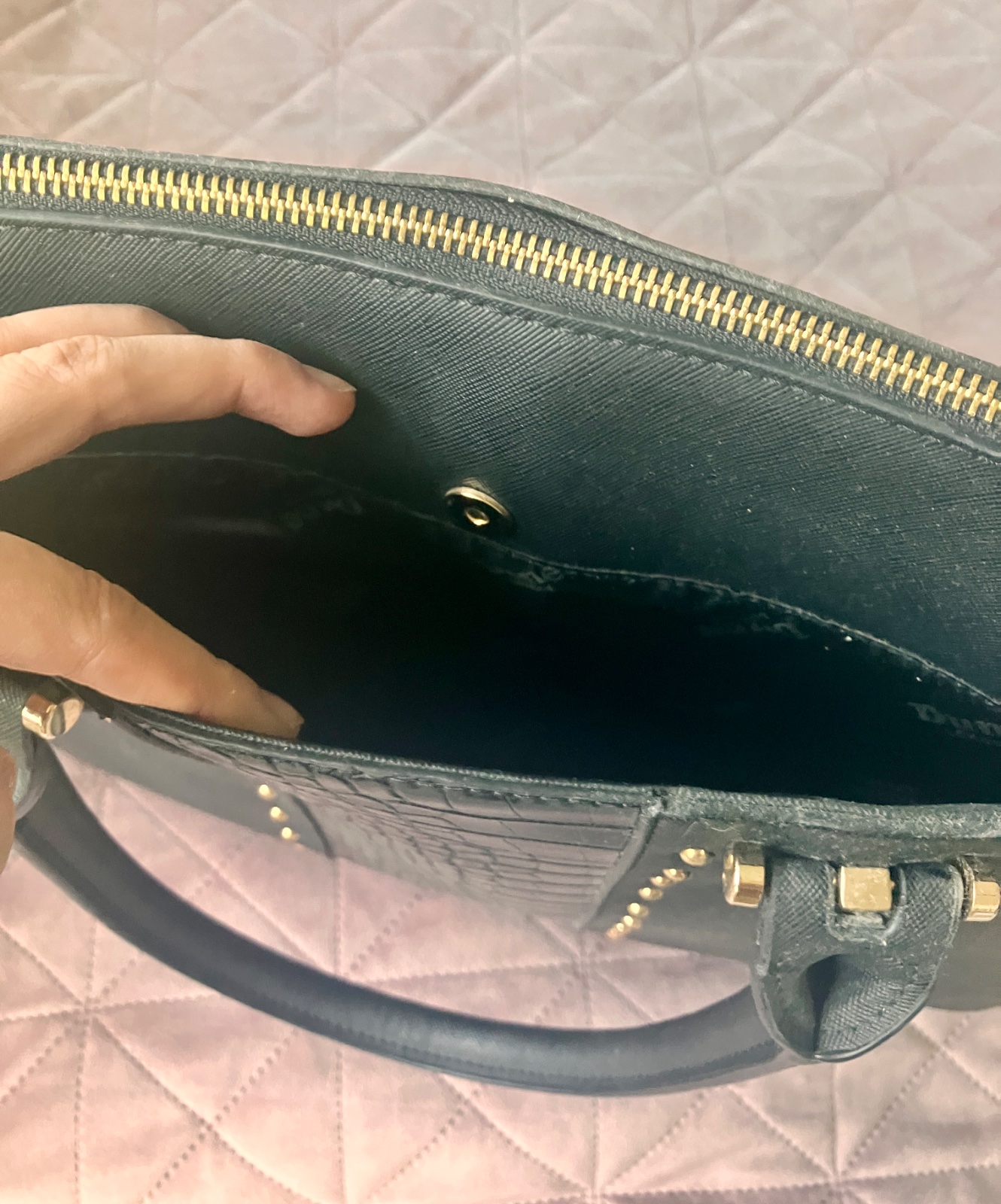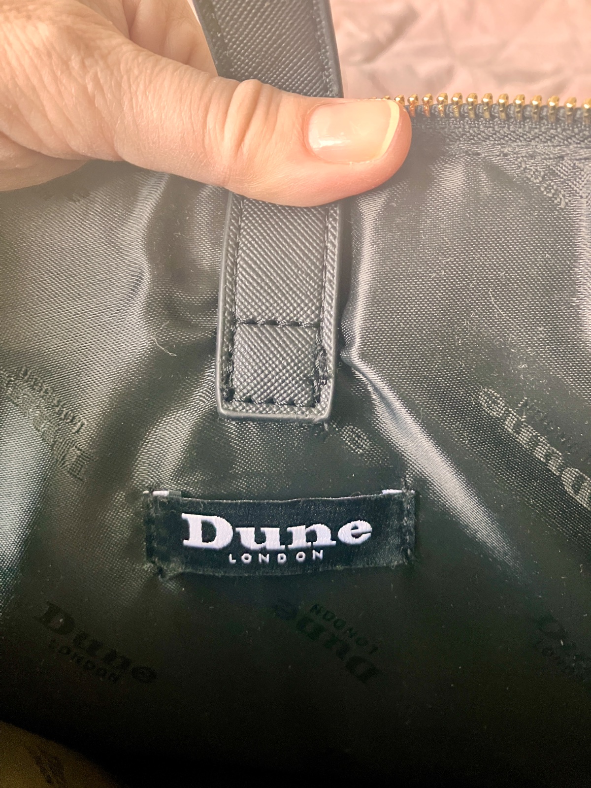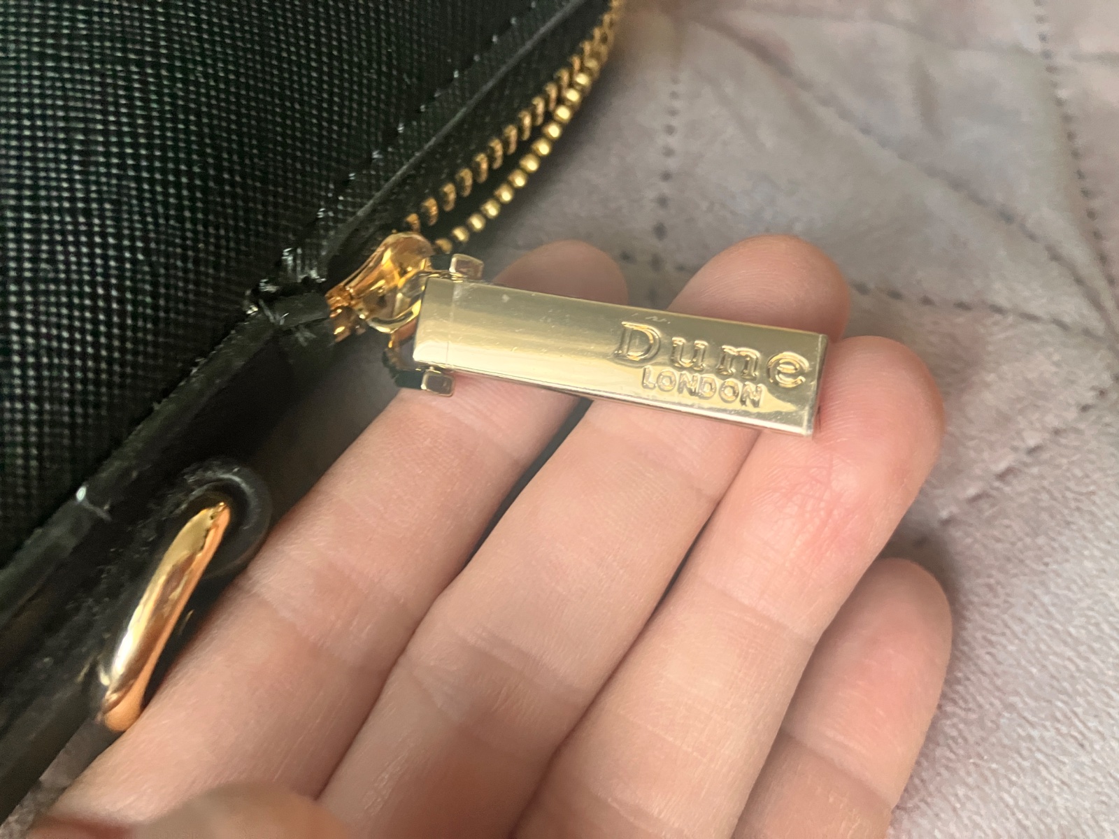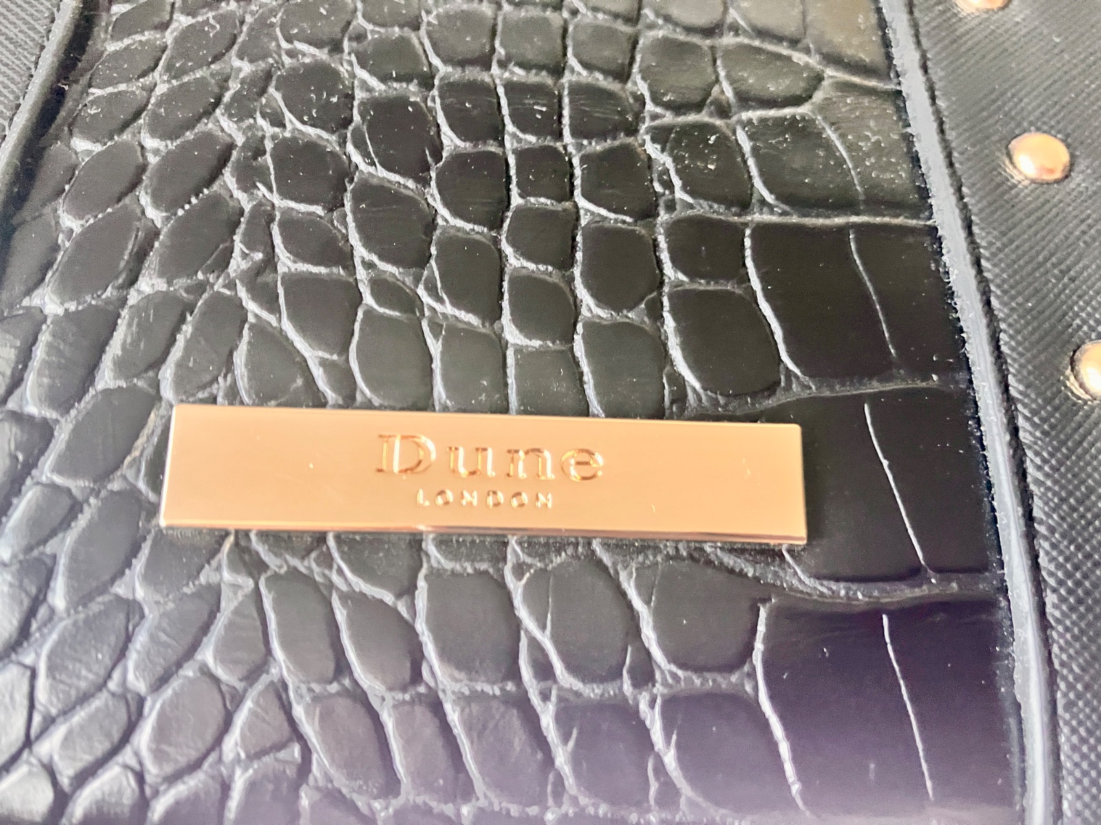 Krasna nenosena cierna kabelka Dune. Nikdy nepouzita, ale vzadu ma male otlacenie zo skladovania, tak neuvadzam ako novy vyrobok. Vpredu jedno vrecko, vnutri 3 priehradky, z toho jedna na zips. Bez dlheho popruhu.