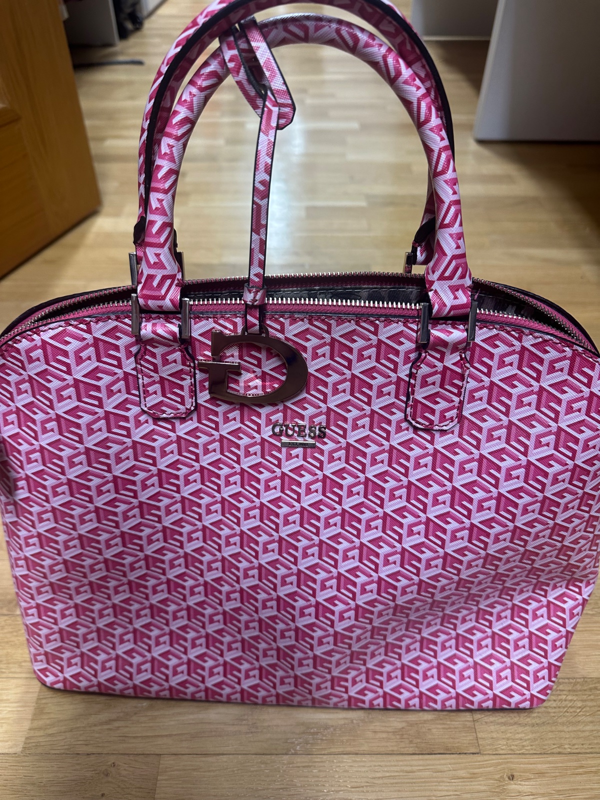 Krásna veľká cyklamenova kabelka,originál Guess kupovaná v Dubaji. Pôvodná cena veľmi vysoká.Kabelka bola nosená čo je aj vidno.Má poškodenia,ktoré ale opraví šikovná krajčírka.Este urobí parádu 😊 ...