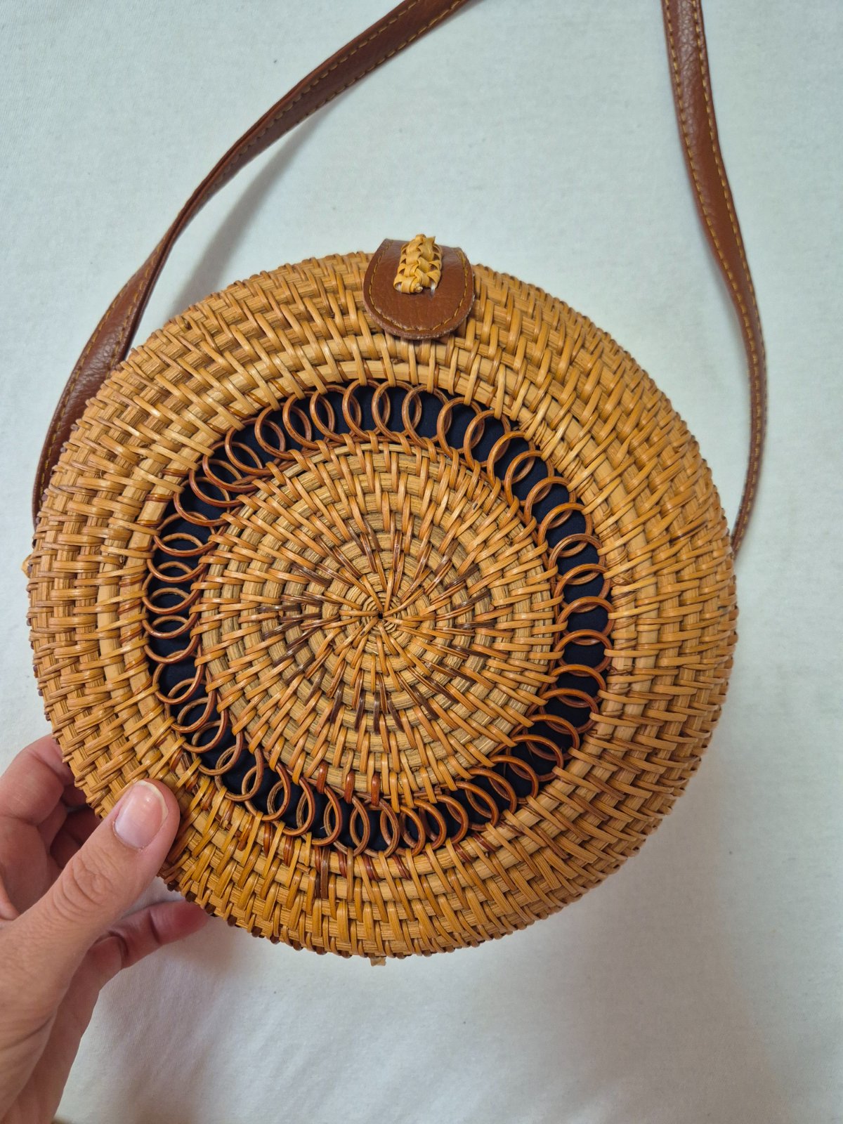 Štýlová a elegantná zároveň slamená taška hnedej farby. Okrúhla, priestranná slamená taška, podšitá, zapínanie za zips, vrecko 1 vnútorné vrecko so zapínaním na zips, 1 vrecko bez zapínania.