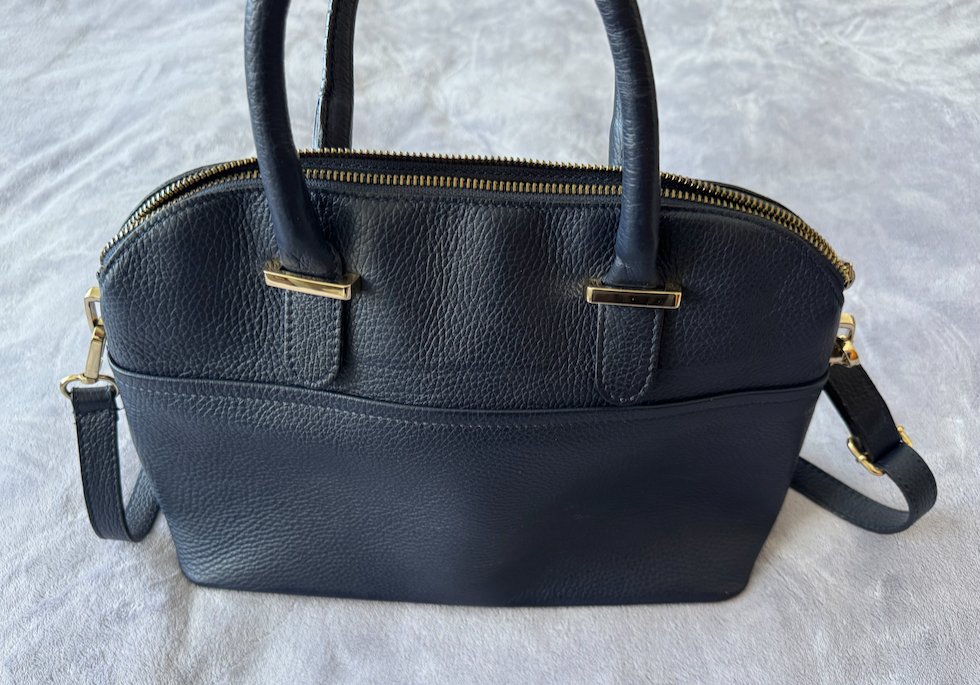 Zatváranie na zips. Nosiť sa dá cez plece alebo cross body. Mierne ošúchané kovové prvky a spodná časť kabelky. Výška 22cm, šírka 34cm, hrúbka 12cm.
