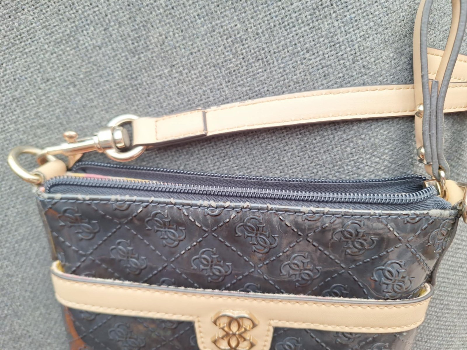 nosená orig. Guess crossbody menšia lesklá tenká kabelka, menšie známky používania, zvnútra od kľúčov trochu zašpinená, rozmery 22x19 cm.