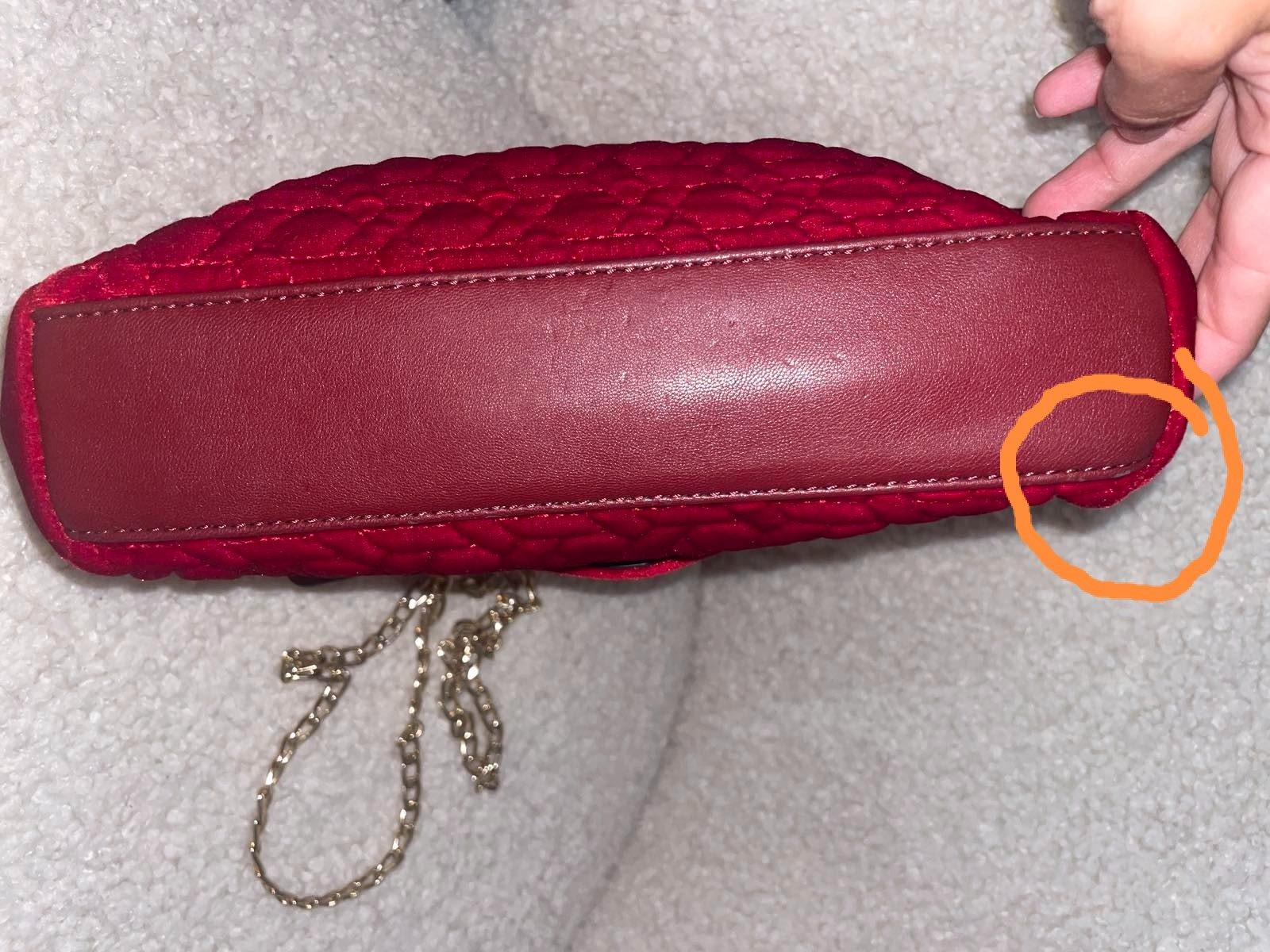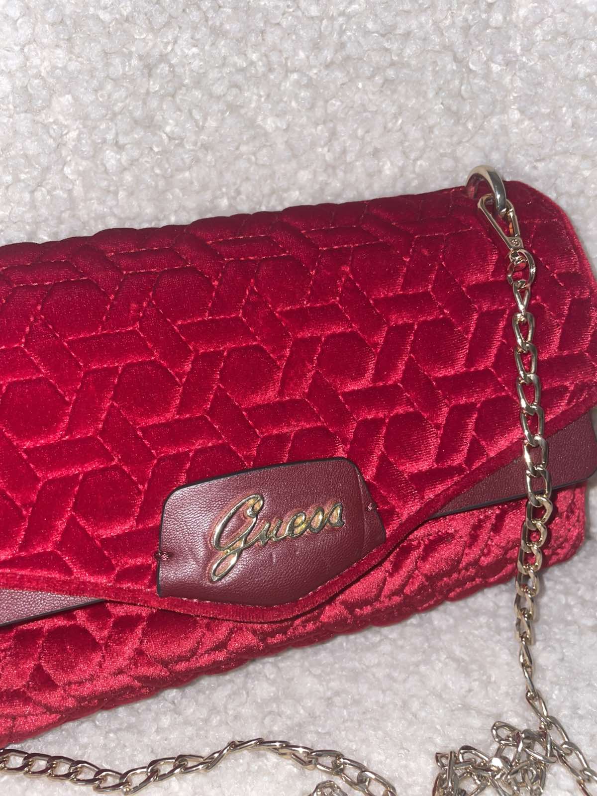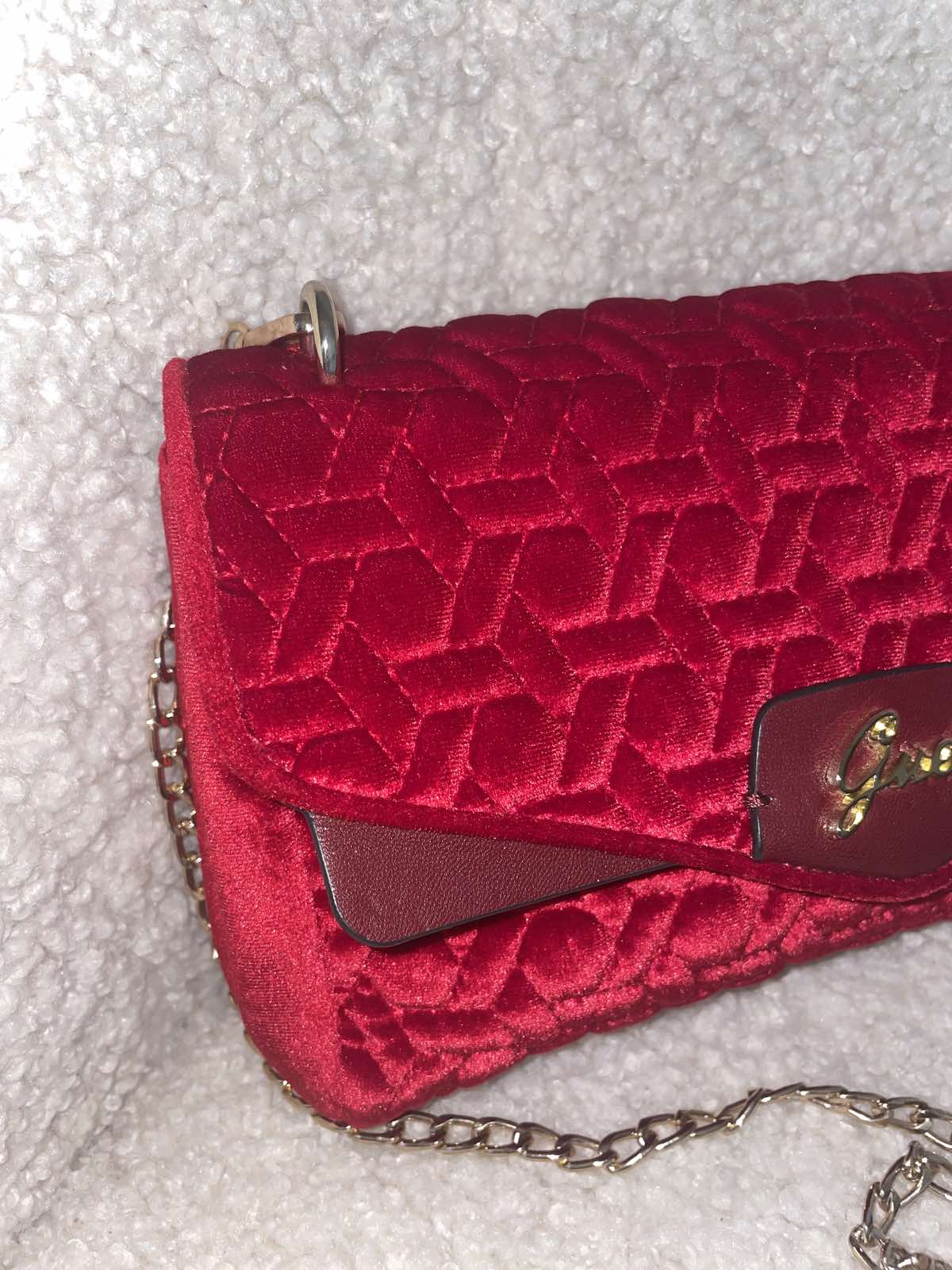 Výborný stav, bordová, zamatová so zlatou crossbody retiazkou, zo spodnej strany je jemne otlacena od zlého skladovania, na boku minioskretie - označené krúžkom