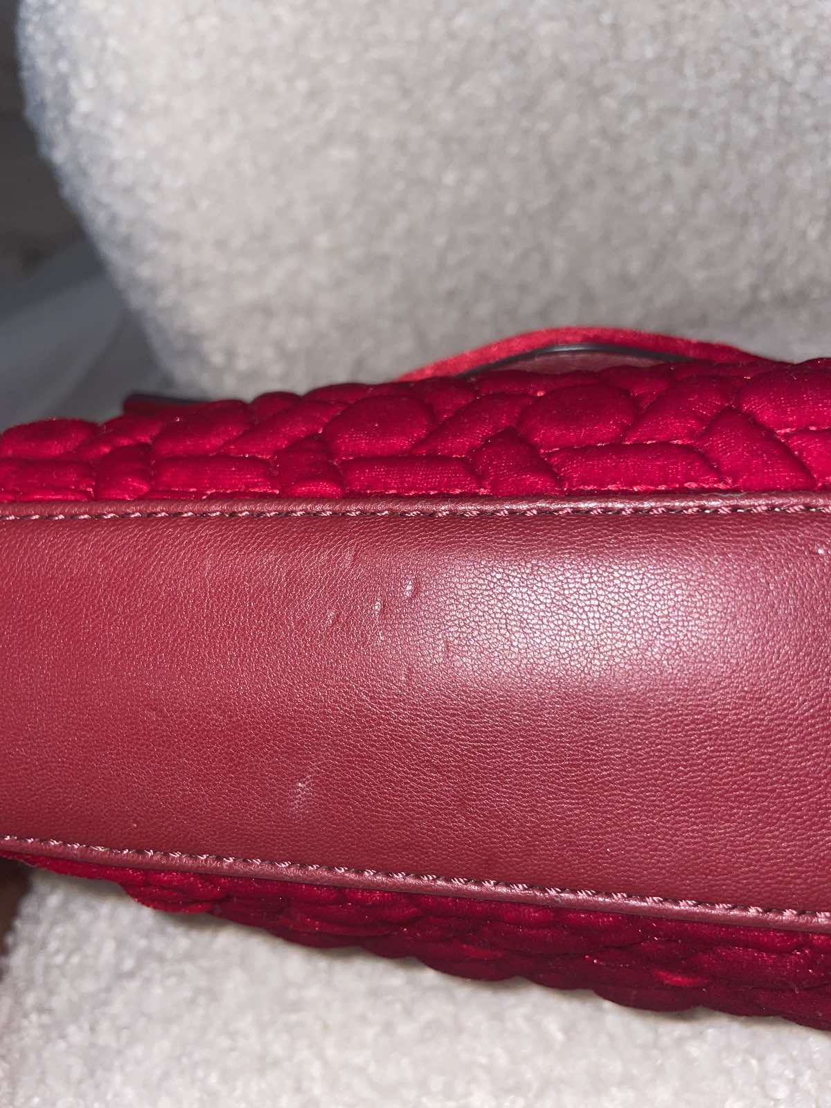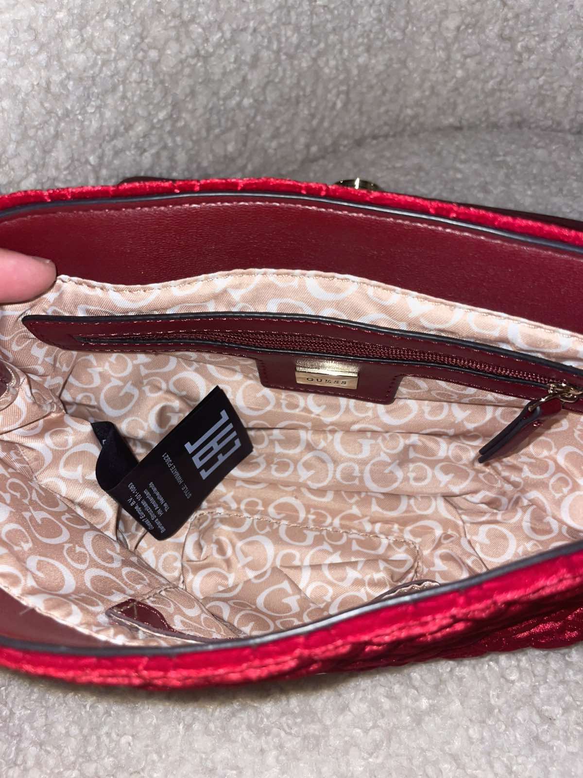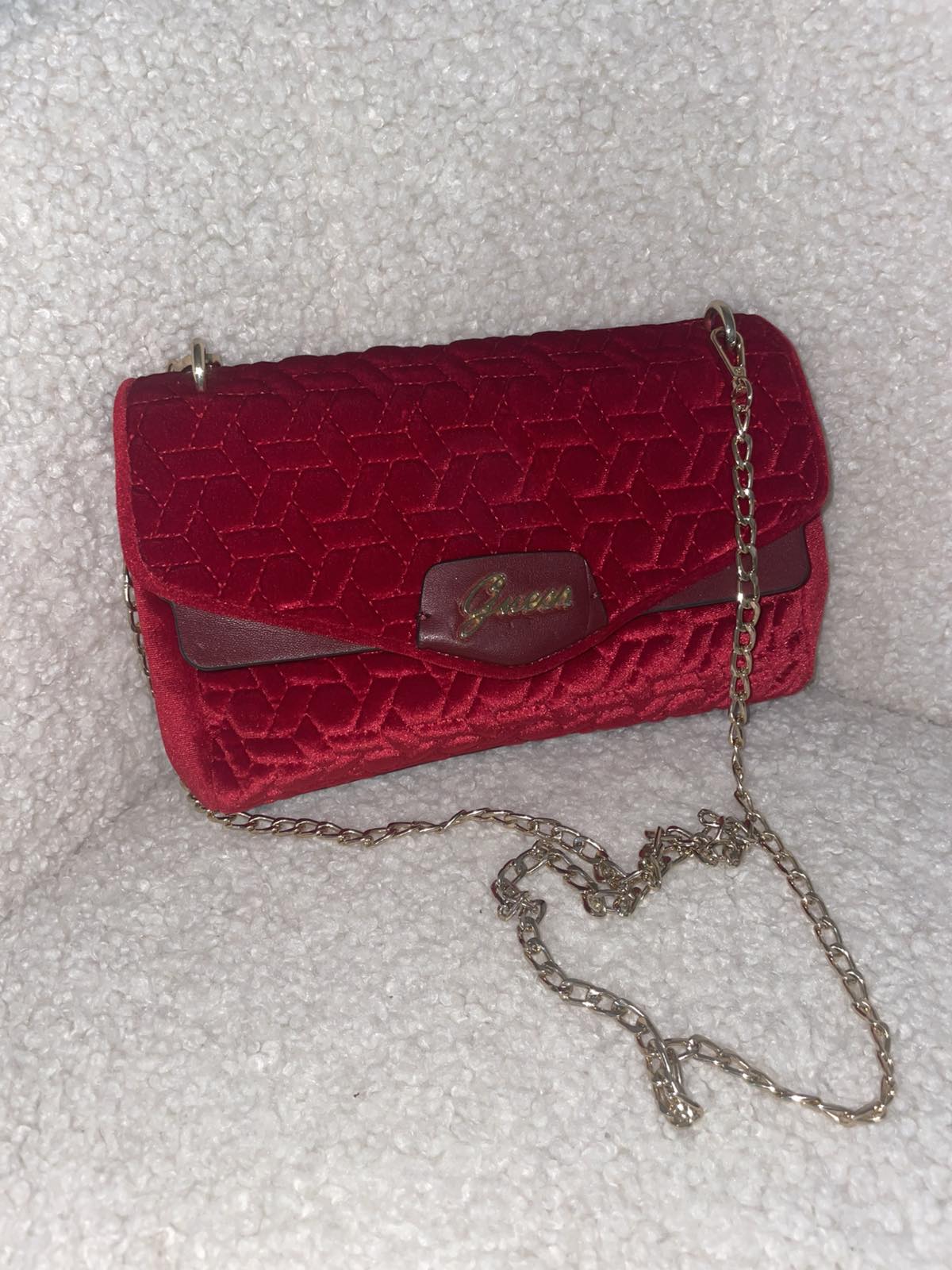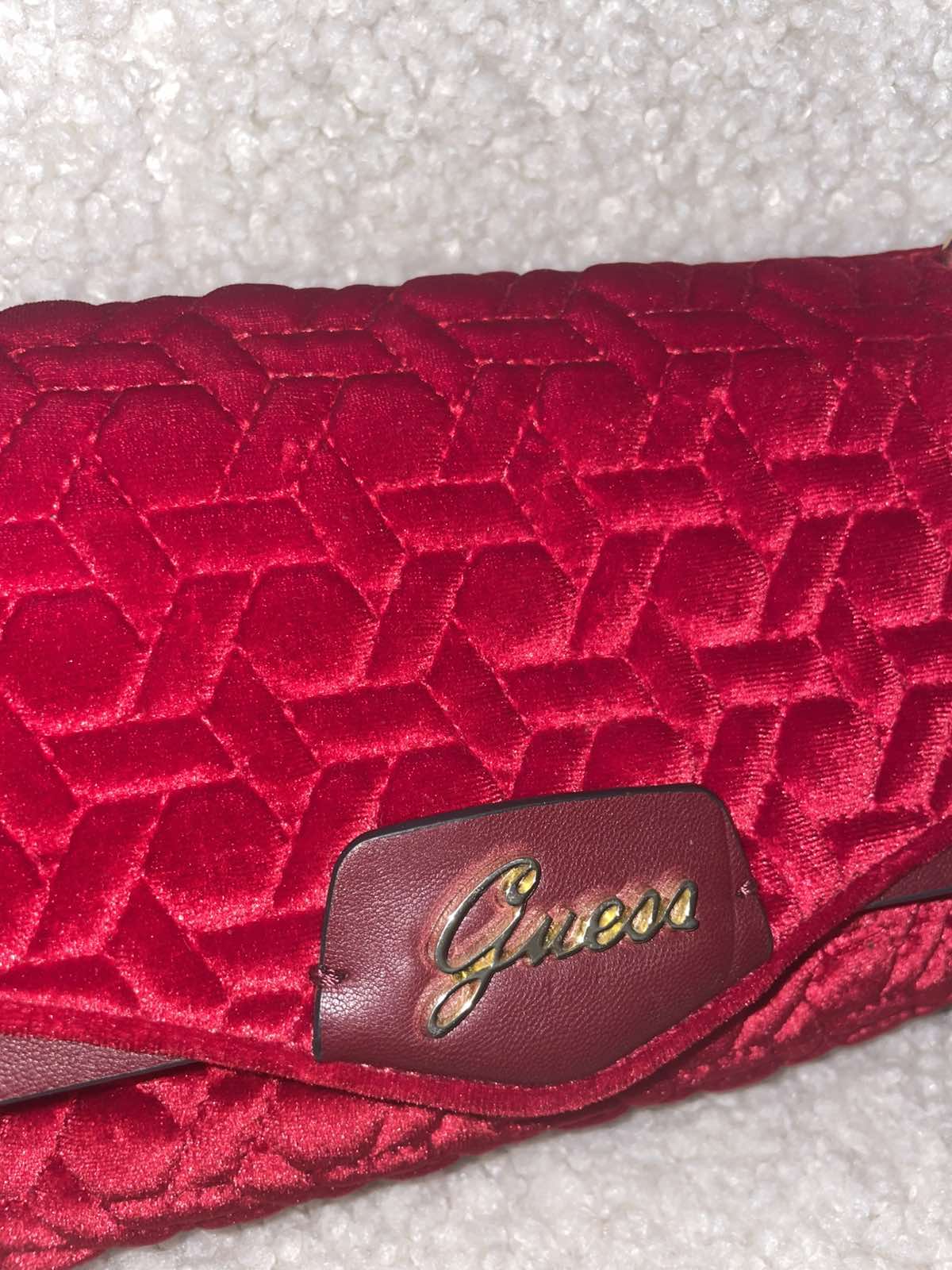 Výborný stav, bordová, zamatová so zlatou crossbody retiazkou, zo spodnej strany je jemne otlacena od zlého skladovania, na boku minioskretie - označené krúžkom
