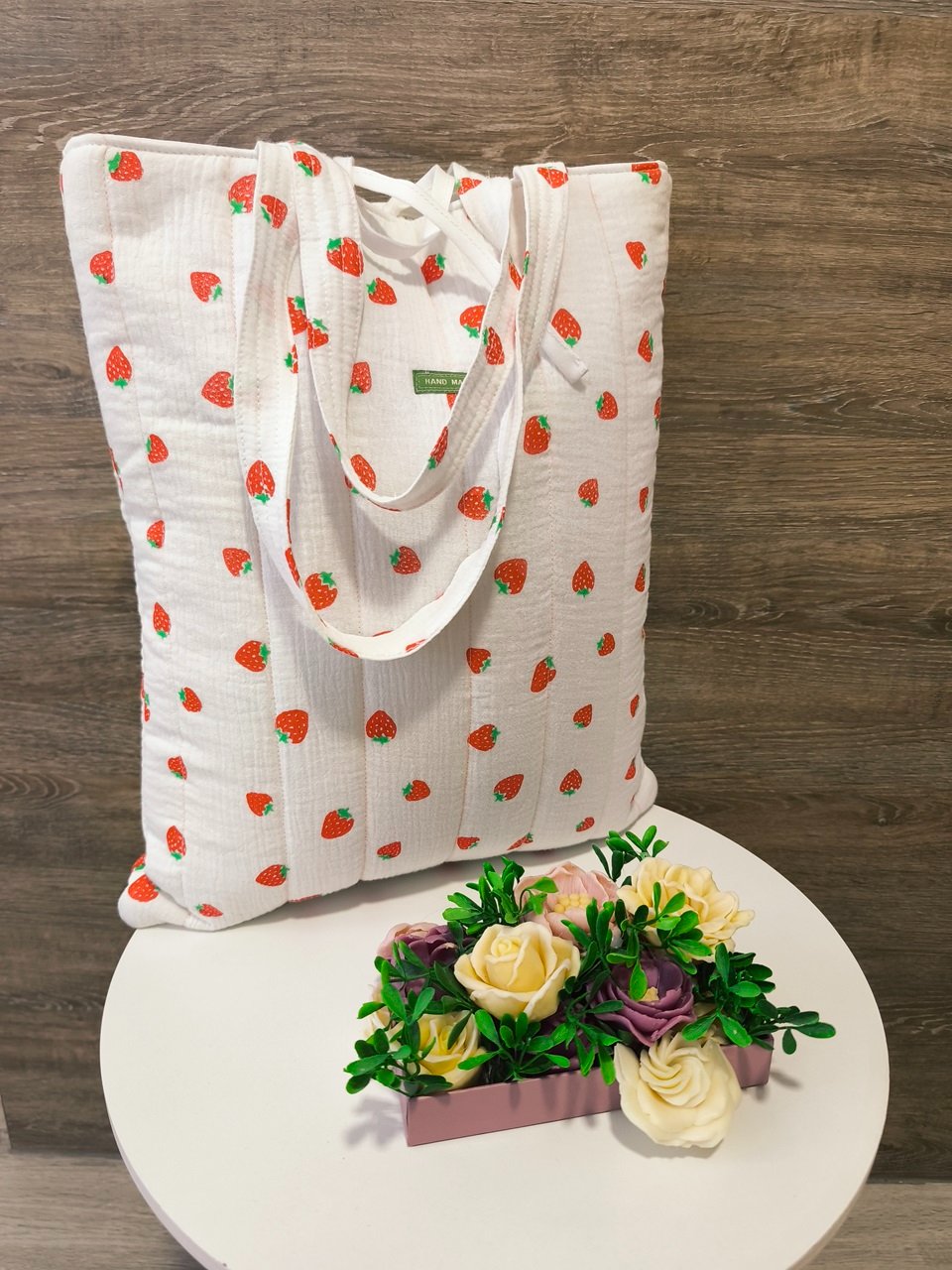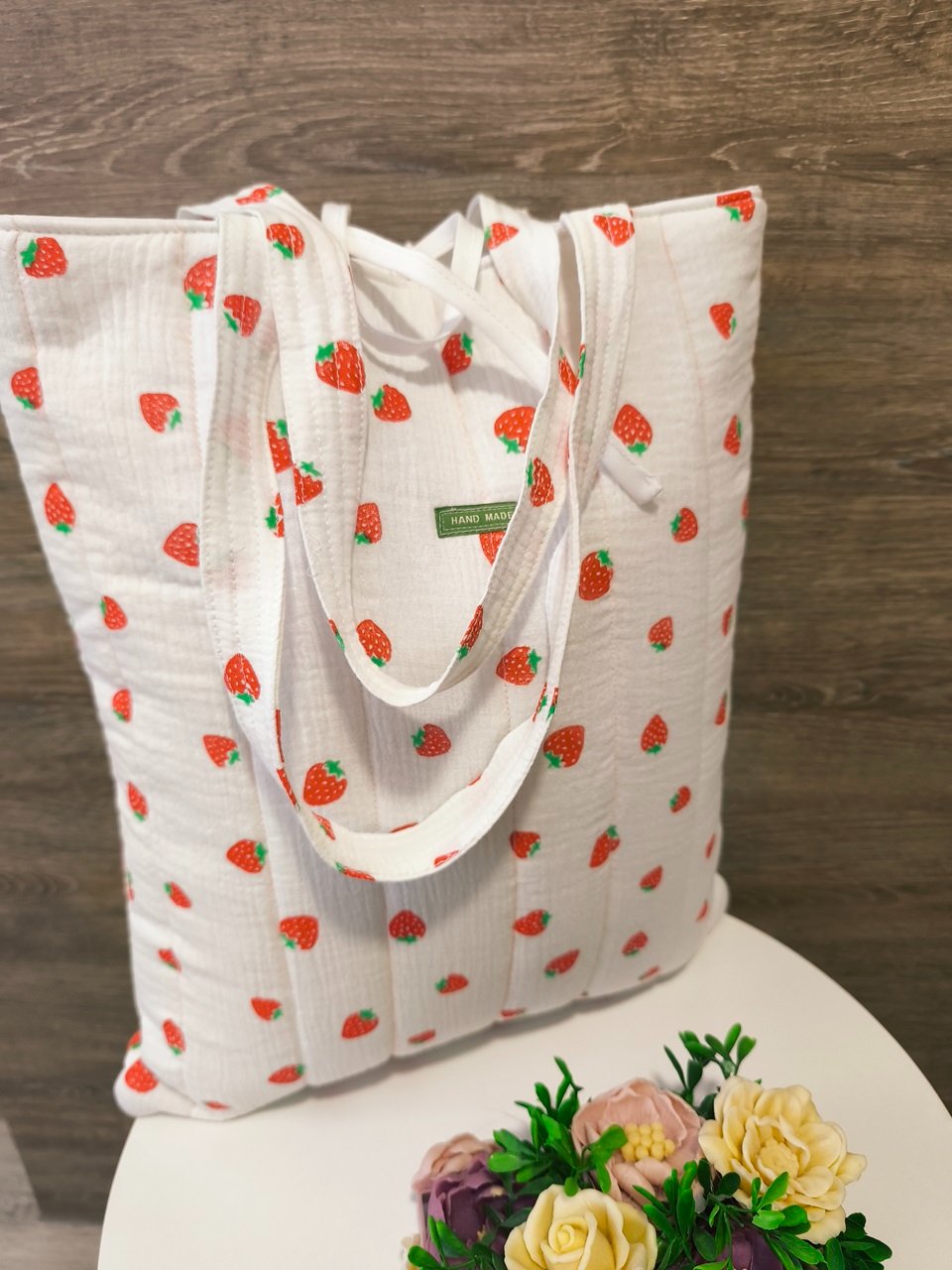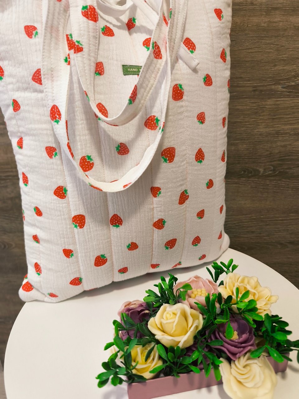 Doprajte si kúsok letnej nálady s touto originálnou taškou z prémiového mušelínu (100 % bavlna). Mušelín je momentálne obrovským hitom – je nesmierne jemný, má charakteristickú vafľovú štruktúru a v kombinácii s hravým jahodovým vzorom pôsobí sviežo a žensky.