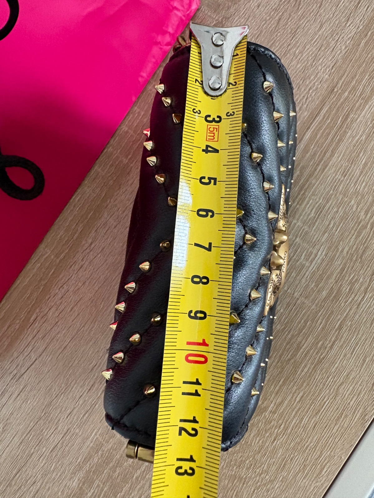 Kabelka je 1x vzatá . Čierna kožená so zlatými ostňami. Ma retiazku da sa nosiť aj ako crossbody.