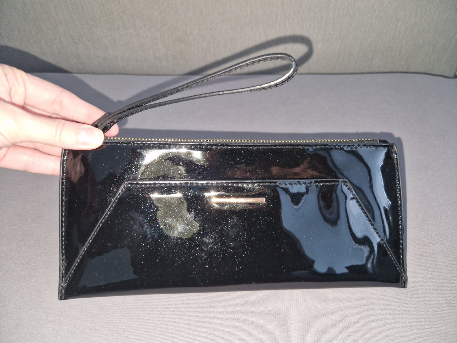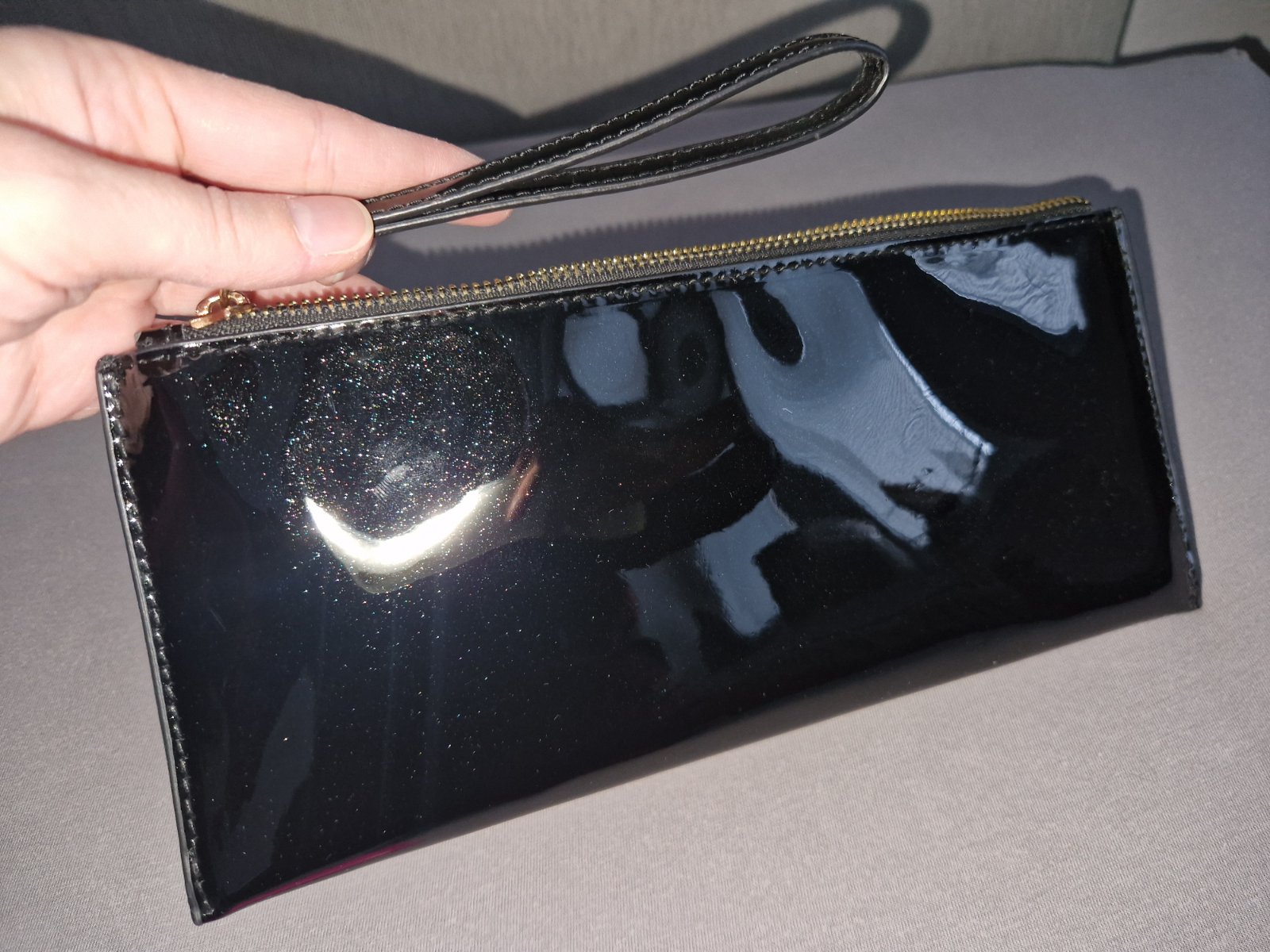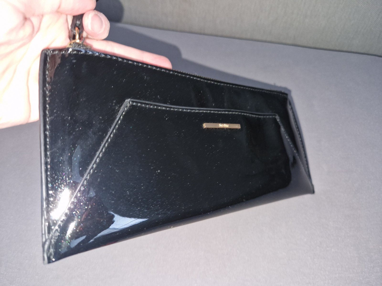 Listova kabelka z Bershky, leskly cierny povrch s odleskom zlatej, raz pouzita, rozmer 27x12x1cm