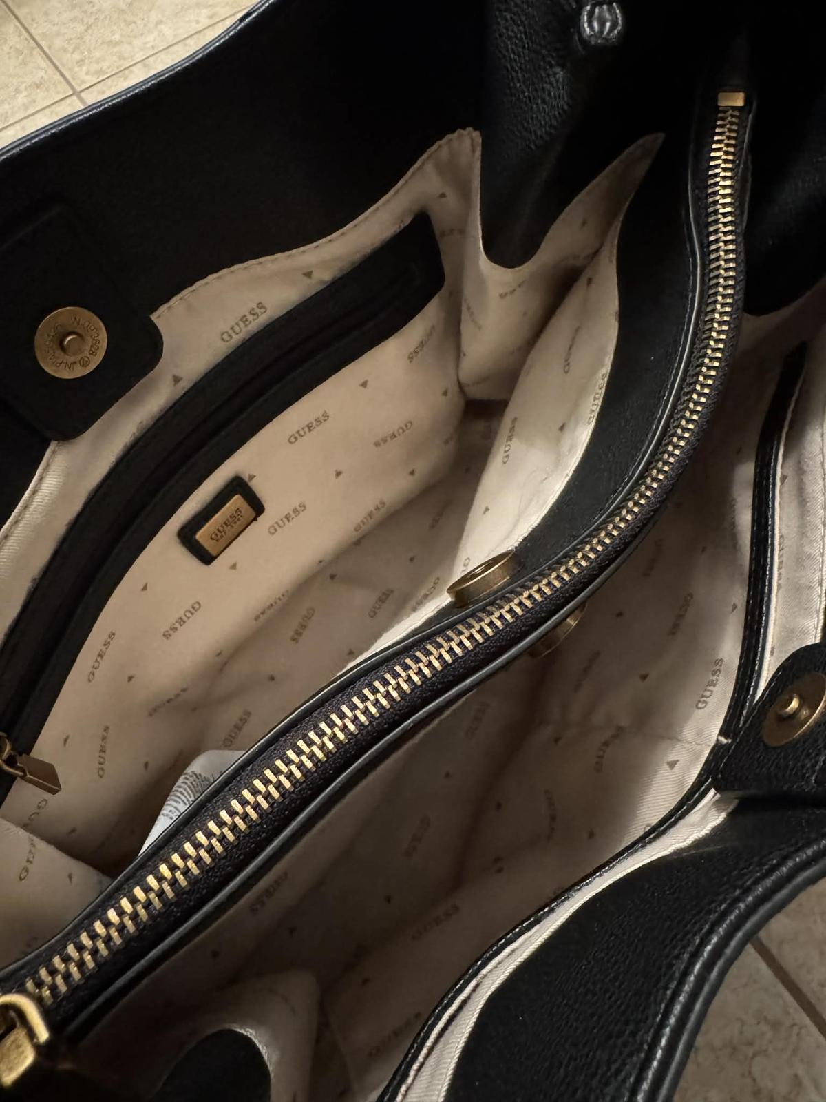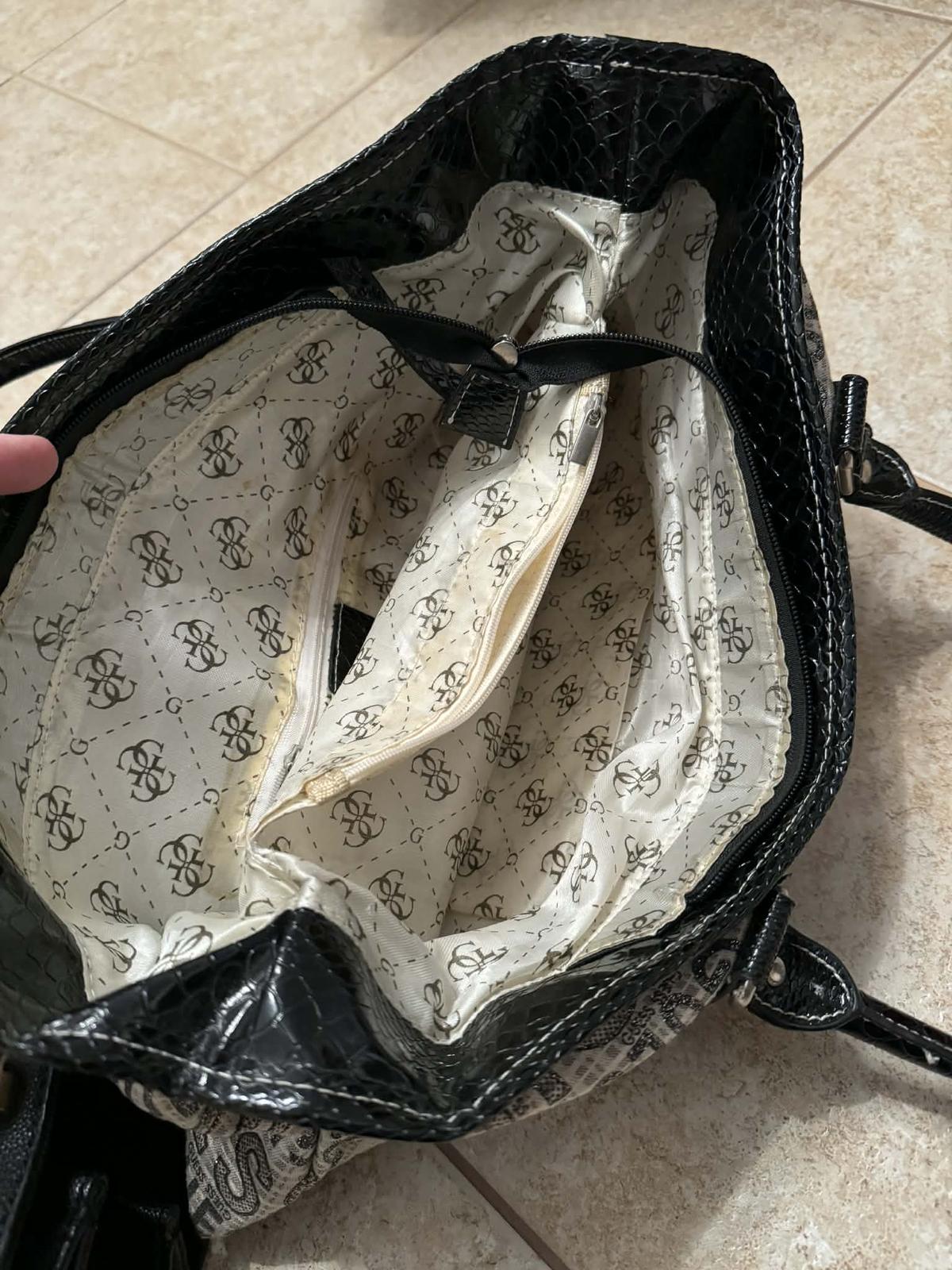 Veľká kabelka Guess čierna. Originál z kamennej predajne. Pôvodná cena cca 199€. Šírka dole cca 35cm. Šírka hore 44cm. Úzka je 13cm a viac podľa toho ako ju naplníte. Výška 27,5cm. Na ruckach je vi...