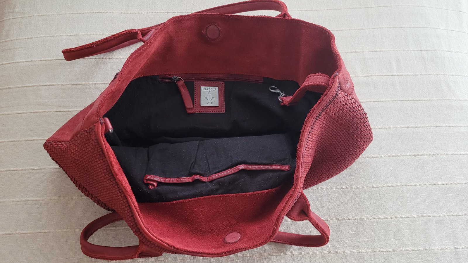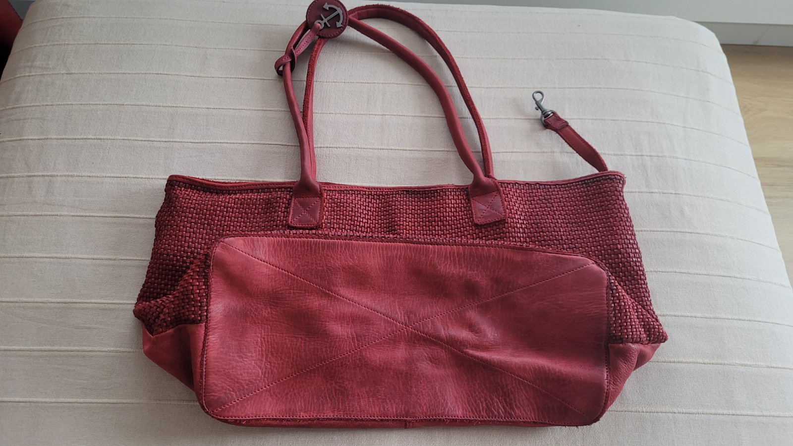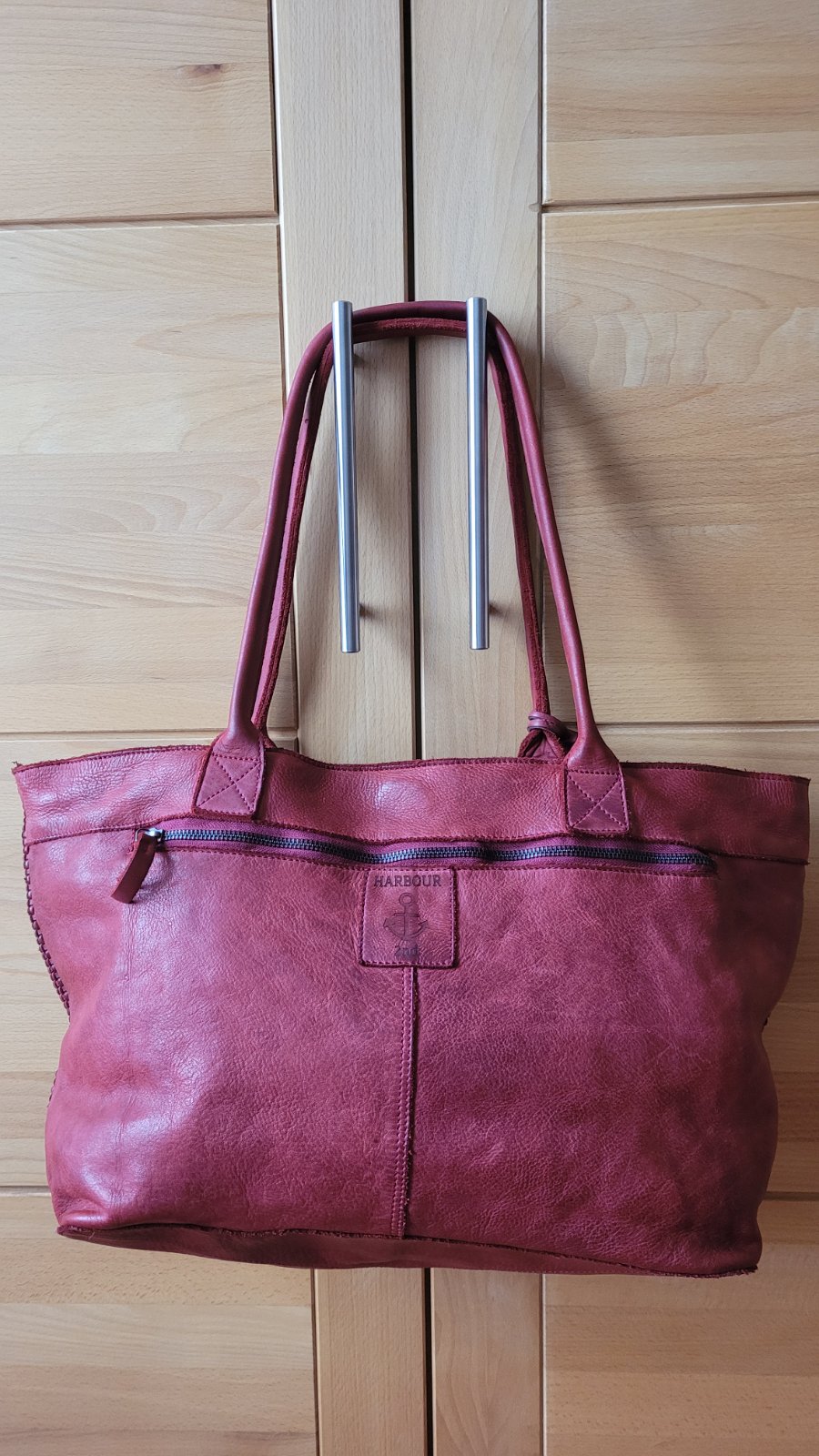 Priestranná kožená kabelka/shopper značky Harbour 2nd, model Grace, hovädzia koža vintage úprava, rozmer 50x30x15cm, málo používaná.Hlavný priestor sa dá zúžiť pomocou karabínky a koženého remienka, čím sa zmení tvar tašky. Kableku možno uzavrieť pomocou magnetu. Na vonkajšej zadnej strane sa nachádza vrecko na zips. Kovanie a zipsy sú vyrobené z kovu s vintage vzhľadom.