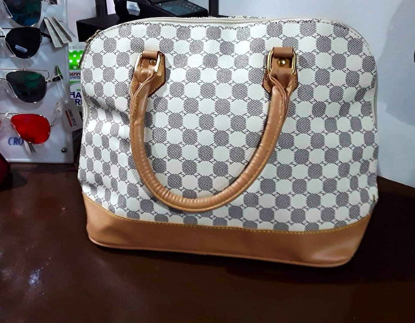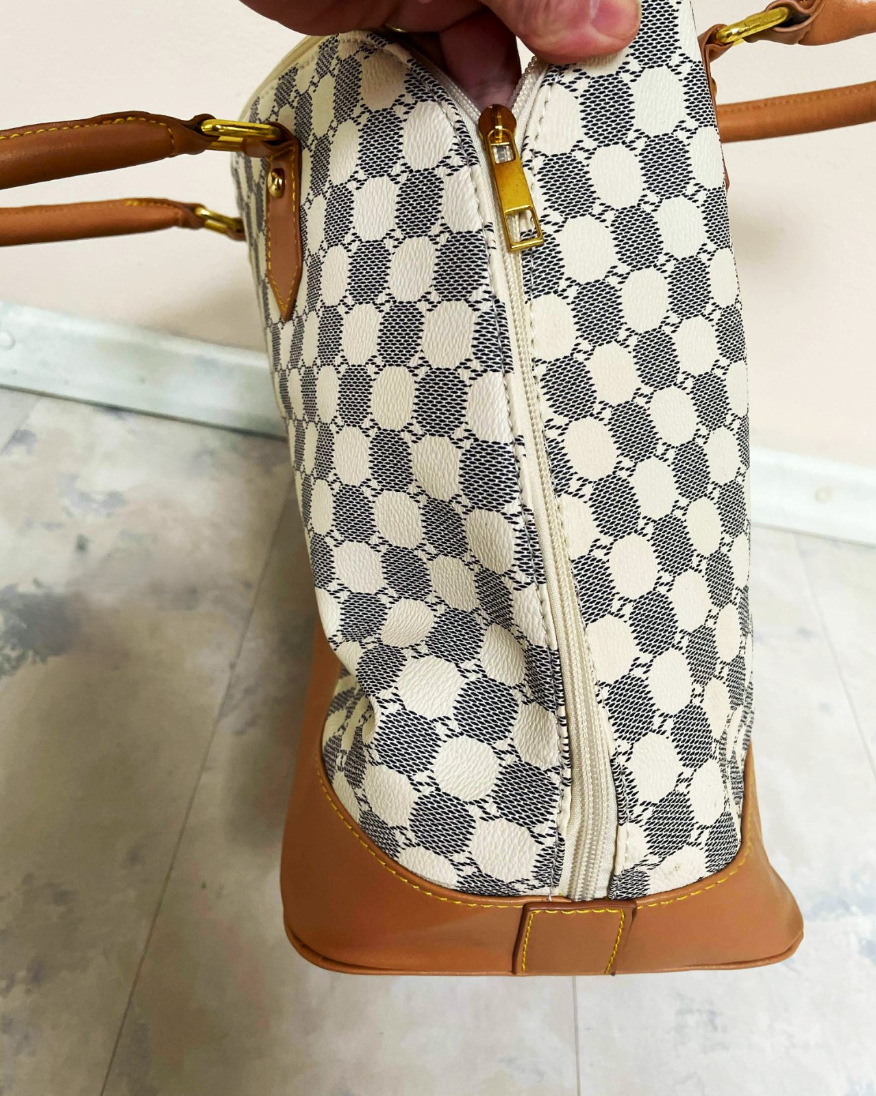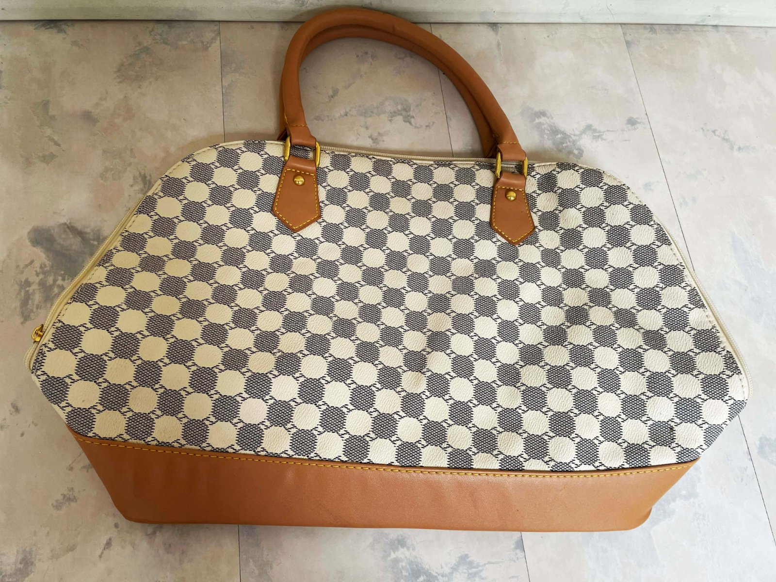 štýlová dámska priestranná kabelka s geometrickou potlačou, s výrazným vzorom pravidelných kruhových / šesťuholníkových tvarov a zlatými kovaniami a zipsom, ktorý dopĺňajú kontrastné hnedo - béžové prvky zo syntetickej kože,dlhá rúčka navyše.dnu pekne vyfutrovaná s kapsičkami - viď foto,kabela je nenosená - na dne ( vyfotené ) sú odtlačené fleky od riflí,na ktorých bola uložená, čo nie je pri nosení vidieť, ale upozorňujem na to, rozmery: dno = 37 x 16 cm, výška = 30 cm, šírka na spodku 47 cm, smerom k vrchu sa zužuje na 32 cm,rúčky cca 50 cm