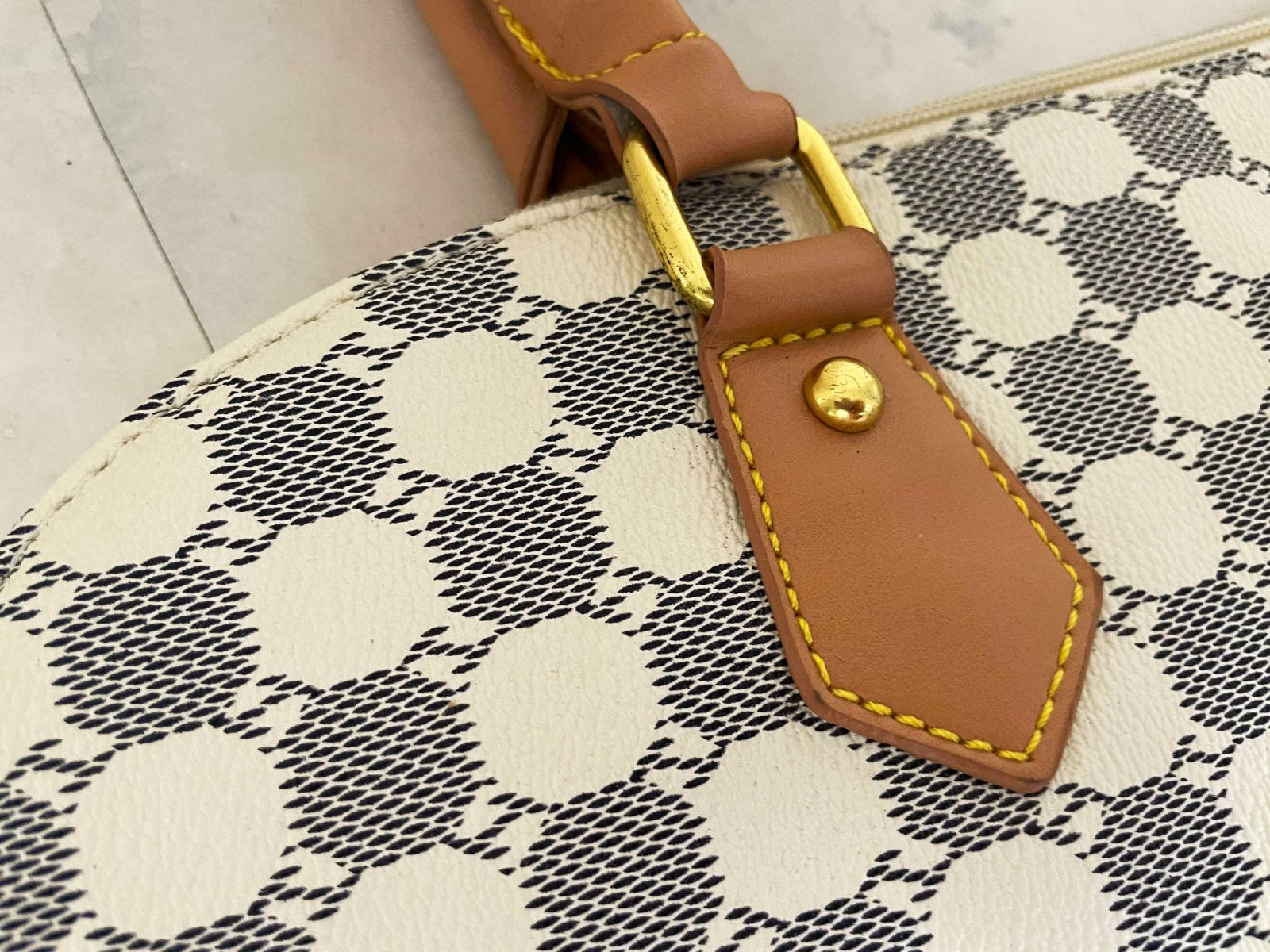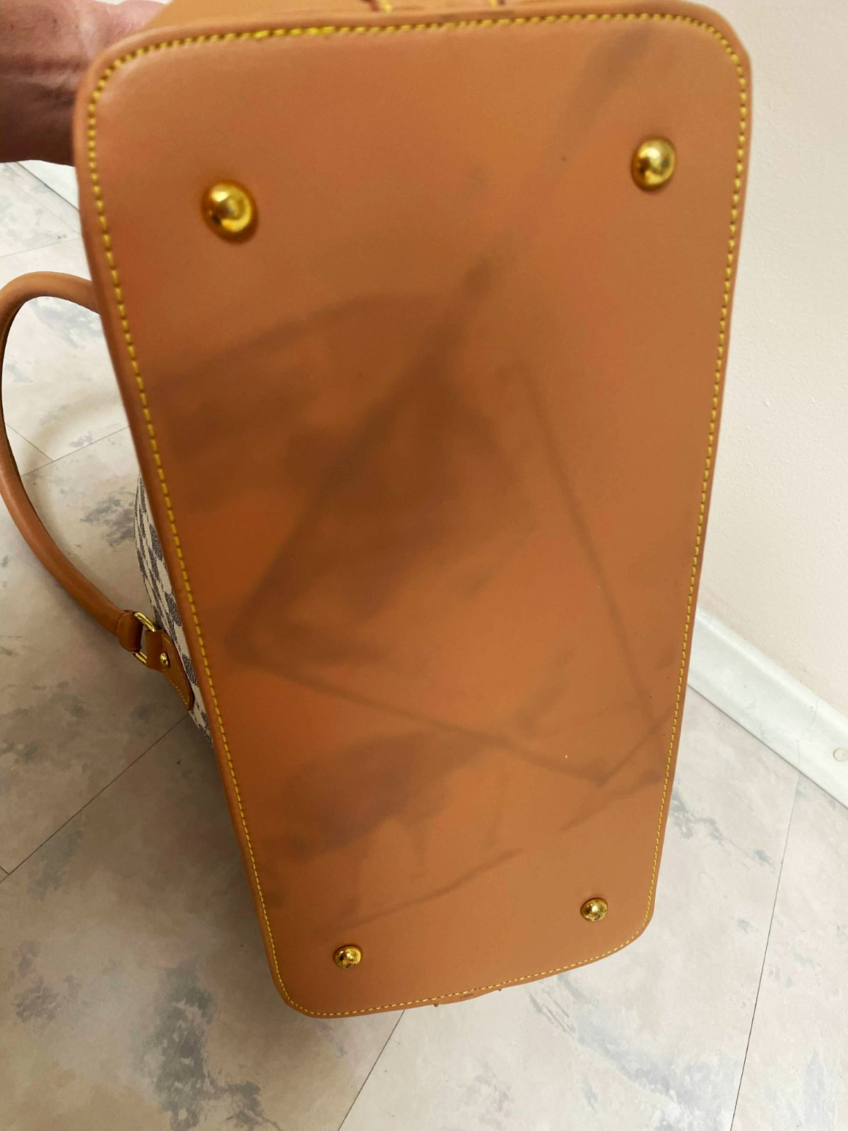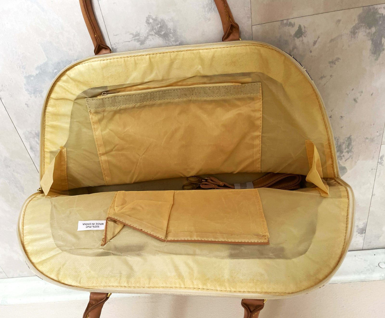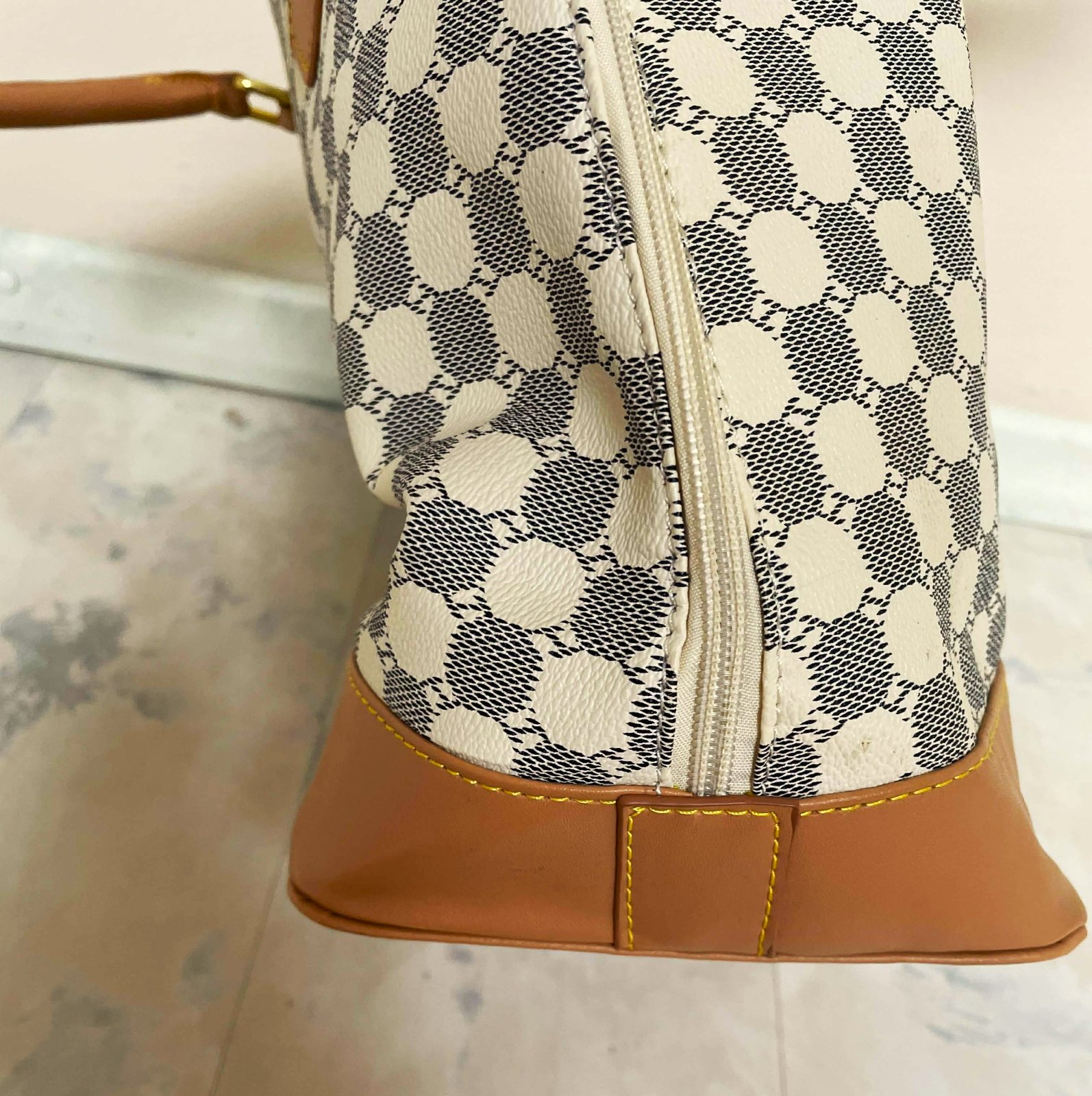 štýlová dámska priestranná kabelka s geometrickou potlačou, s výrazným vzorom pravidelných kruhových / šesťuholníkových tvarov a zlatými kovaniami a zipsom, ktorý dopĺňajú kontrastné hnedo - béžové prvky zo syntetickej kože,dlhá rúčka navyše.dnu pekne vyfutrovaná s kapsičkami - viď foto,kabela je nenosená - na dne ( vyfotené ) sú odtlačené fleky od riflí,na ktorých bola uložená, čo nie je pri nosení vidieť, ale upozorňujem na to, rozmery: dno = 37 x 16 cm, výška = 30 cm, šírka na spodku 47 cm, smerom k vrchu sa zužuje na 32 cm,rúčky cca 50 cm