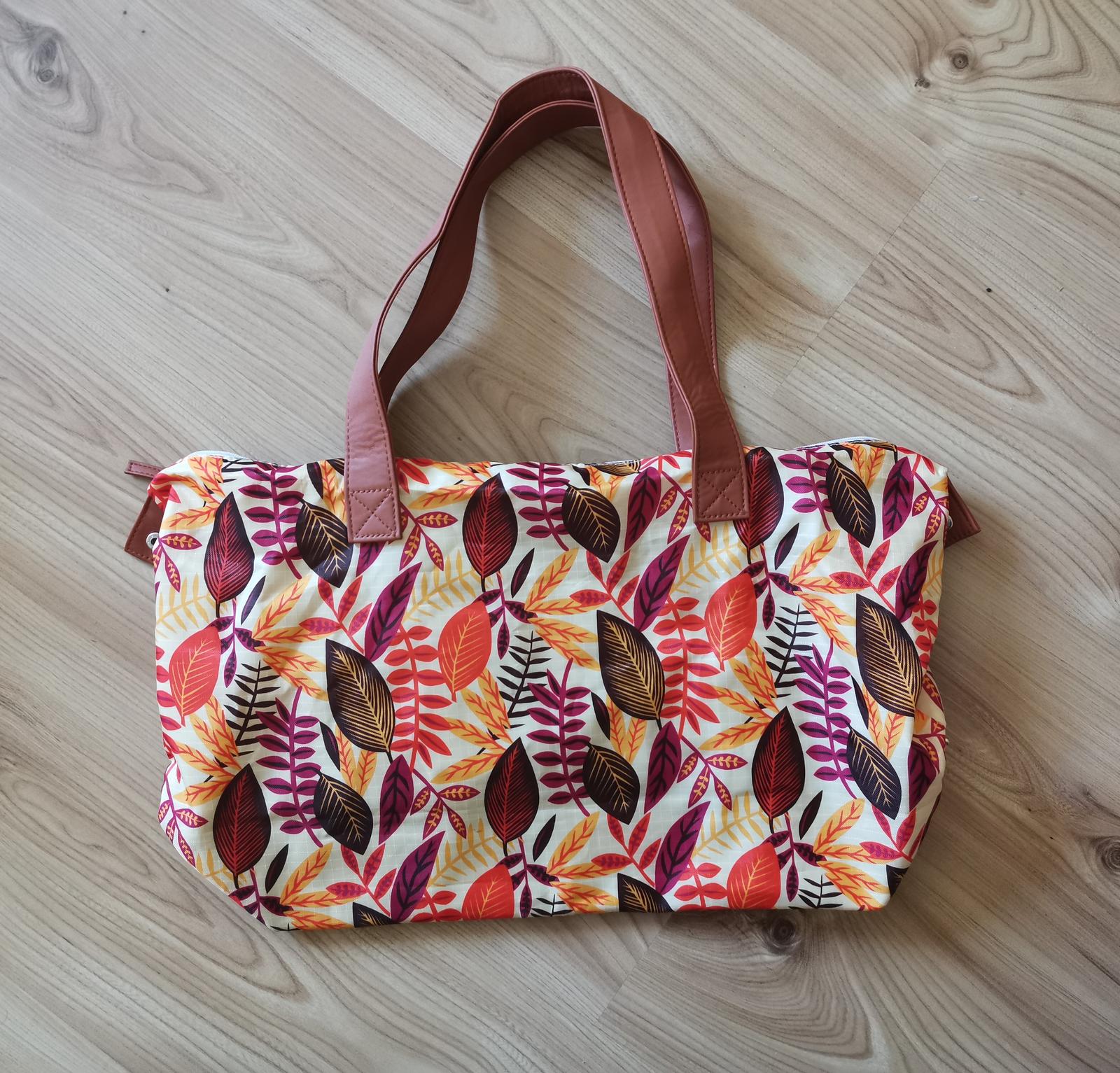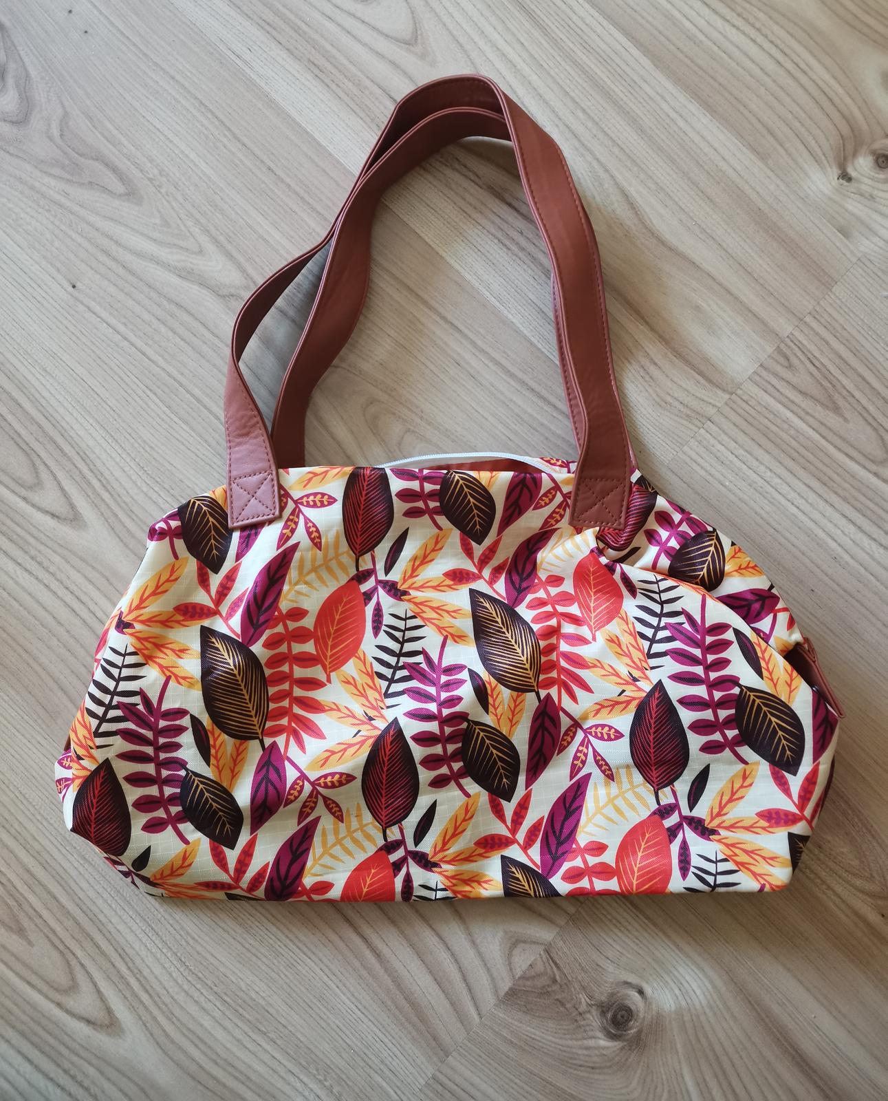 Krásna kabelka s možnosťou nosenia v dvoch veľkostiach - po boku má zapínanie, ktorého rozopnutím sa kabelka po stranách zväčší. Látka umývateľná, rúčky koženkové, kabelka do ruky, alebo aj na plece. Veľkosť v rozloženom stave, šírka 51cm, výška 30cm, hĺbka 12cm.