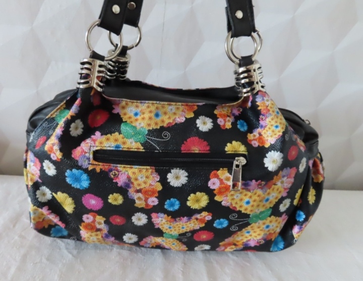 Dámska kabelka s kvetmi a motýľmi. Rozmery: šírka 36cm, výška 23cm a hlbka 11cm.