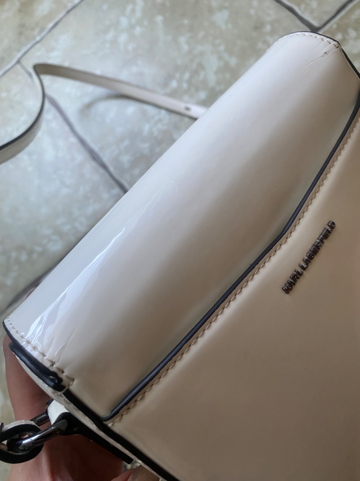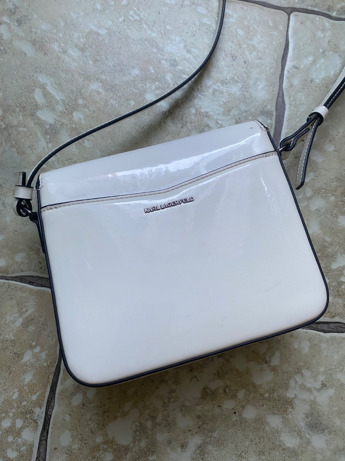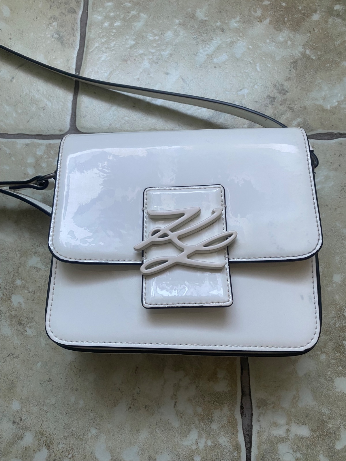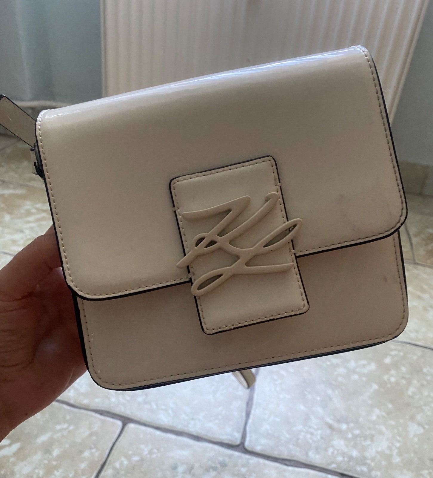 V ponuke biela, lesklá crossbody kabelka Karl Lagerfeld, model 211W3011. Kúpená tu na inom predajnom portáli ako nosená, dobrý stav, nakoniec som sa rozhodla posunúť ju ďalej. Krásny model, super veľkosť, aby sa zmestilo všetko potrebné, ľahko kombinovateľná - odporúčam 🩷. POZOR !!! - kabelka má chybičky, ľahké ušpinenie vpredu a zopár malých praskliniek, všetko som sa snažila nafotiť.