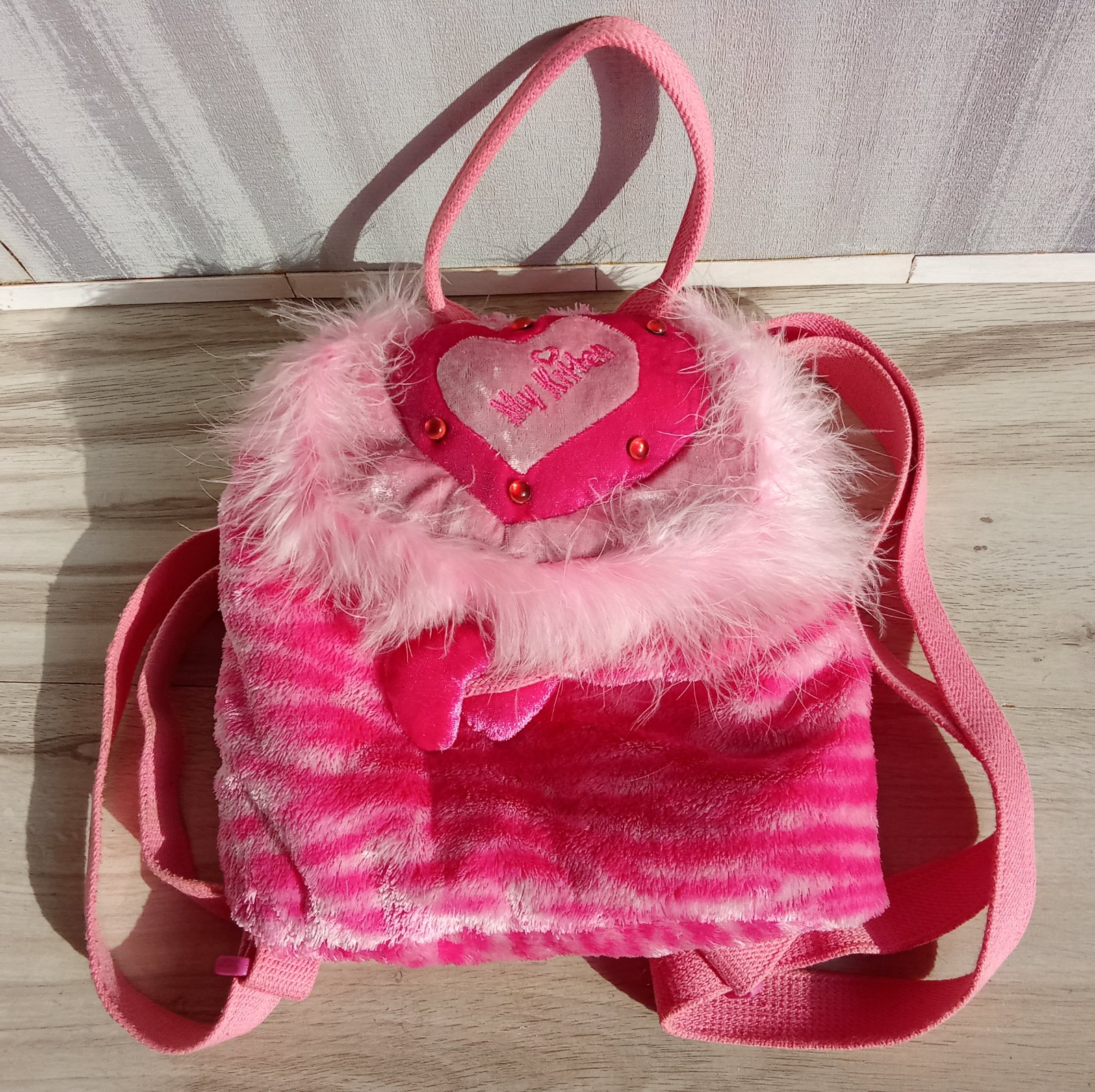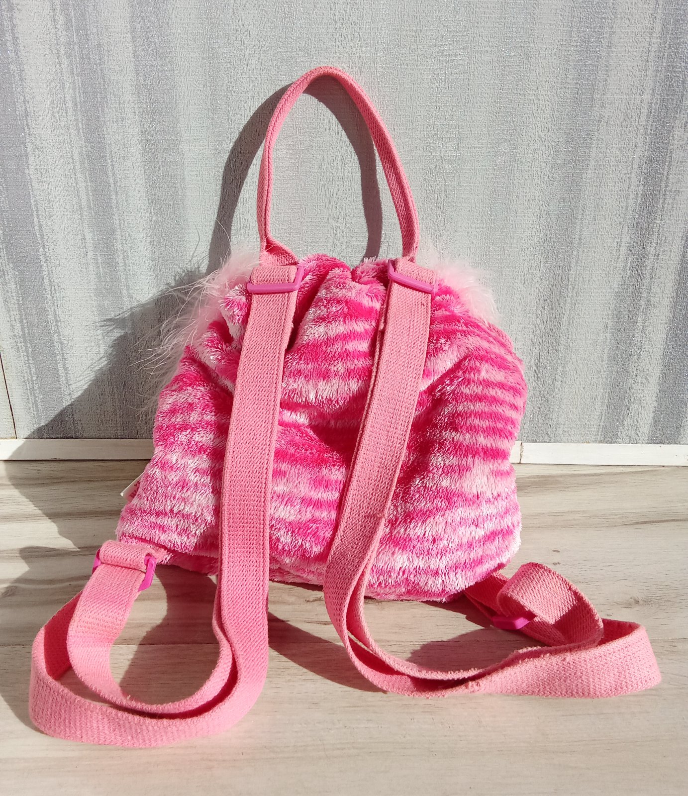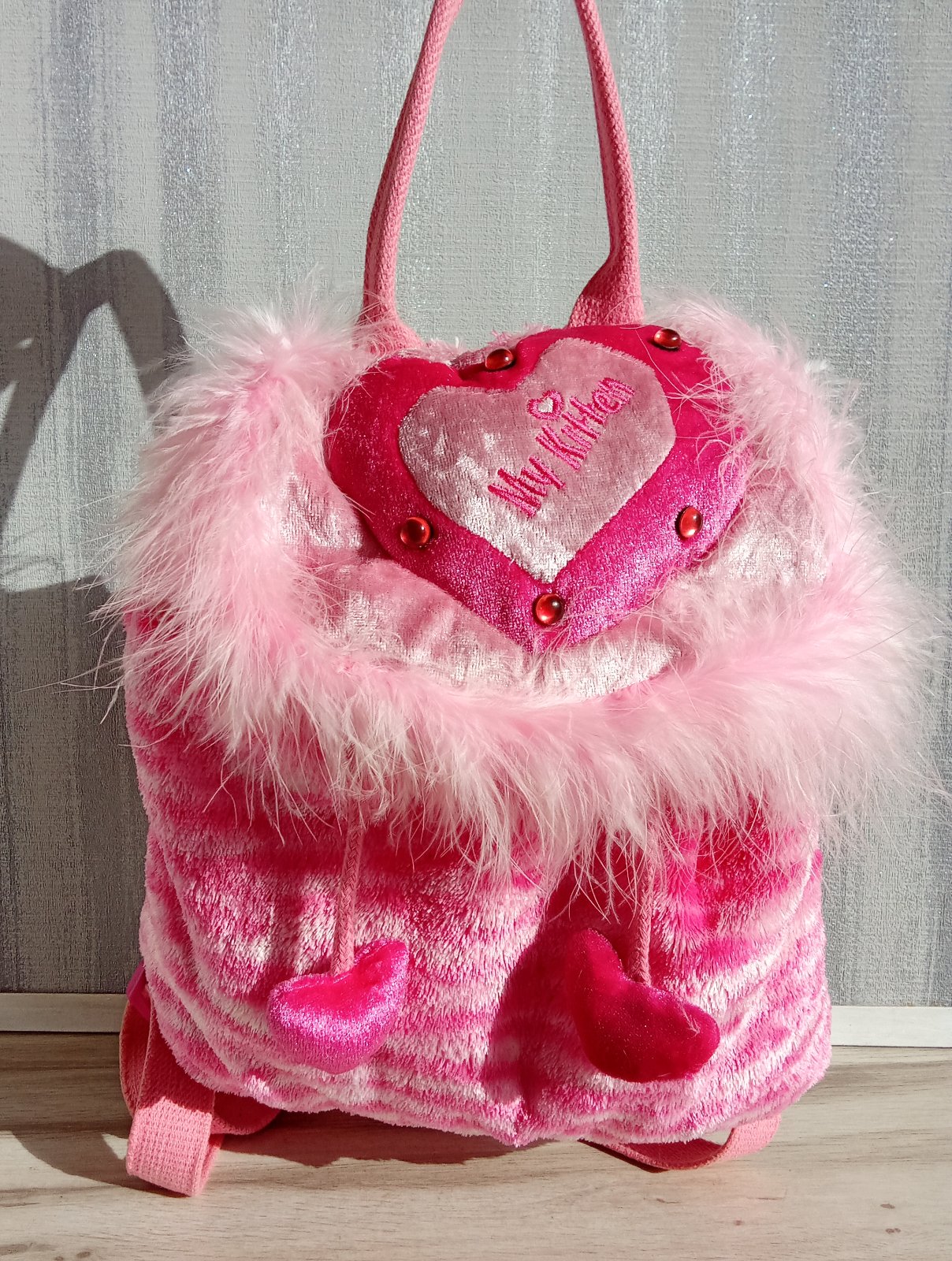 Na vrchu batohu sú krásne ružové pierka a nápis My kitten v srdci, zaťahuje sa so šnúrkou, na ktorej konci visia dve ružové látkové srdcia. Batoh má nastaviteľné popruhy,