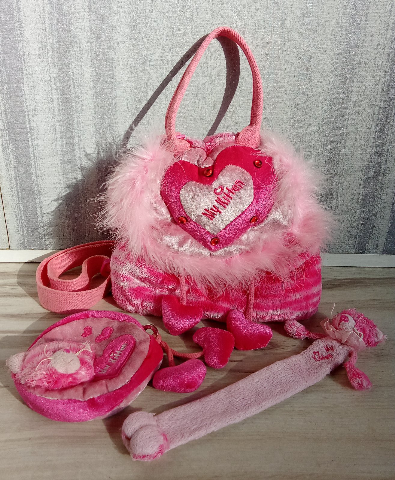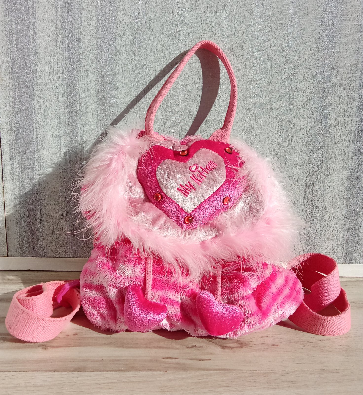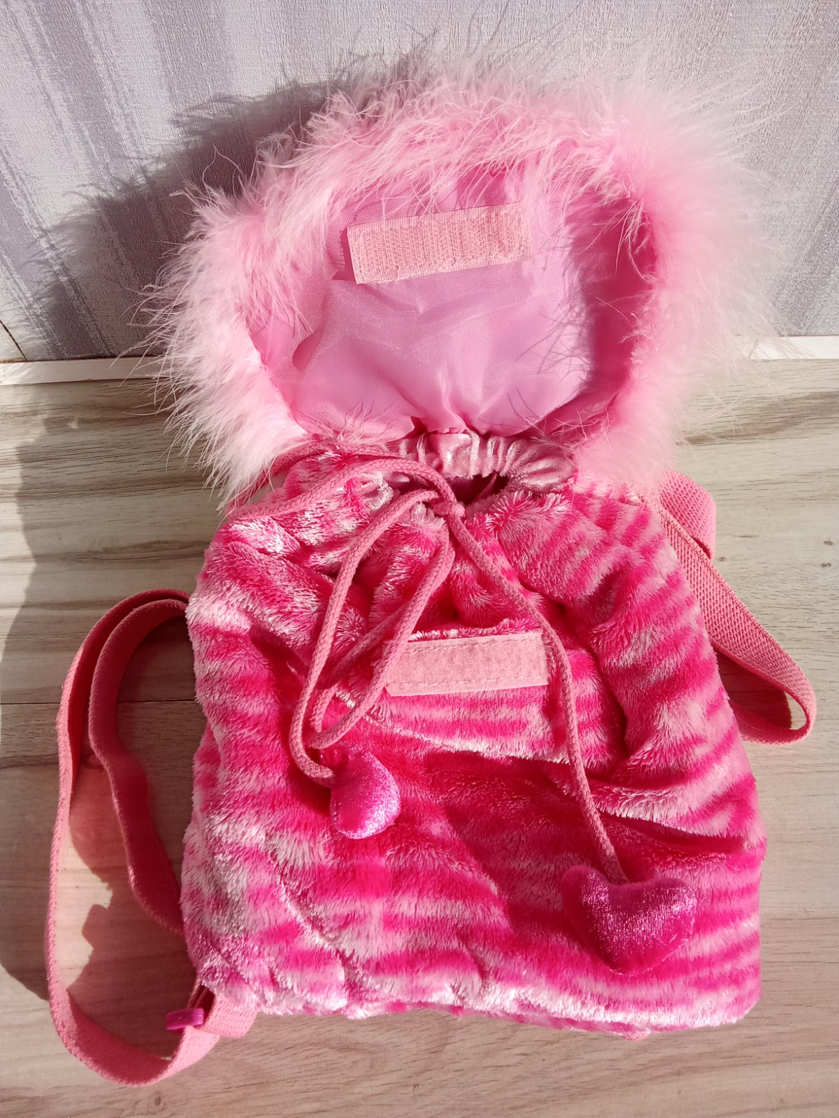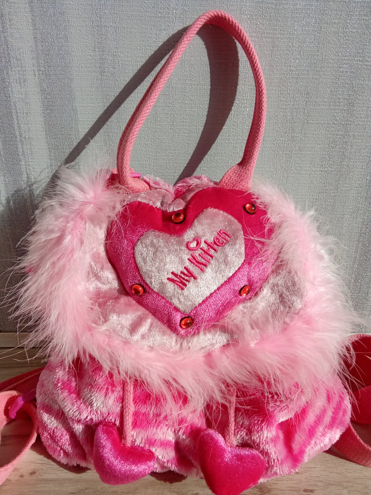 Na vrchu batohu sú krásne ružové pierka a nápis My kitten v srdci, zaťahuje sa so šnúrkou, na ktorej konci visia dve ružové látkové srdcia. Batoh má nastaviteľné popruhy,