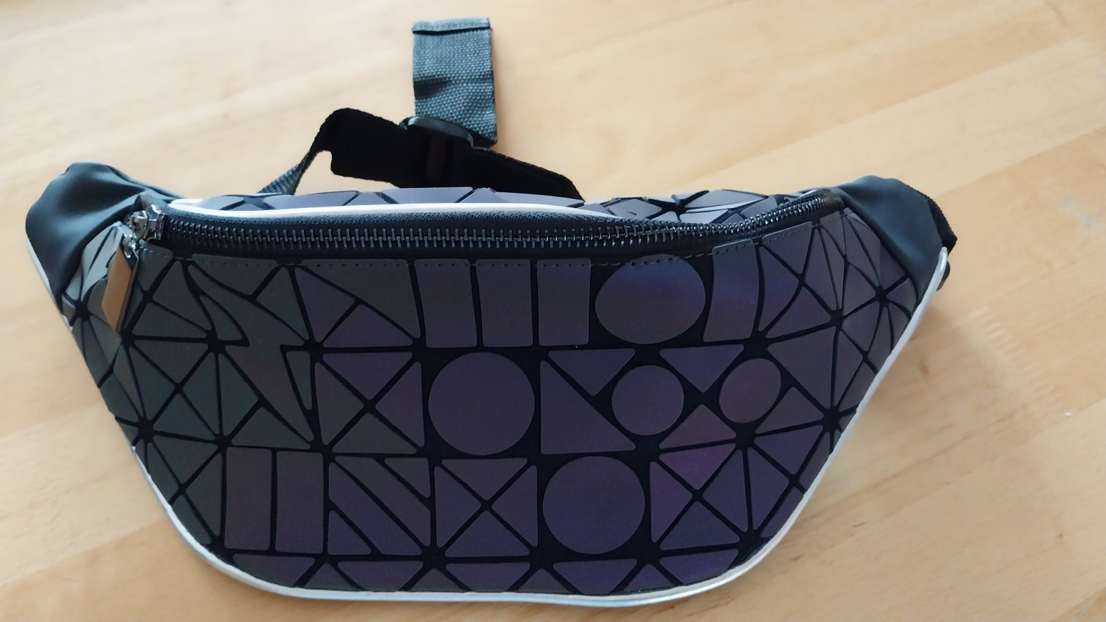 Ľadvinka Chameleón - dizajnová ľadvinky, ktorá meni farbu pri dopade svetla. Od šedej, cez fialovú až svietiacu. Sgeometrickými vzormi. S uzatváraním na zips, textilná podšívka, vo vnútri vrecko na zips, nastaviteľný popruh okolo pása so zapínaním na pracku, ale aj cez plece. Posledná fotografia - aj takto dokáže zmeniť farbu ak má maximálne svetlo (to je osvetlené a takto to svieti). V super stave, nenosím ju. Mala som ju párkrát