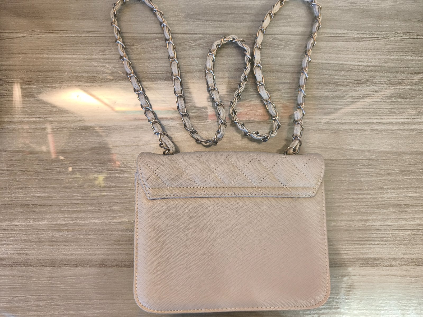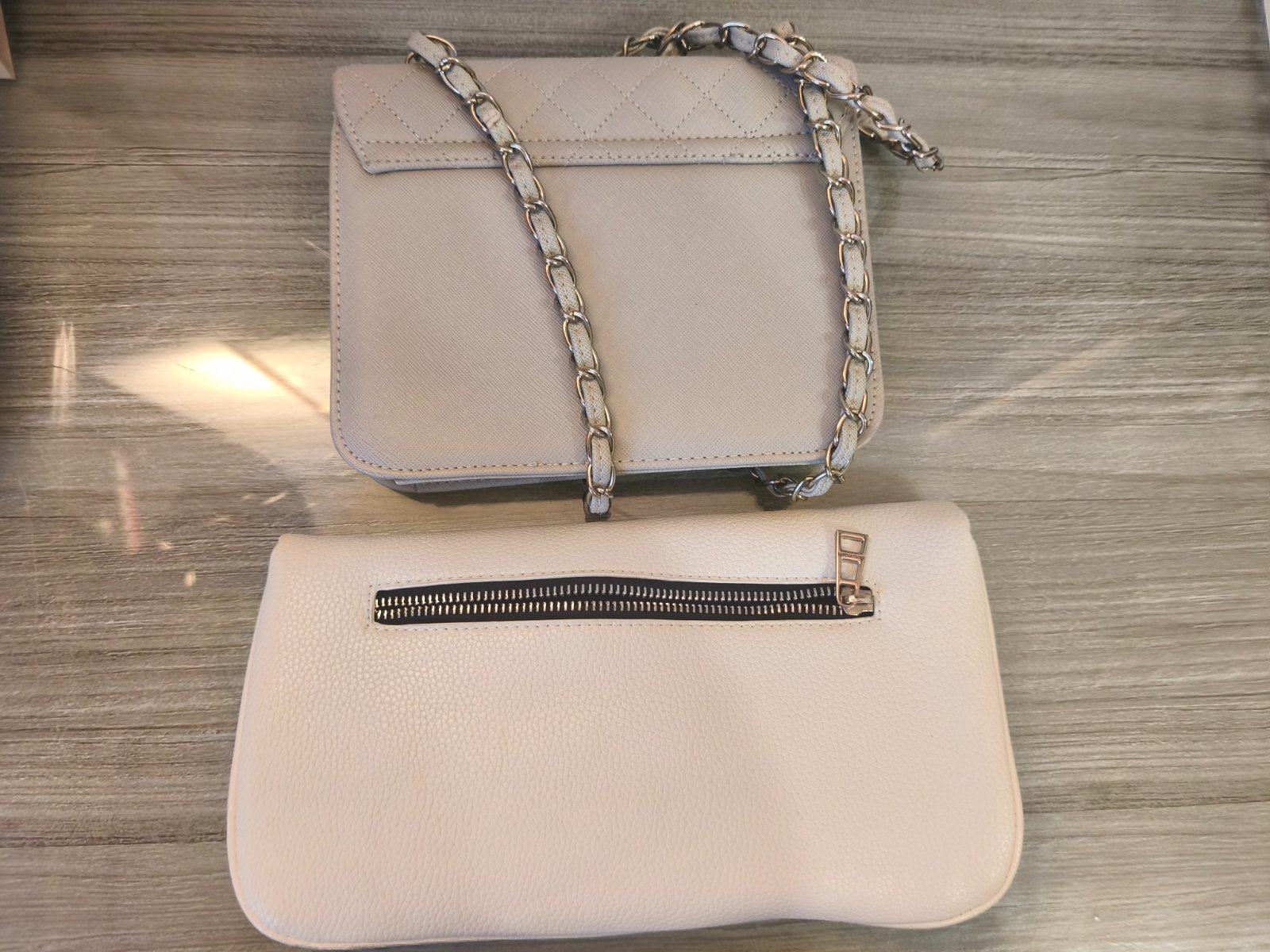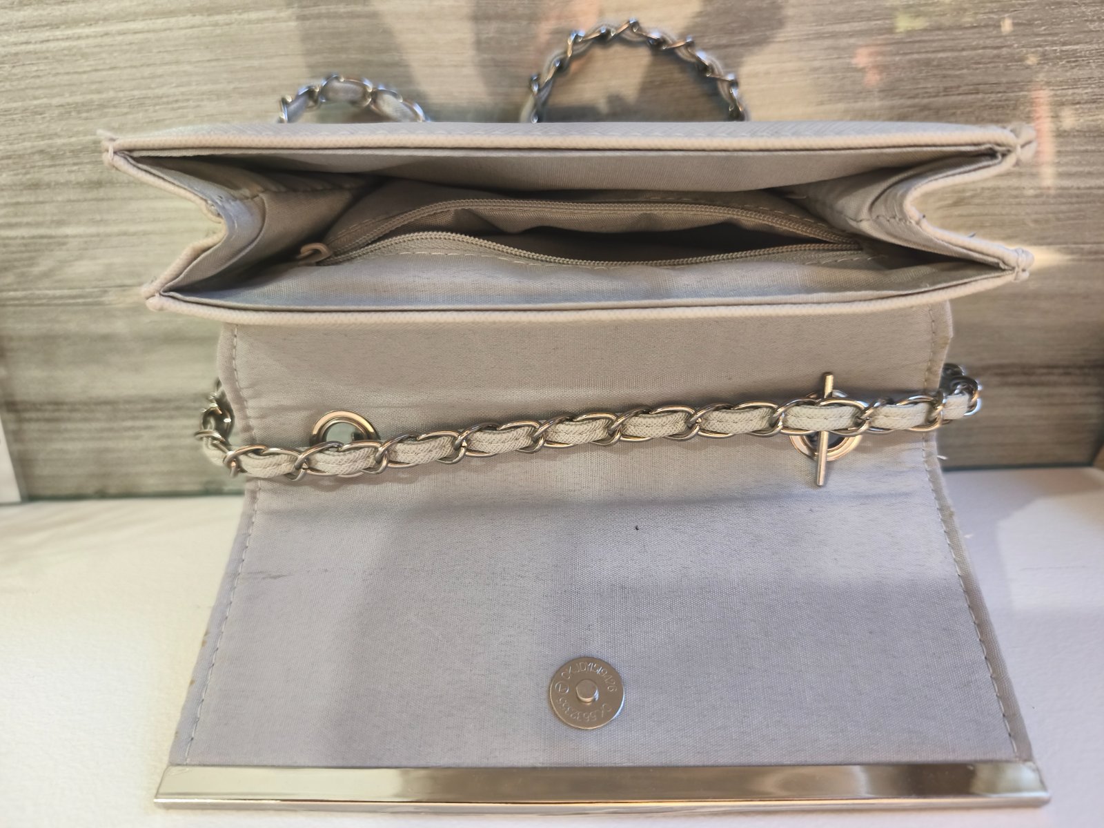 Menšia kabelka má zatváranie na patent, vnútornú priehradku bez zipsu a v nej menšiu priehradku na zips. Farba: svetlošedá