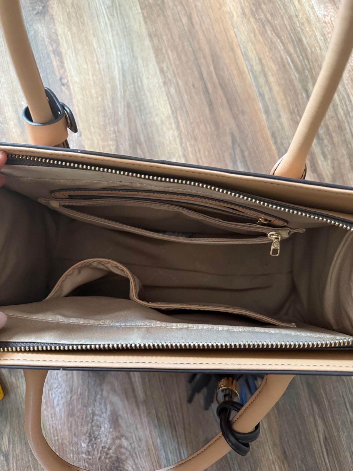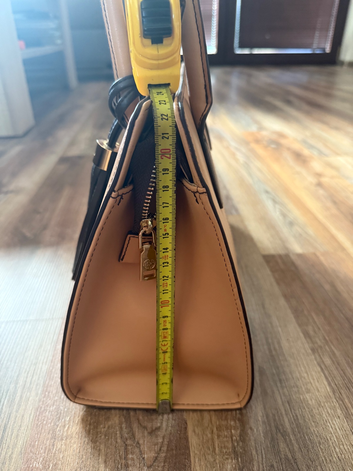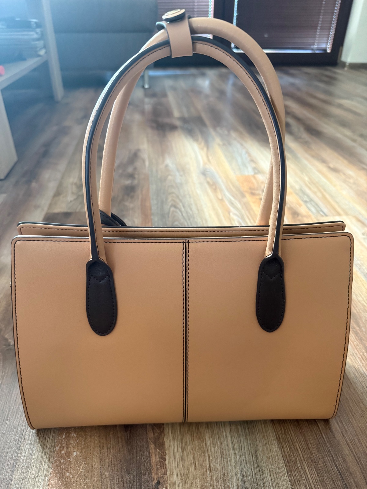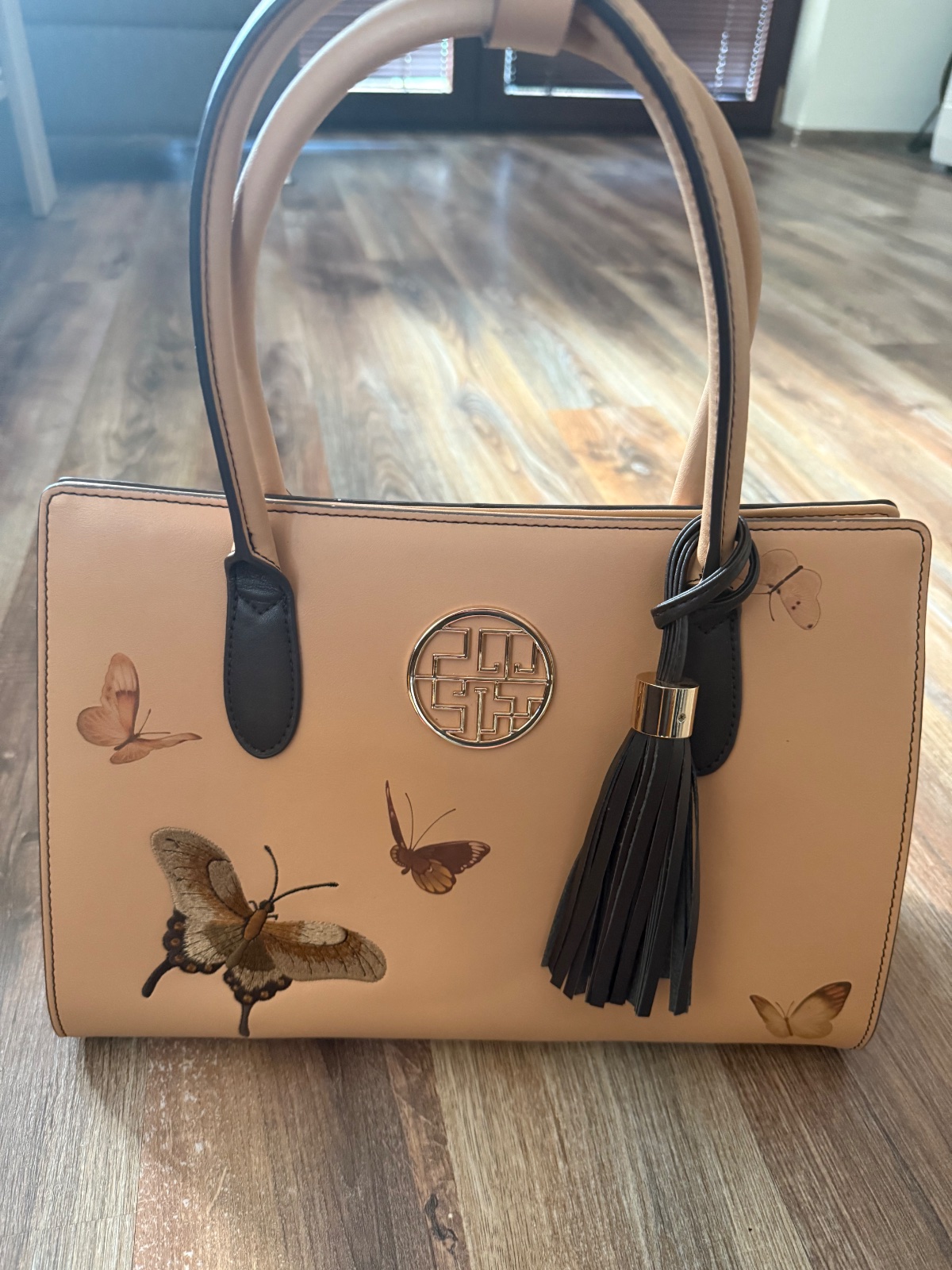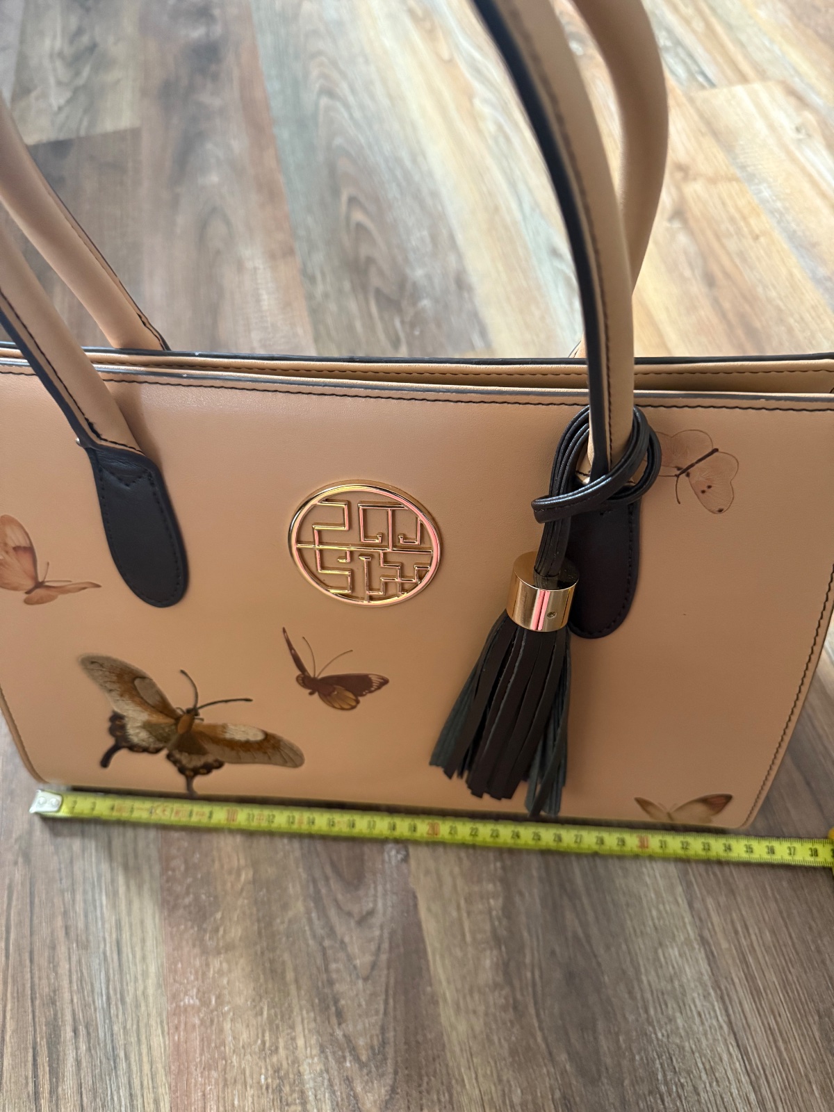 Nová nenosená samo stojaca kožená kabelka s aplikáciou motýľa a koženým príveskom. Vnútro má okrem jedného veľkého priestoru ešte štyri odkladacie vrecká.