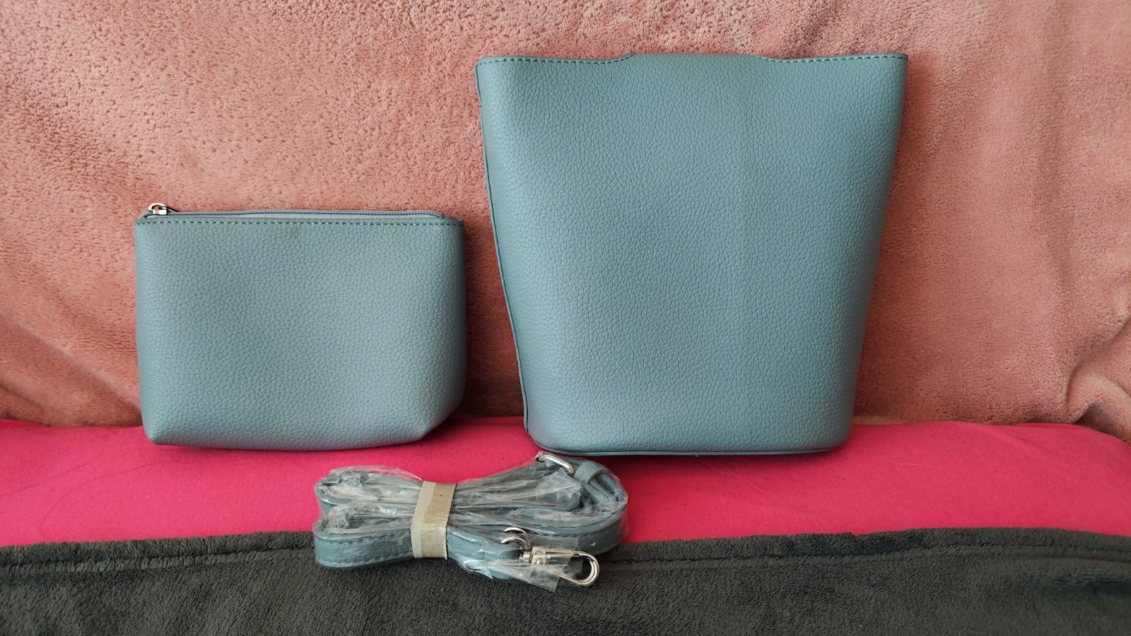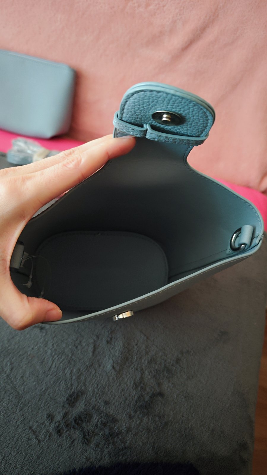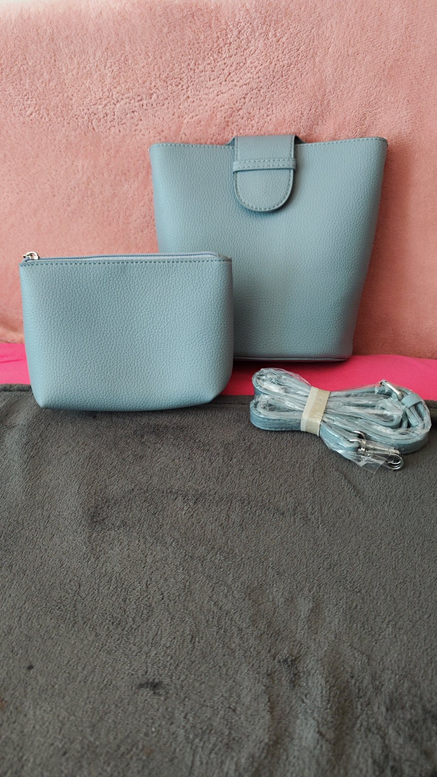 Top stav, ramienka použité neboli. Farebne je to niečo medzi šedou a bledomodrou. Rozmery väčšej kabelky: 19 x 21 cm.