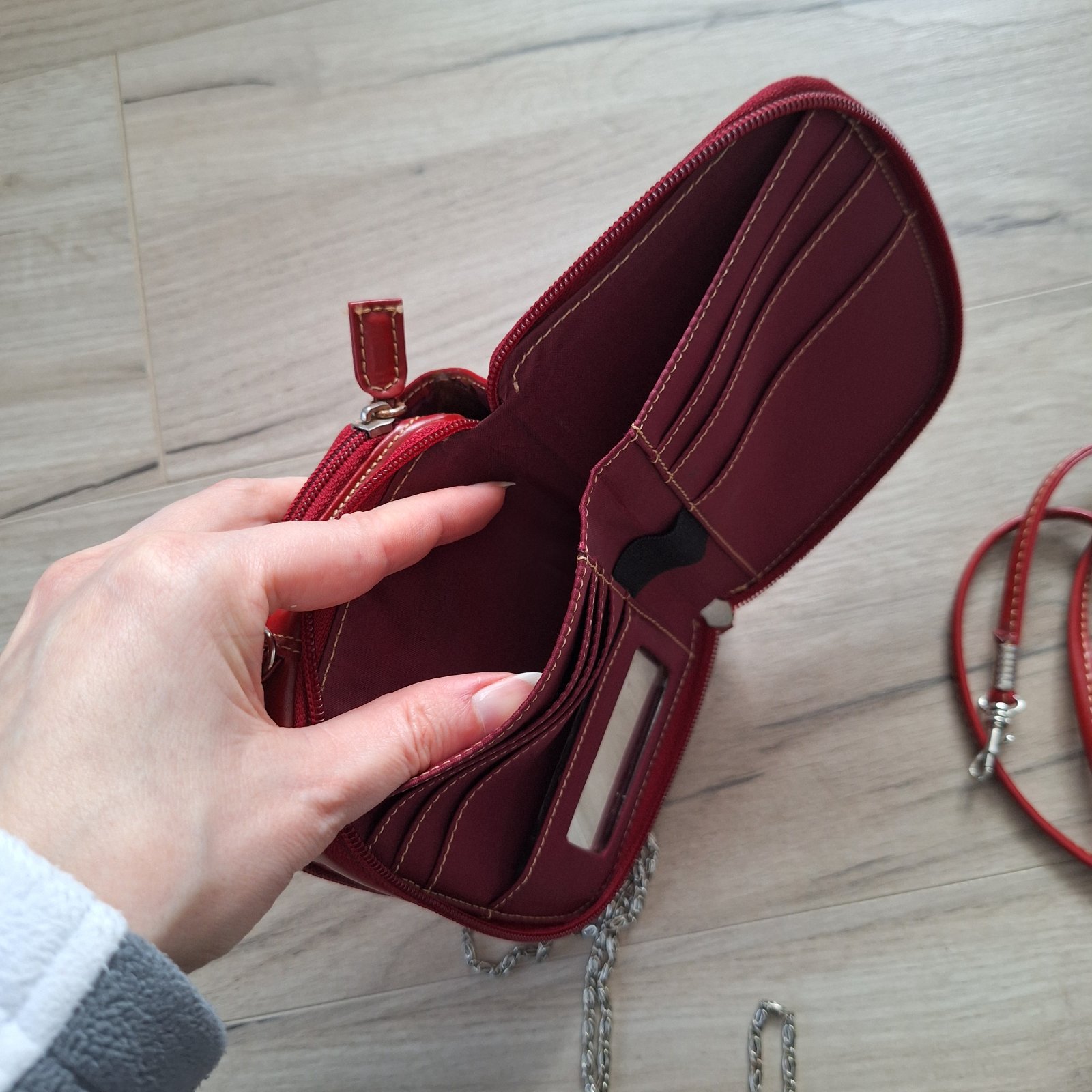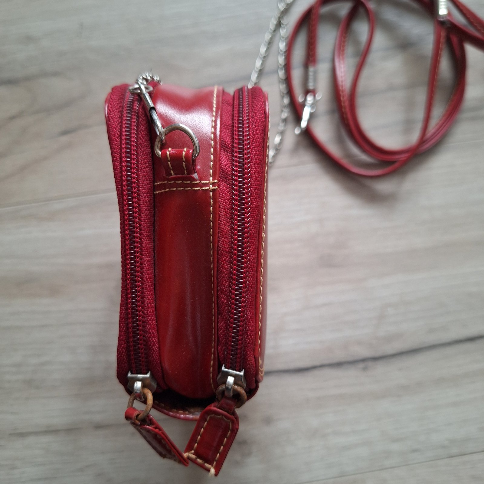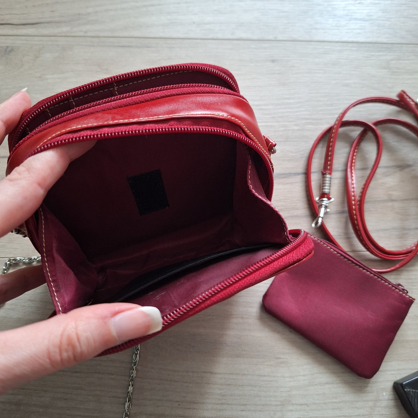 Malá kabelka s peňaženkou 2v1 + malá vyberacia peňaženka na mince. 2 ramienka - červené a retiazka.