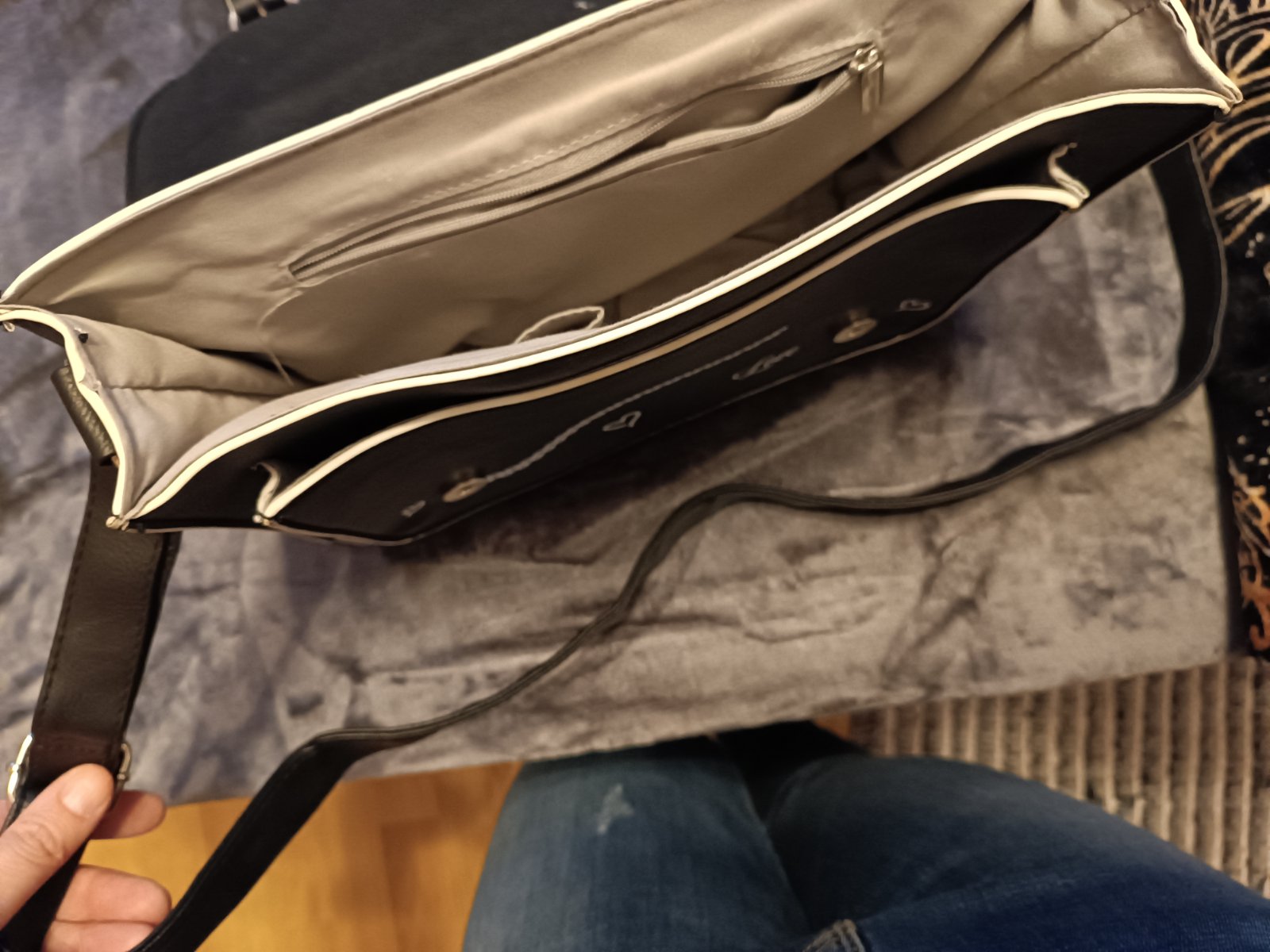 Predám čiernu kabelku na štýl aktovky. Pekné strieborné detaily, dlhý popruh, vnútri 2 priehradky, dve menšie vrecká + priehradka na zips. 1x vzatá. Kupovaná v Deichmanne.