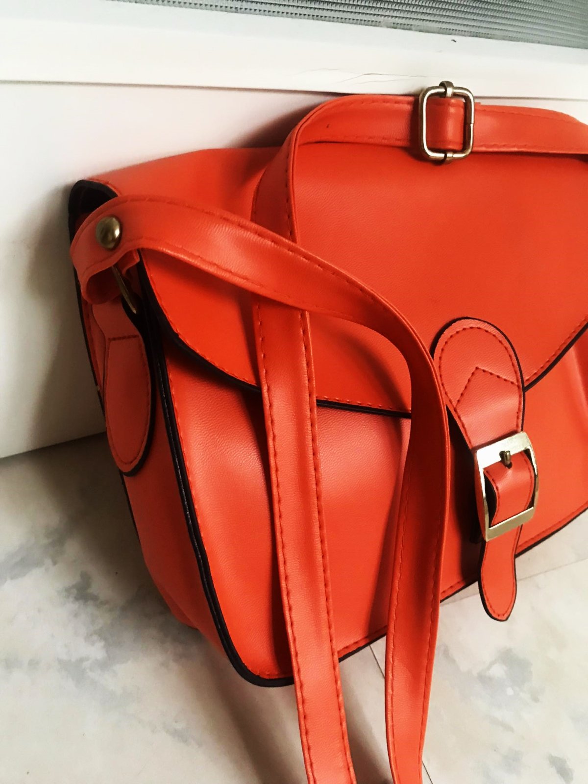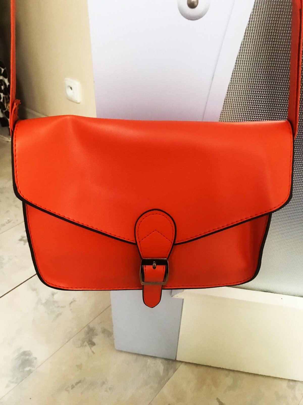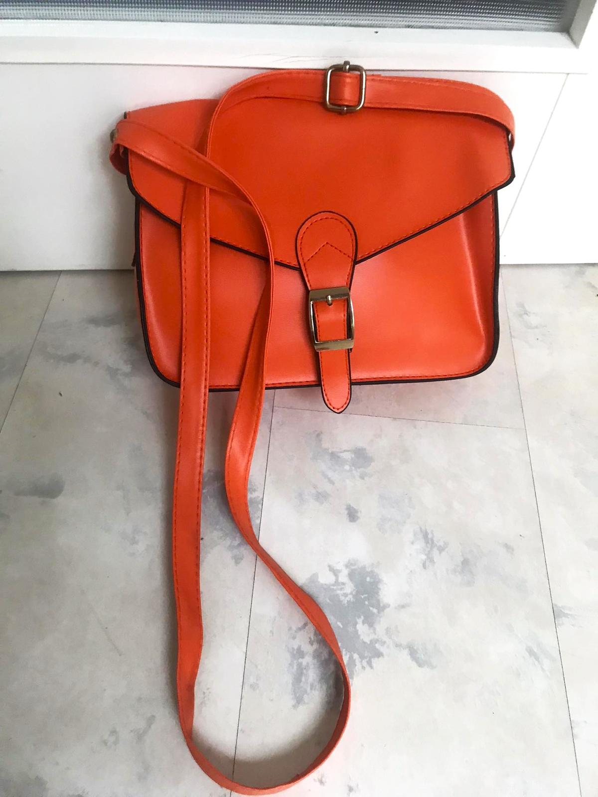 kabelka cros body,krásna farba - sýta lososová /oranžovo tehlová farba, 25 x 19 cm,syntetika, na vnút. stranách rúčky sú fleky,ktoré však pri nosení nie je vidno...ale upozorňujem....