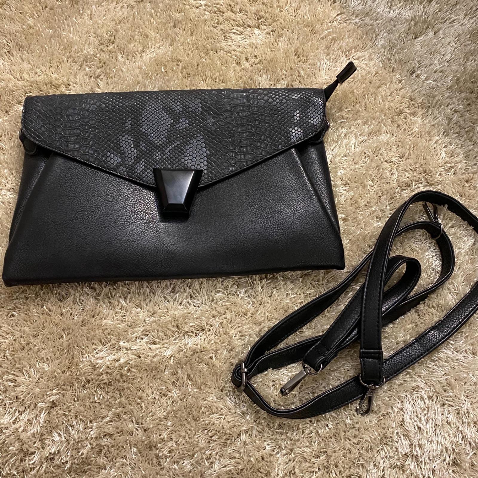 Čierna listová / crossbody kabelka. Pevný materiál, drží tvar. Vnútro rozdelené na viac priehradok.