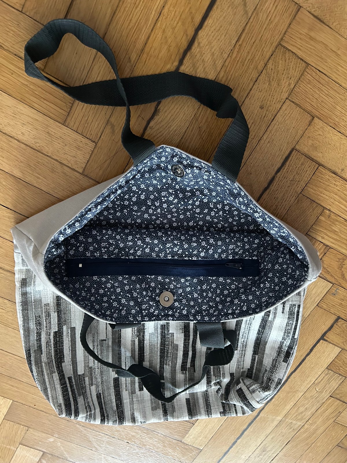 taška zo zrebného plátna, podšitá, vo vnútri vrecko na zips, zapínie taška na cvok