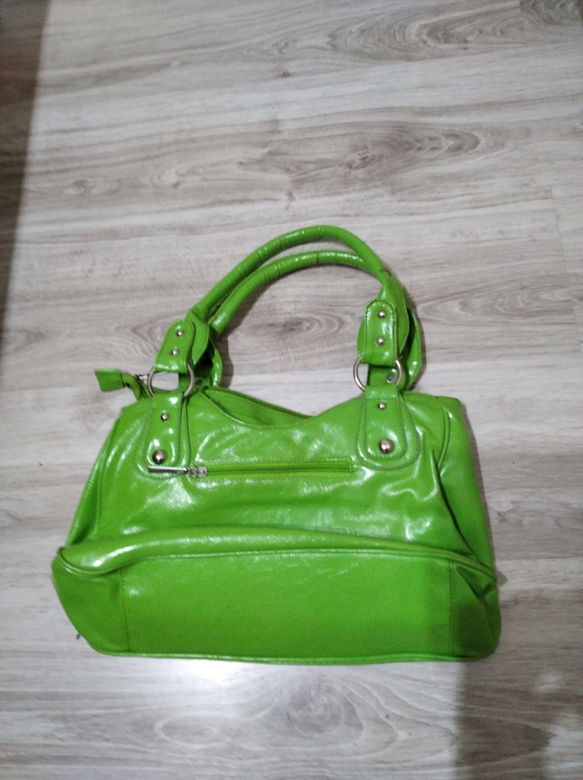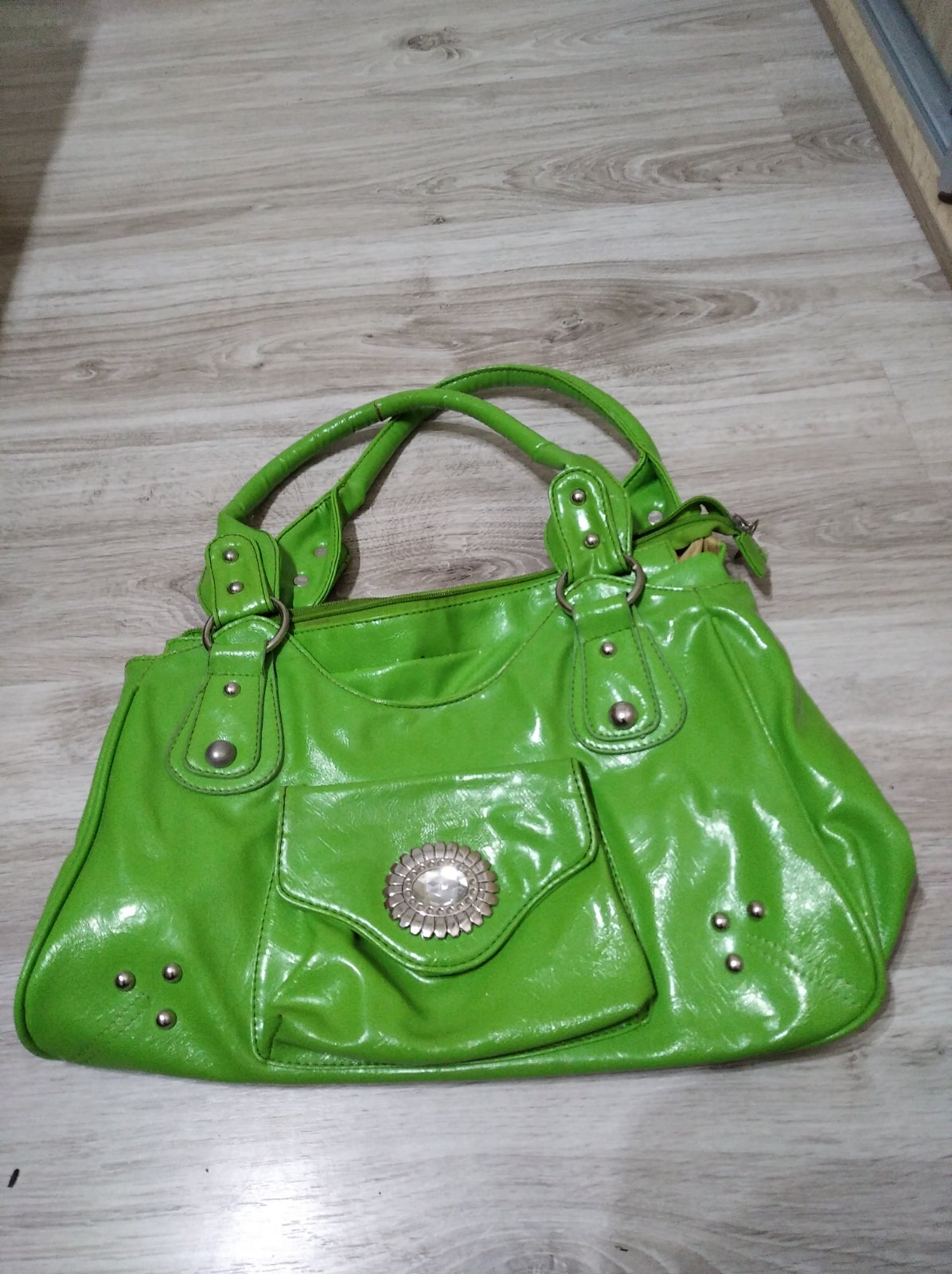 Predám zelenú kabelku. Veľkosť : šírka 38cm - výška 44cm s rúčkami. Treba vymeniť stredný zips a na jednej rúčke je prasknutá koža.