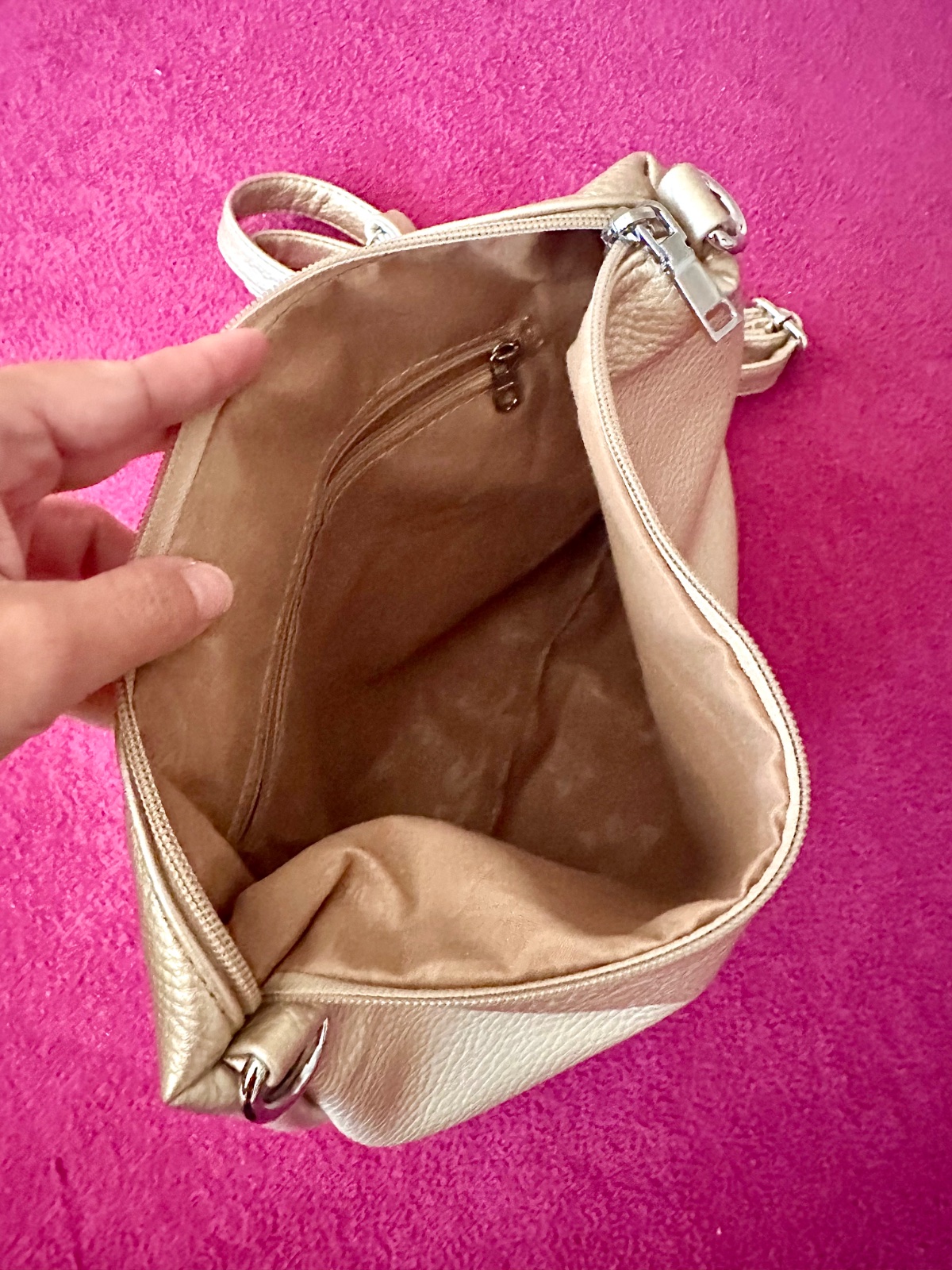 Predám novú kabelku zlatej farby v top stave. Je veľmi praktickej veľkosti, má dlhý nastaviteľný popruh. Zapína sa na zips a vnútri má ďalšie vrecko so zipsom.