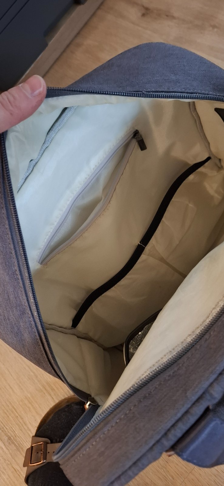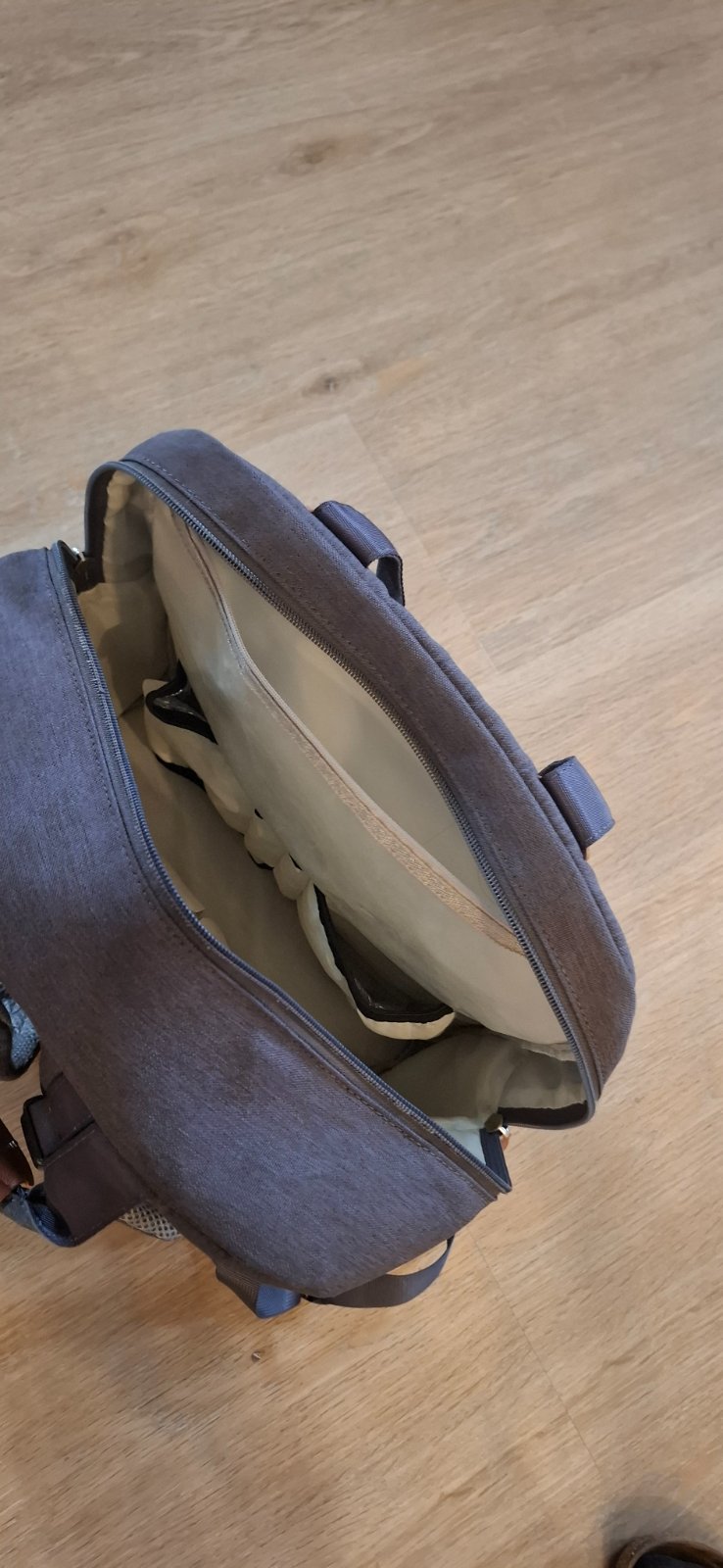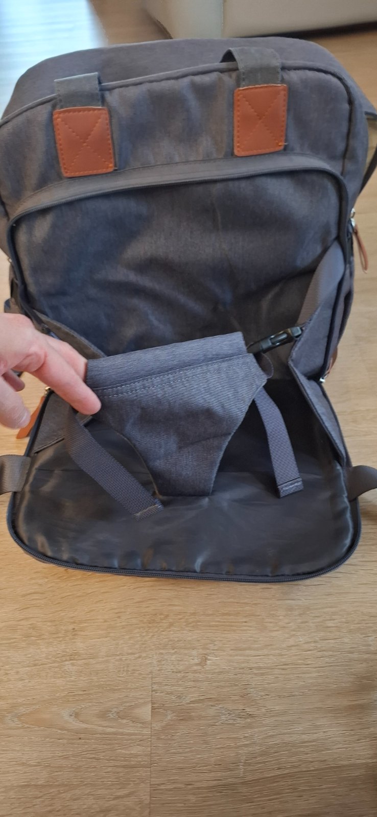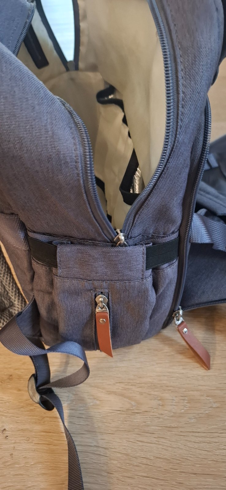 Velmi sikovny mamickovsky batoh s mnozstvom vrecusok.Hlavny priestor s dvoma zipsovatelnymi vrecuskami, jedno dokonca nepremokave, dalsimi priehradkami aj 2 termo drziakmi na flase. Stredna cast ma aj textilne drziaky na pomocne sedenie pre babetko, v predu mala priehradka na suchy zips.