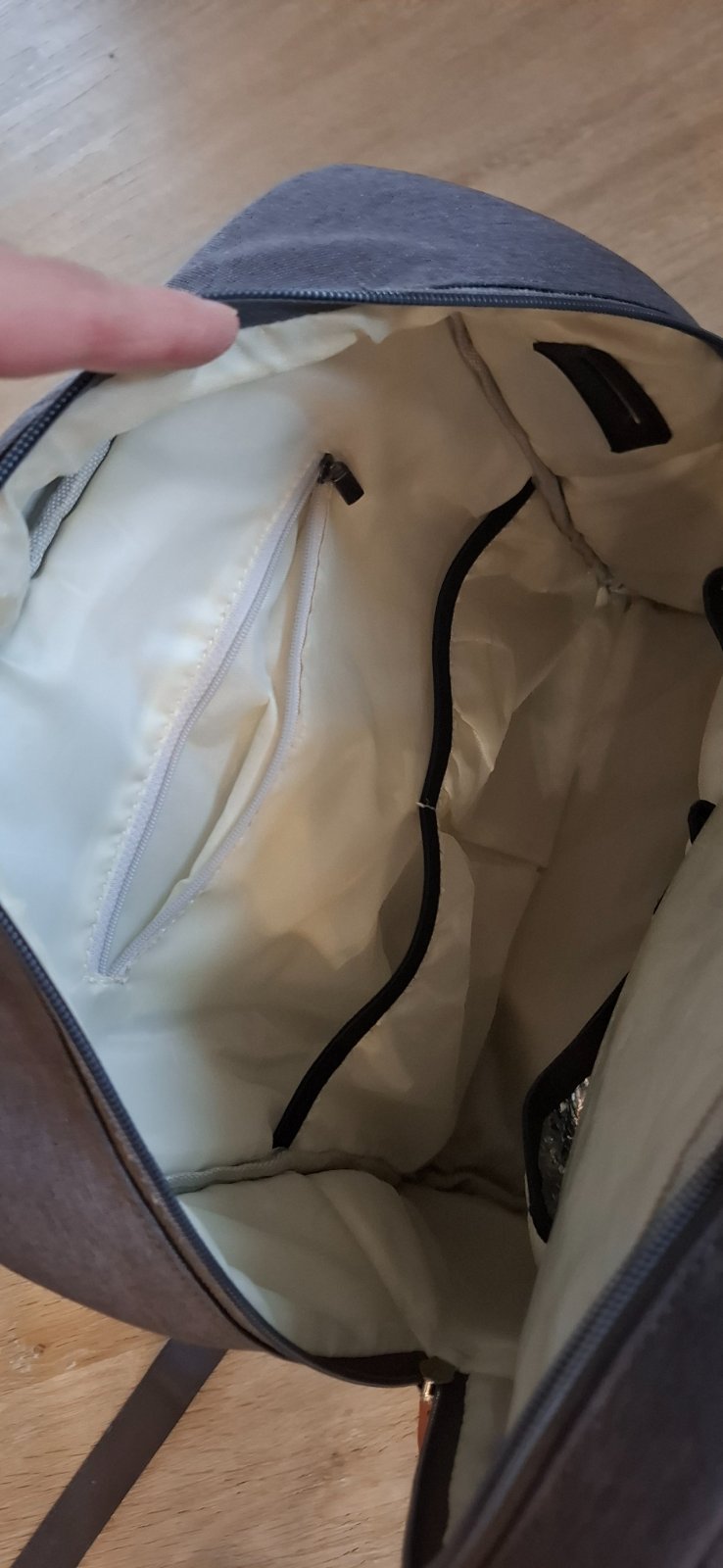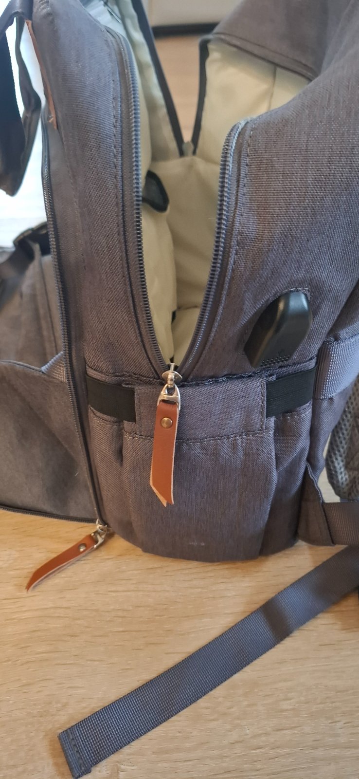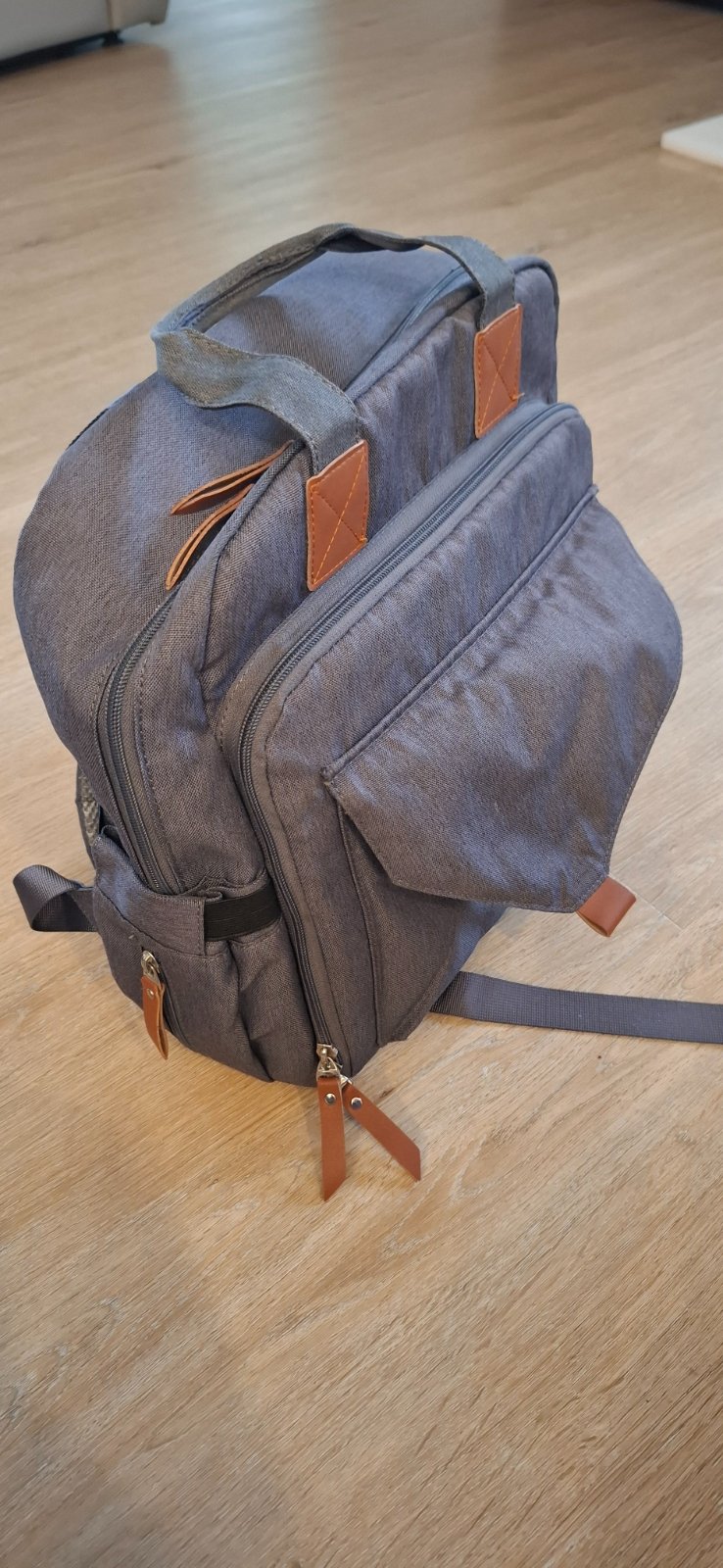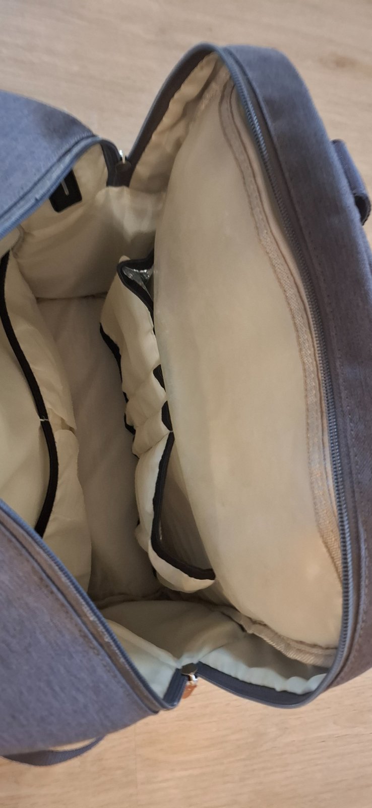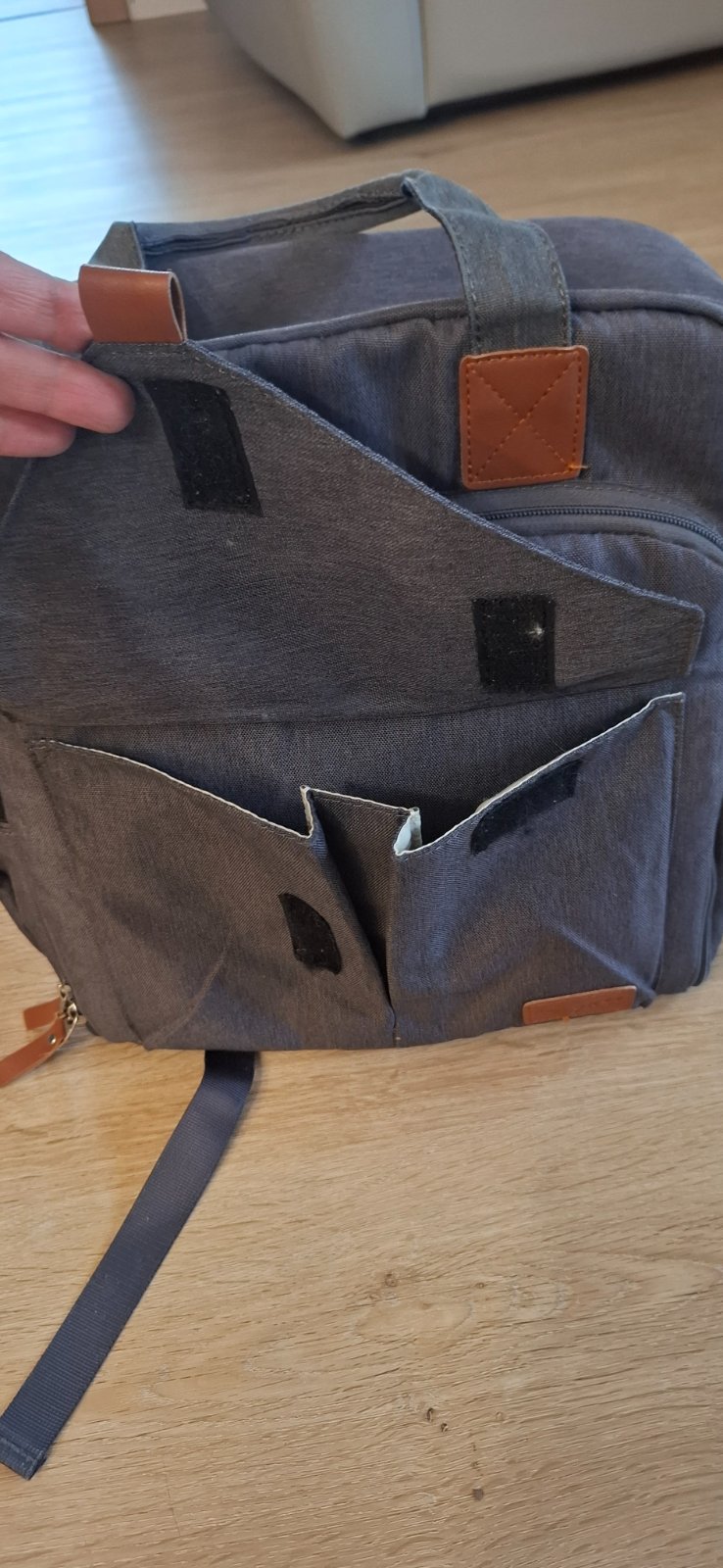 Velmi sikovny mamickovsky batoh s mnozstvom vrecusok.Hlavny priestor s dvoma zipsovatelnymi vrecuskami, jedno dokonca nepremokave, dalsimi priehradkami aj 2 termo drziakmi na flase. Stredna cast ma aj textilne drziaky na pomocne sedenie pre babetko, v predu mala priehradka na suchy zips.