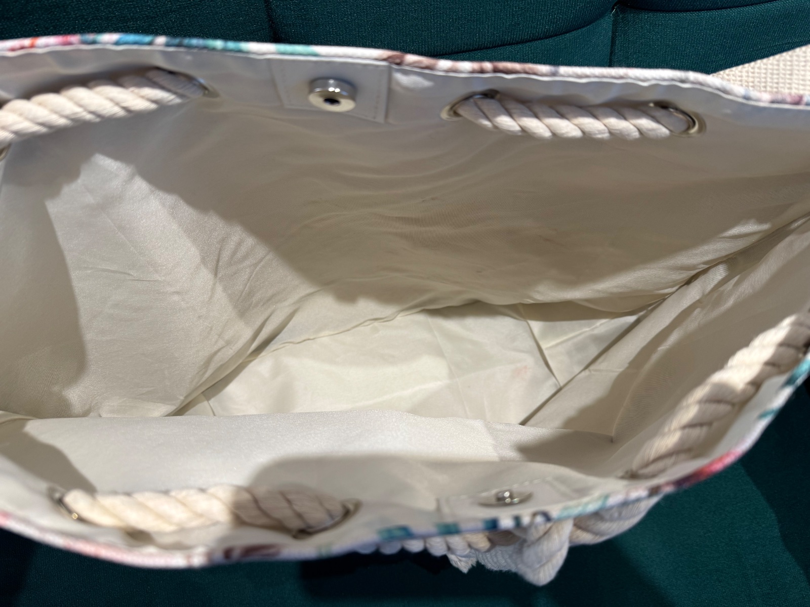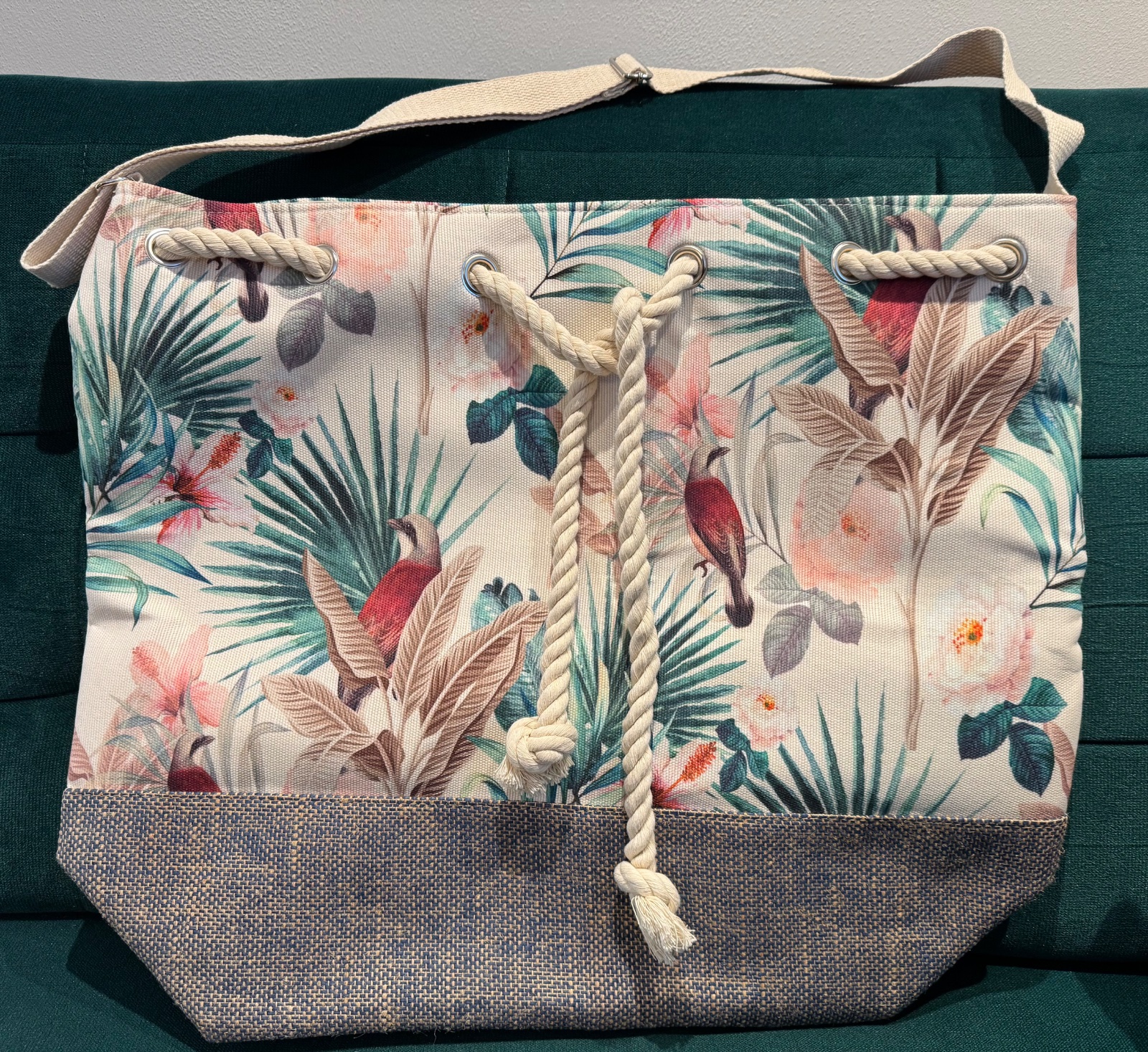 Predám veľmi málo nosenú veľkú plážovú tašku s kvetinovými vzorom. Má jedno ramienko a cvoku na zapínanie. Na spodnej časti má spevnenie. Vo vnútri je od kúpy jemný ružový fliačik.