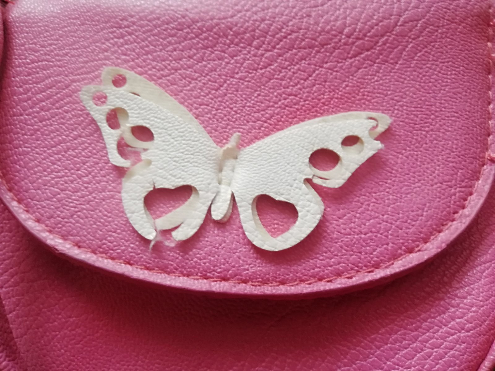 Predam peknu malu kabelku pre skolkarky. Motýlik je troska vpredu roztrhnúty, inak pekny pouzivany stav. To si viete aj prelepiť. Na ramienka je zapinanie, da sa rozopnut.