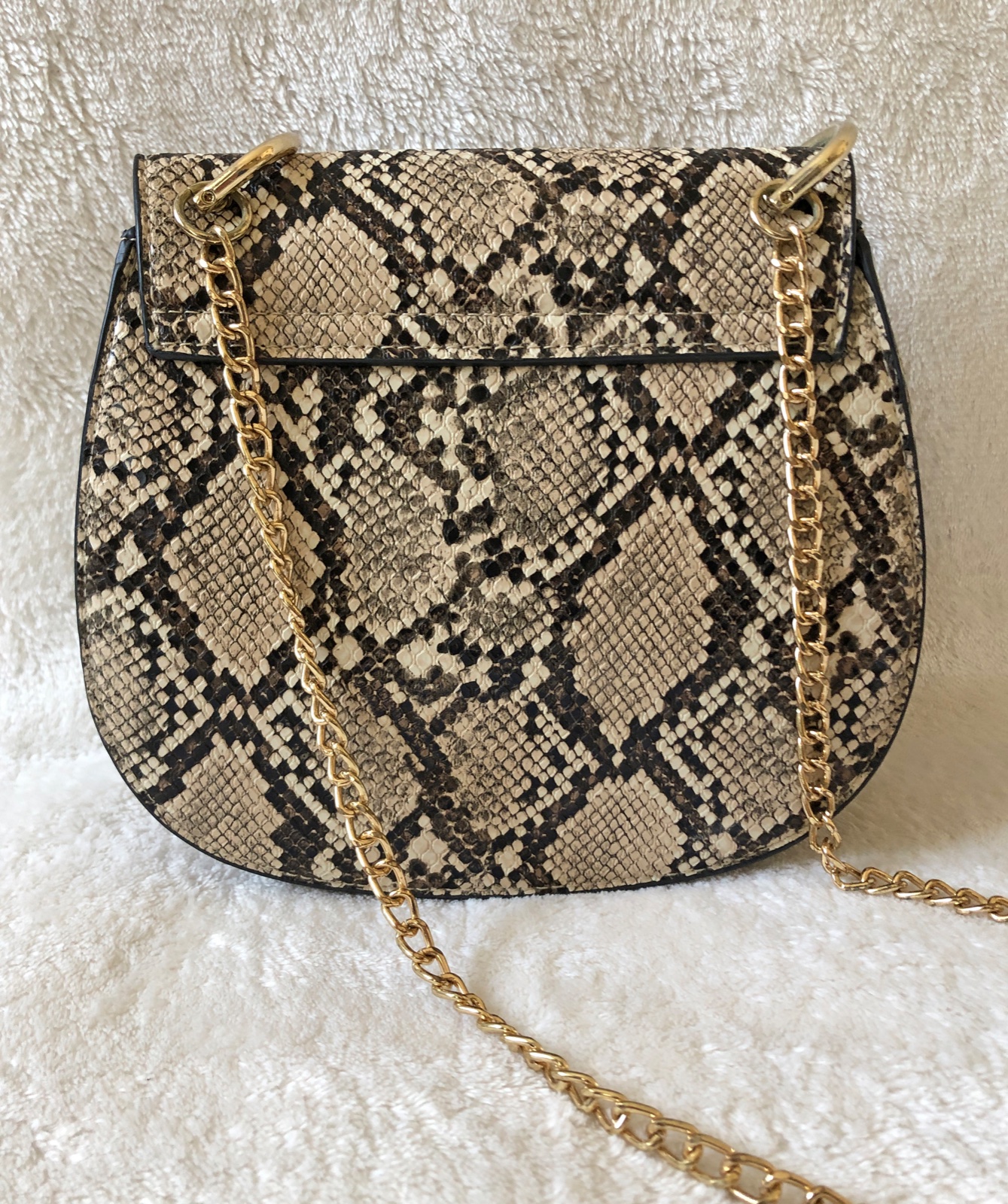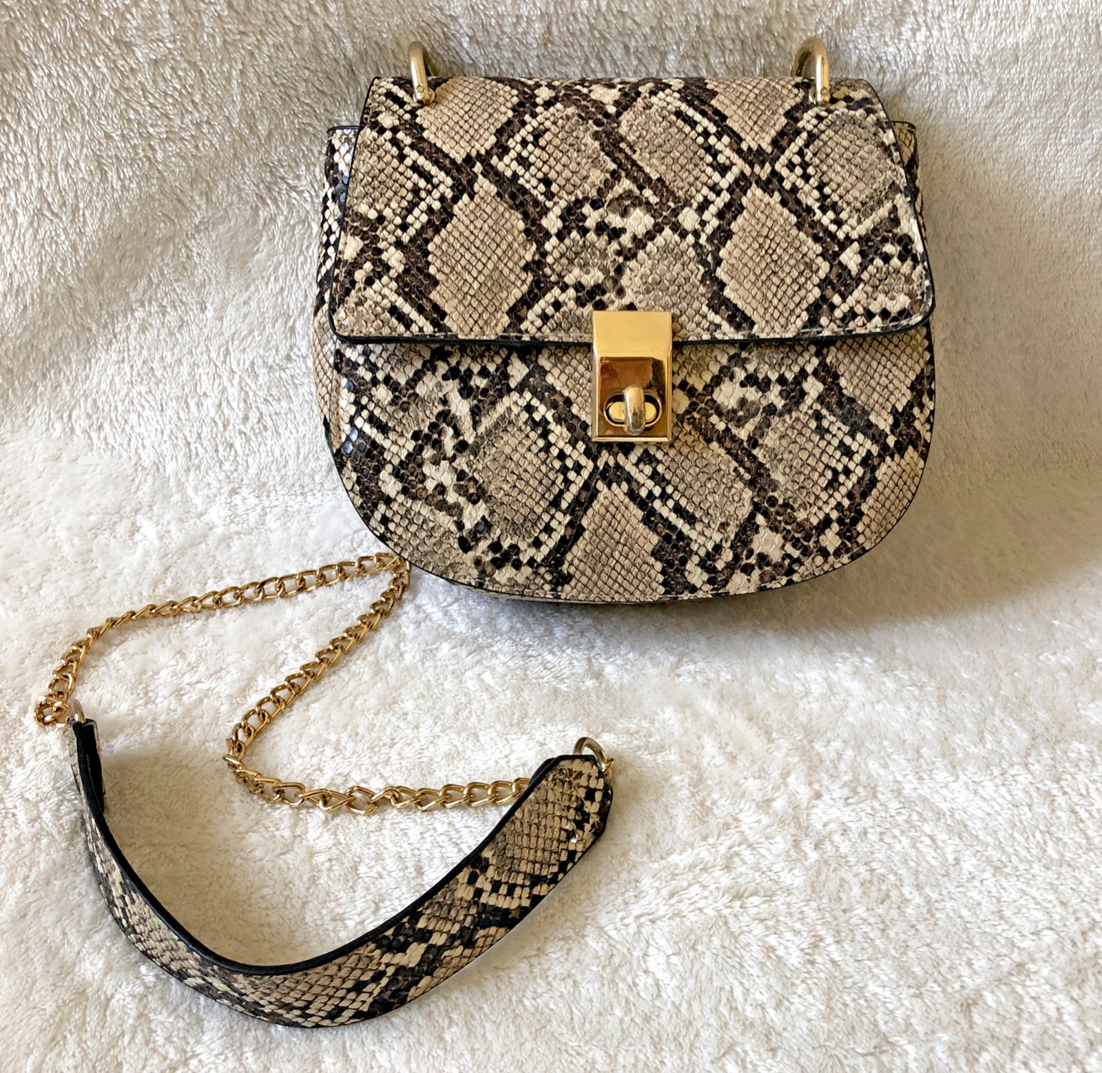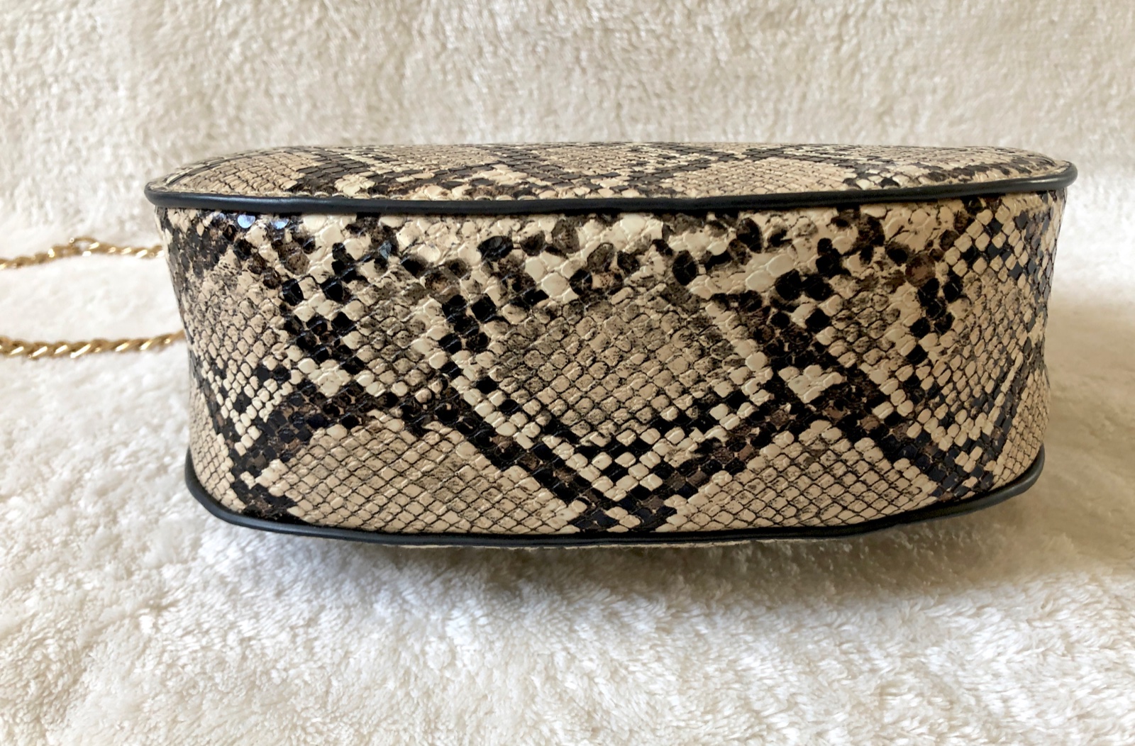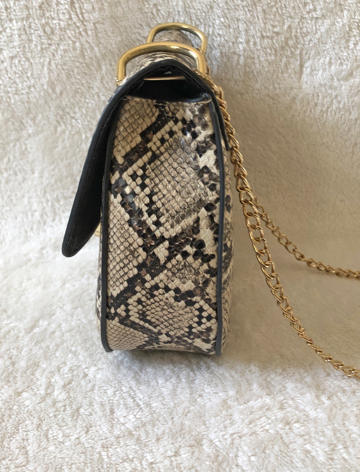 Štýlová kabelka v imitácii pytónej kože so zlatými kovovými prvkami (zapínanie, retiazka). Minimálne použitie, v super stave, bez poškodení.