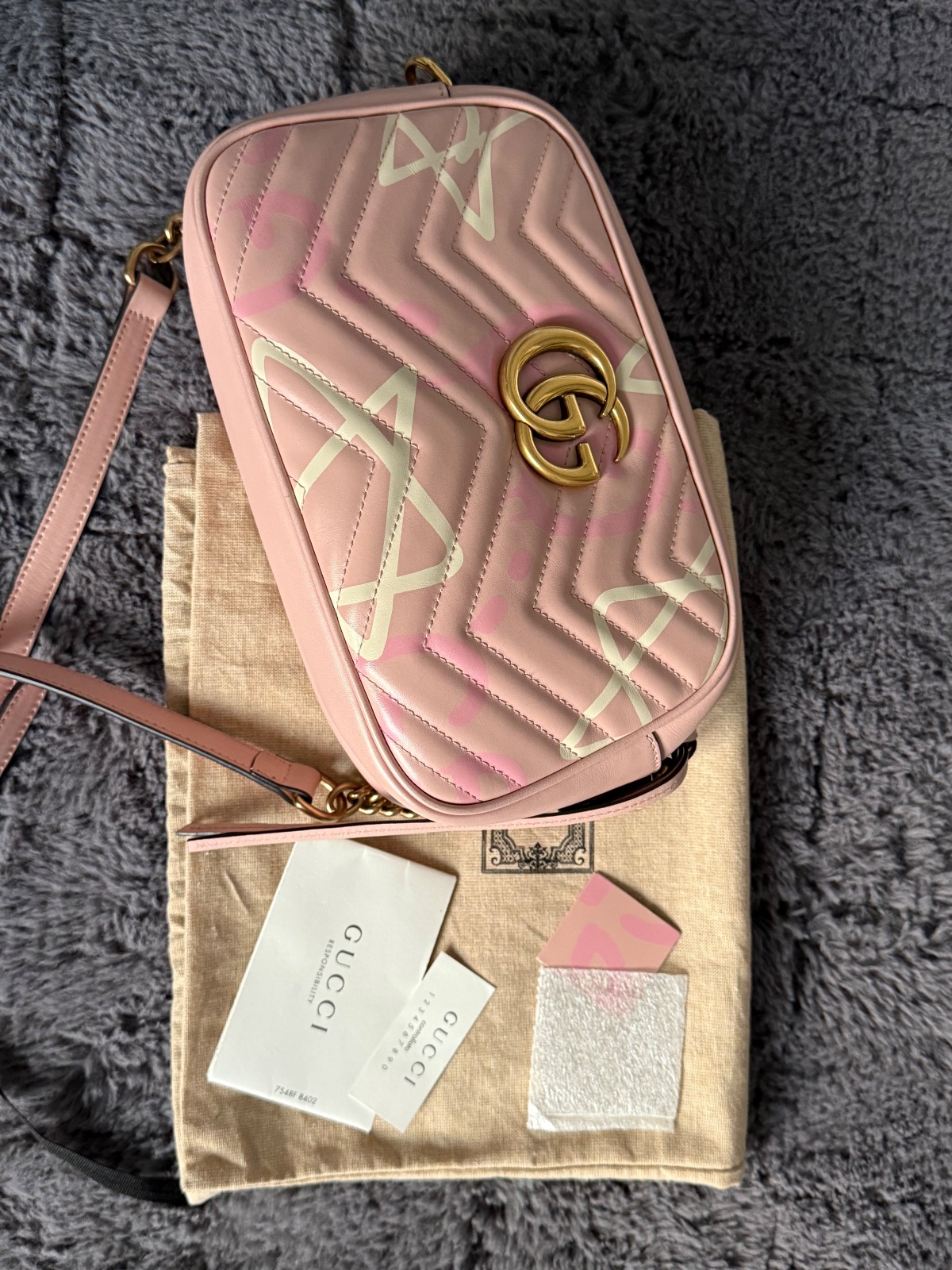 Krásna crossbody kabelka Gucci GG Marmont Ghost z ružovej kože matelassé. Bežné známky nosenia, bez vážneho poškodenia. Mini zadretie na poslednej foto. Komplet balenie ako na foto.