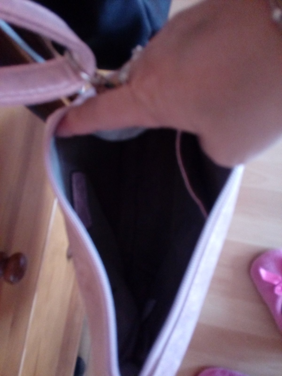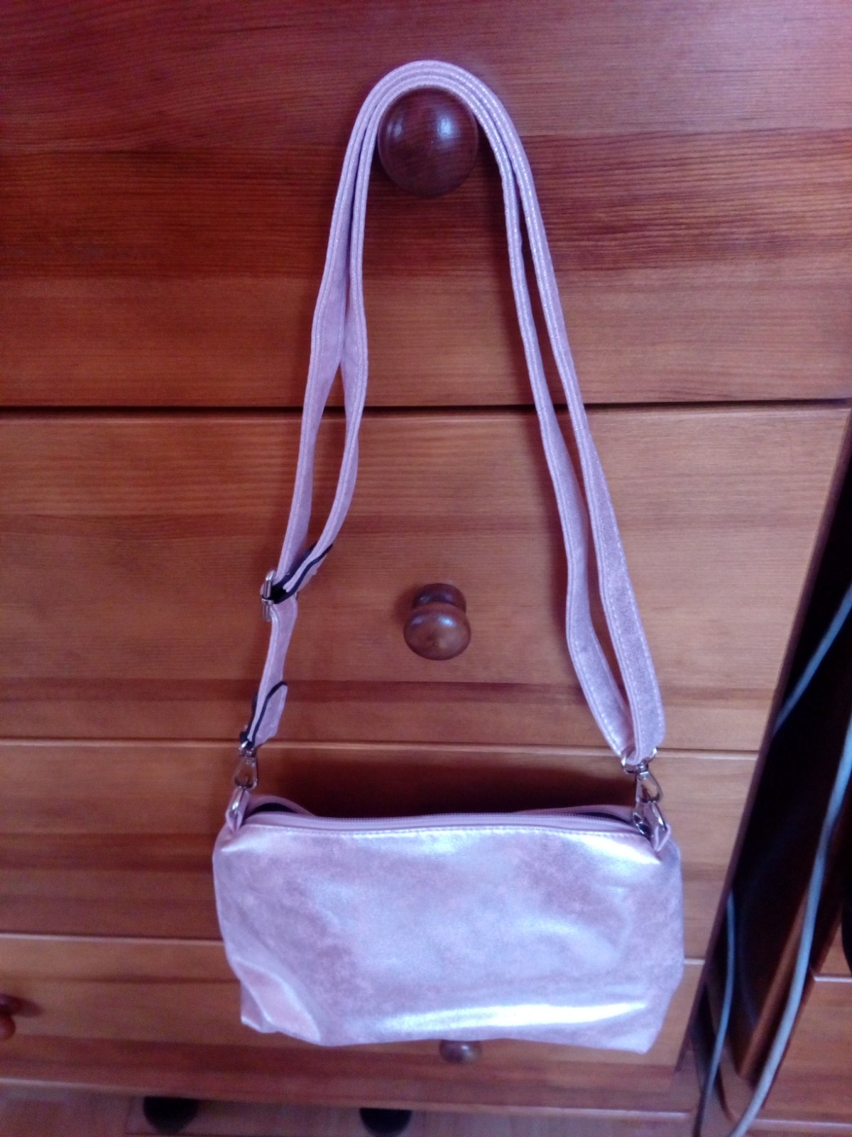 Bledoruzova kabelka so striebornym povrchom,rozmery 30x17x9cm,rucka 67cm dvojmo