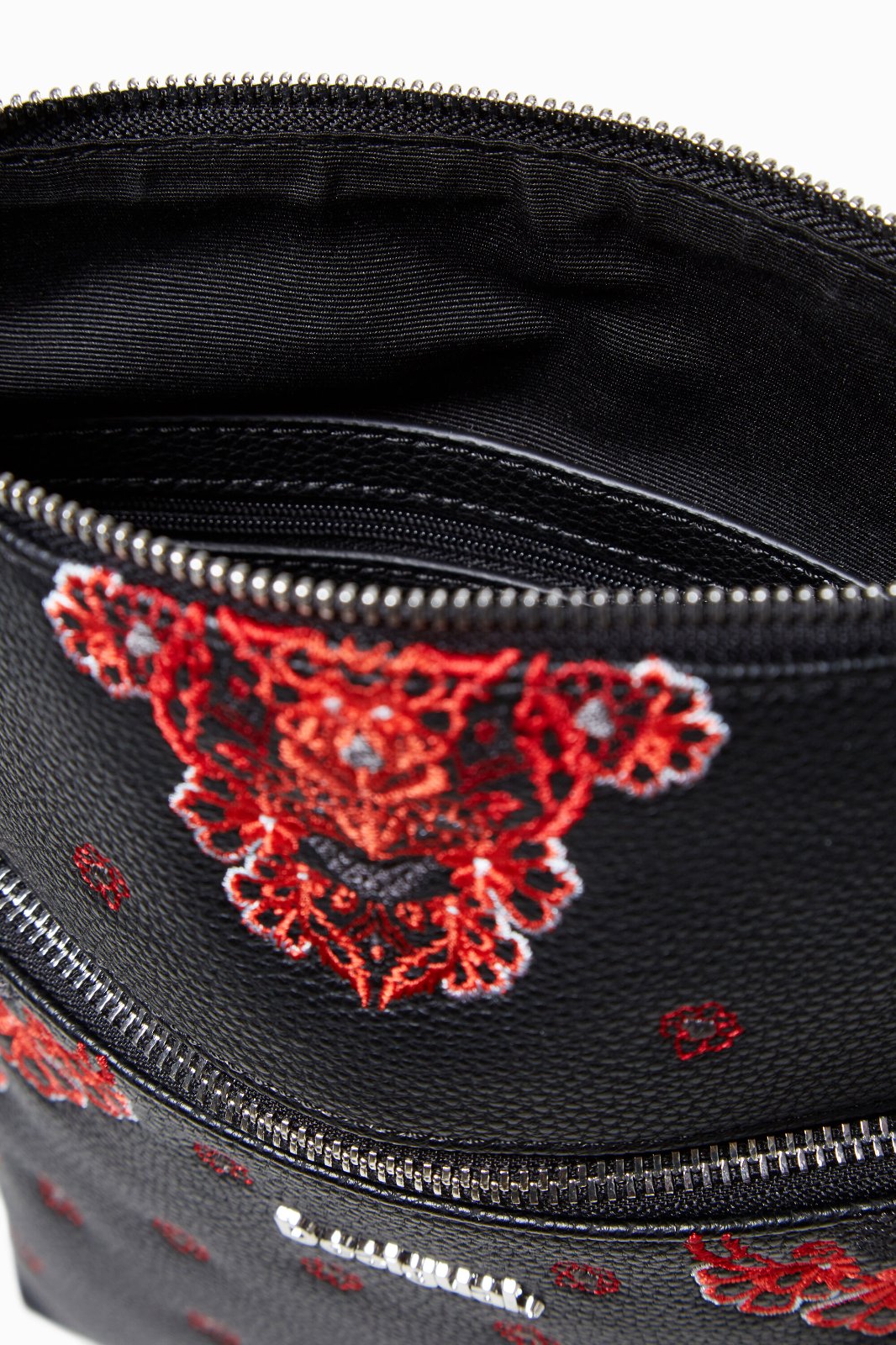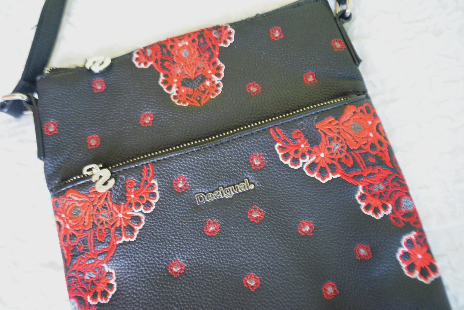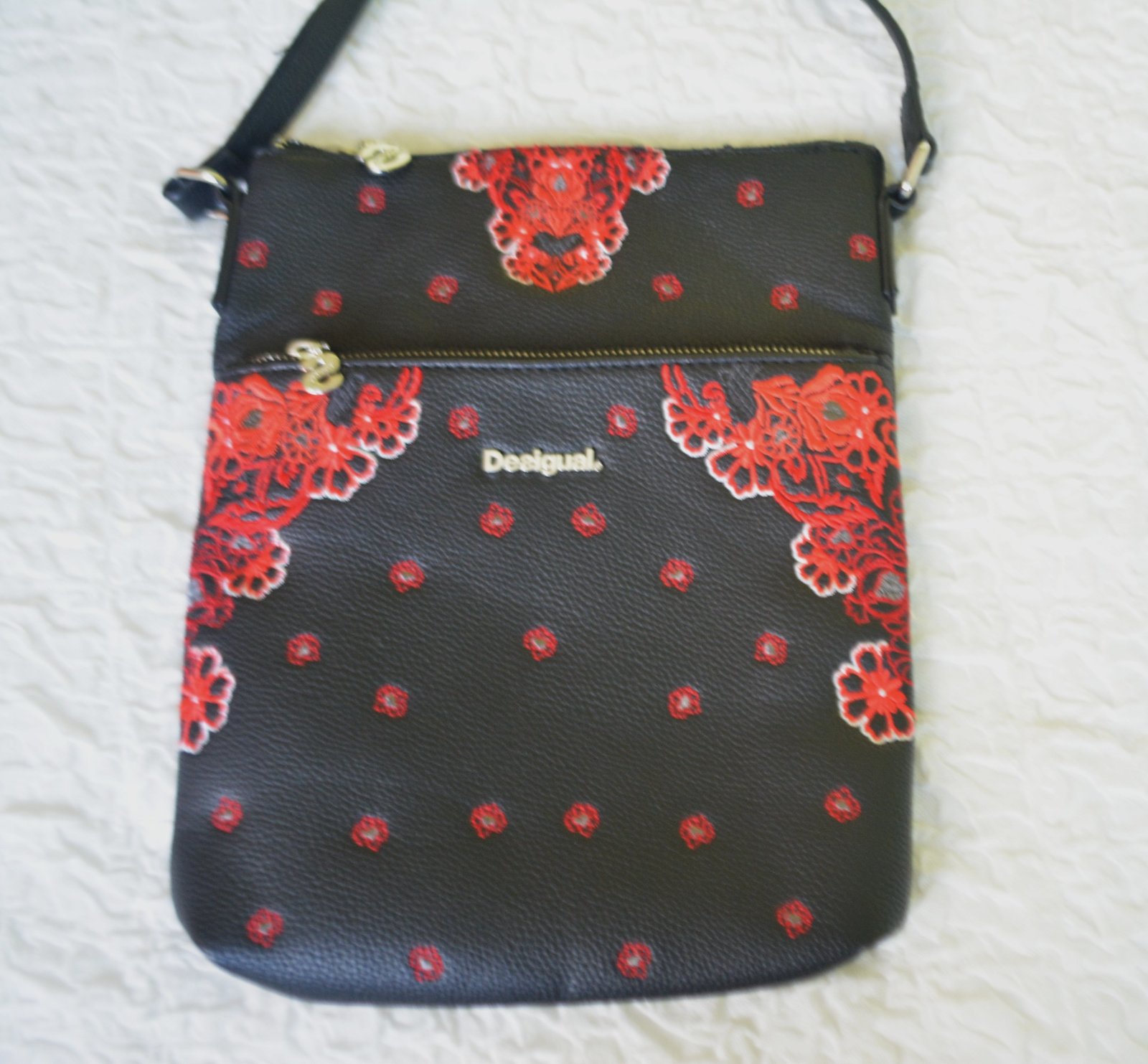 Elegantná dámska crossbody kabelka Manuela Foulard Ghana s červenými výšivkami od značky Desigual. Túto kabelku si doslova zamilujete.