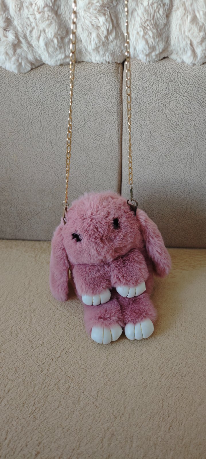 Predám rozkošnú, plyšovéhú trendy kabelku v tvare zajačika, ktorý sa dá nosiť aj ako ruksak/batôžtek, v ružovej farbe s retiazkovým popruhom. Poslúži napríklad aj ako plyšák/hračka alebo do vlaku/auta aj ako vankúšik.
